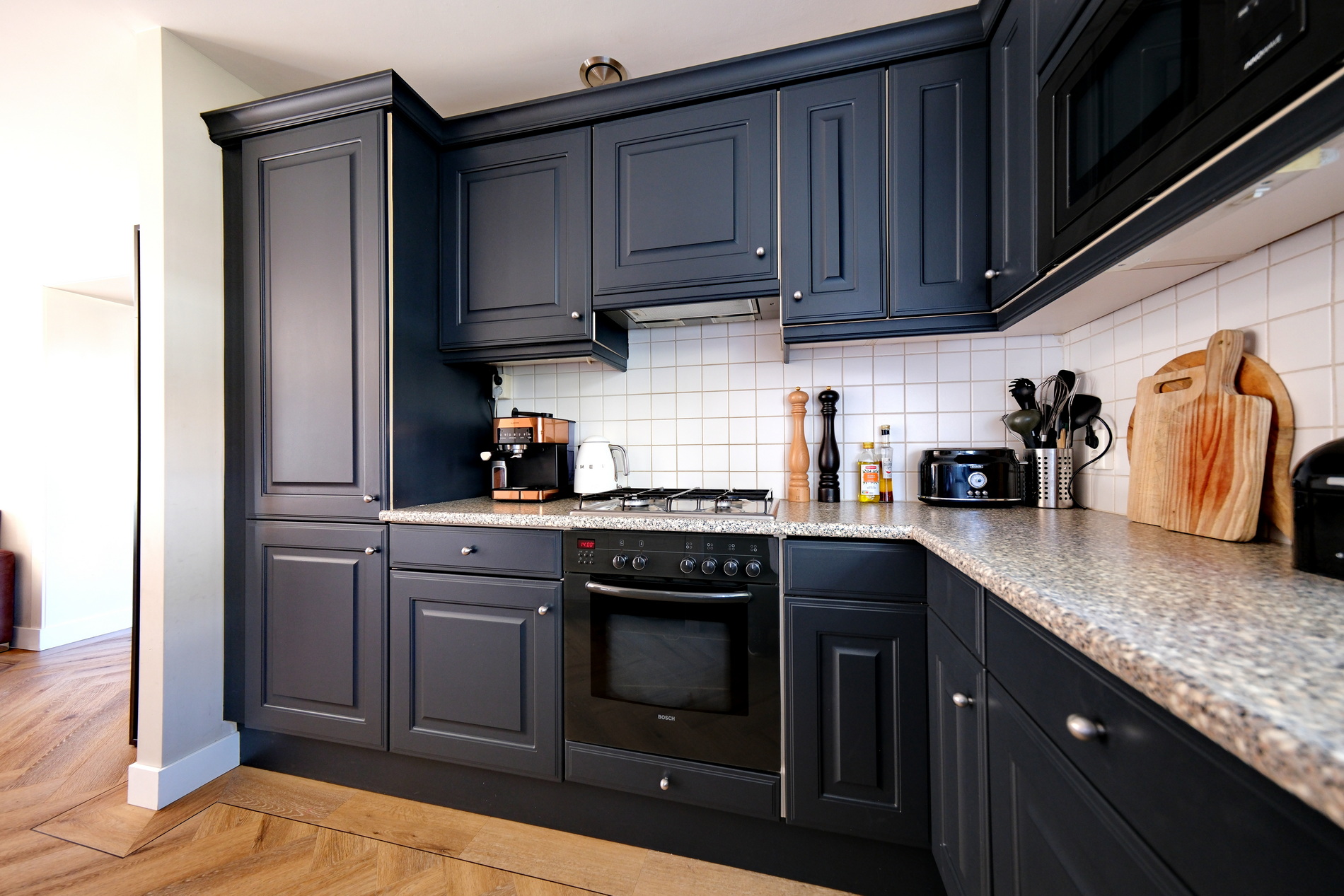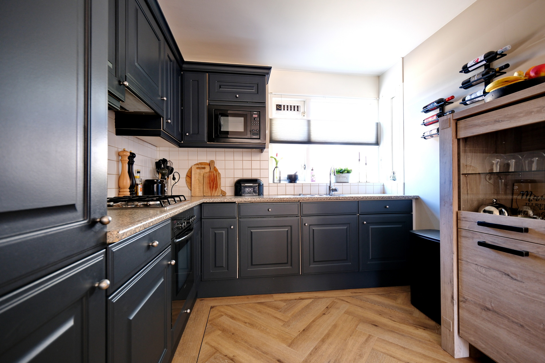 De keuken is uitgerust met een gaskookplaat, afzuigkap, koel/vriescombinatie, vaatwasser, oven en magnetron. Er is volop bergruimte dankzij de vele kasten en lades. Vanuit het keukenraam vrij uitzicht op het straatbeeld.