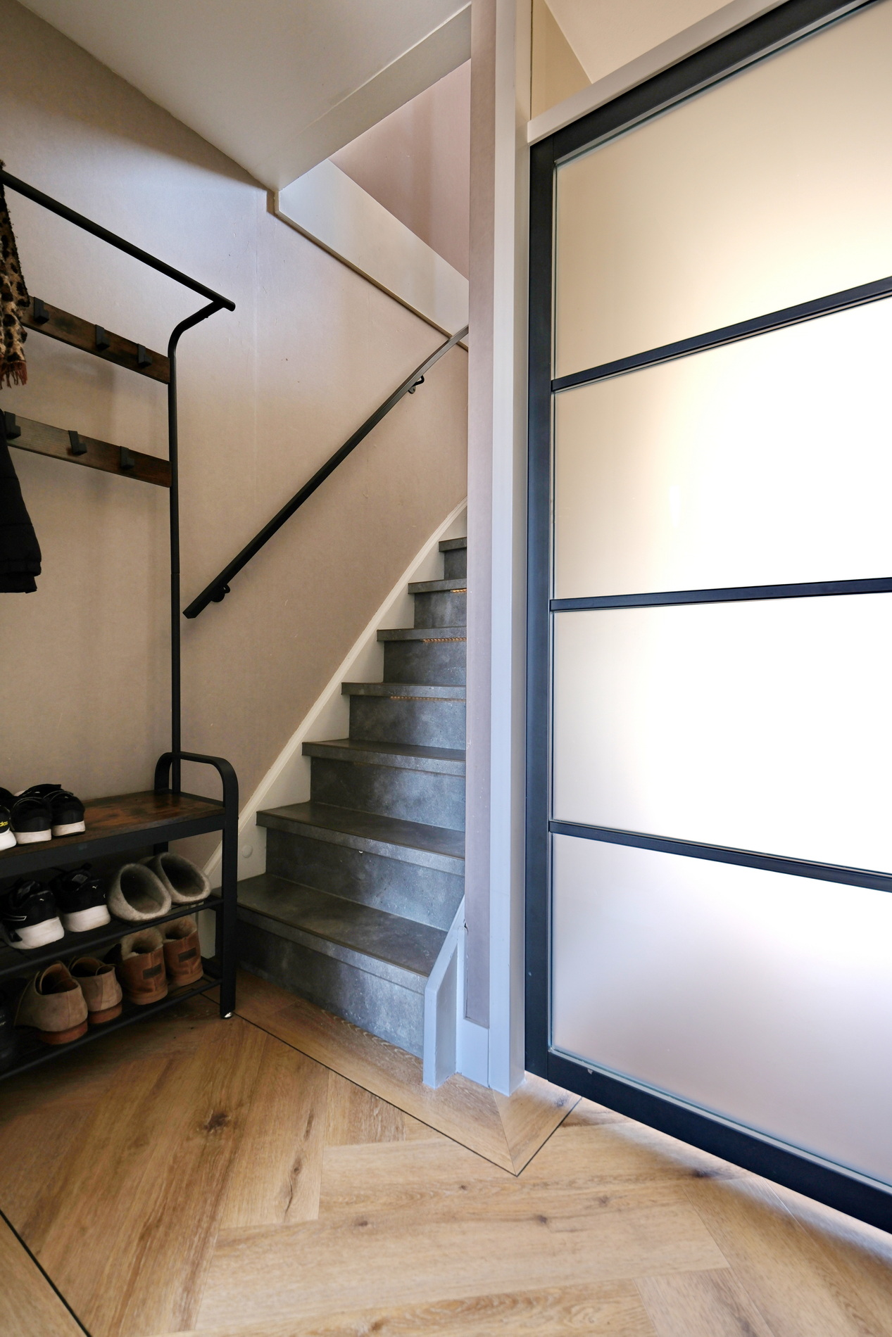 Entree, hal, toilet, trapopgang en via een tussendeur met glas toegang tot het woon- en eetgedeelte met open keuken.