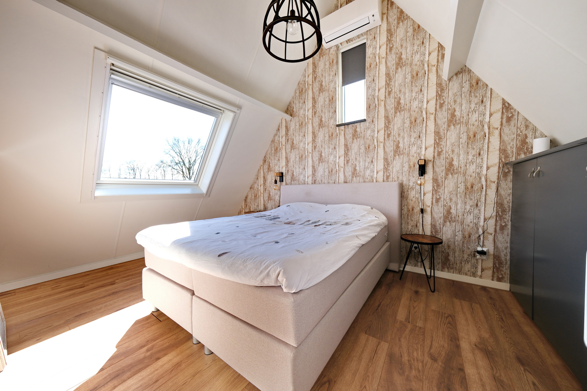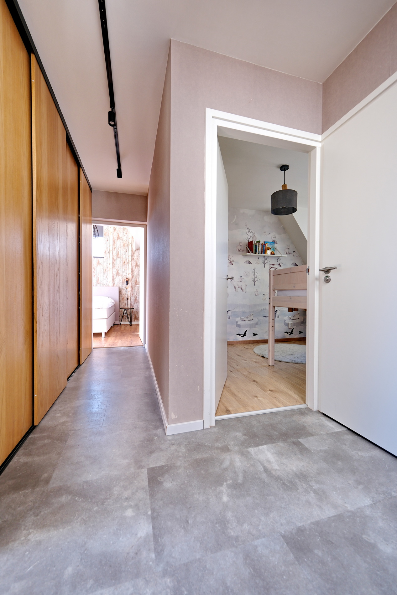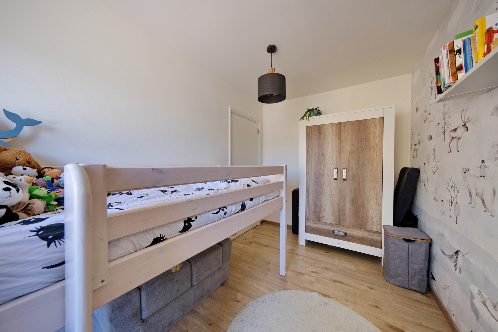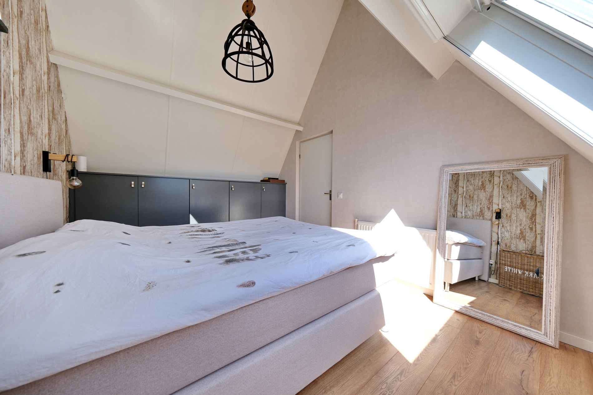 Overloop, drie slaapkamers en een badkamer. De ouderslaapkamer bevindt zich in de uitbouw met een airconditioning, daarnaast zijn er 2 ruime kinderkamers en in het middendeel een praktische kastenwand. Aan de voorzijde is het huis recht opgetrokken over de hele breedte en aan de achterkant bevindt zich een dakkapel.