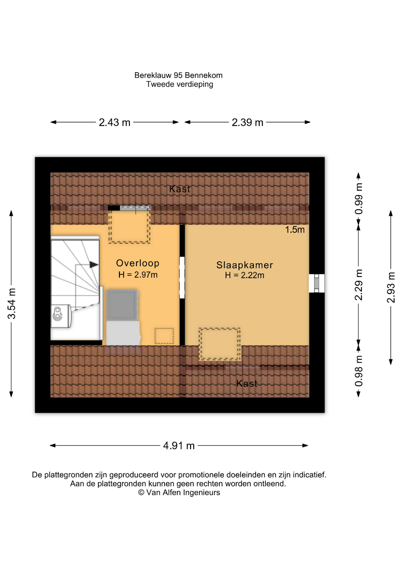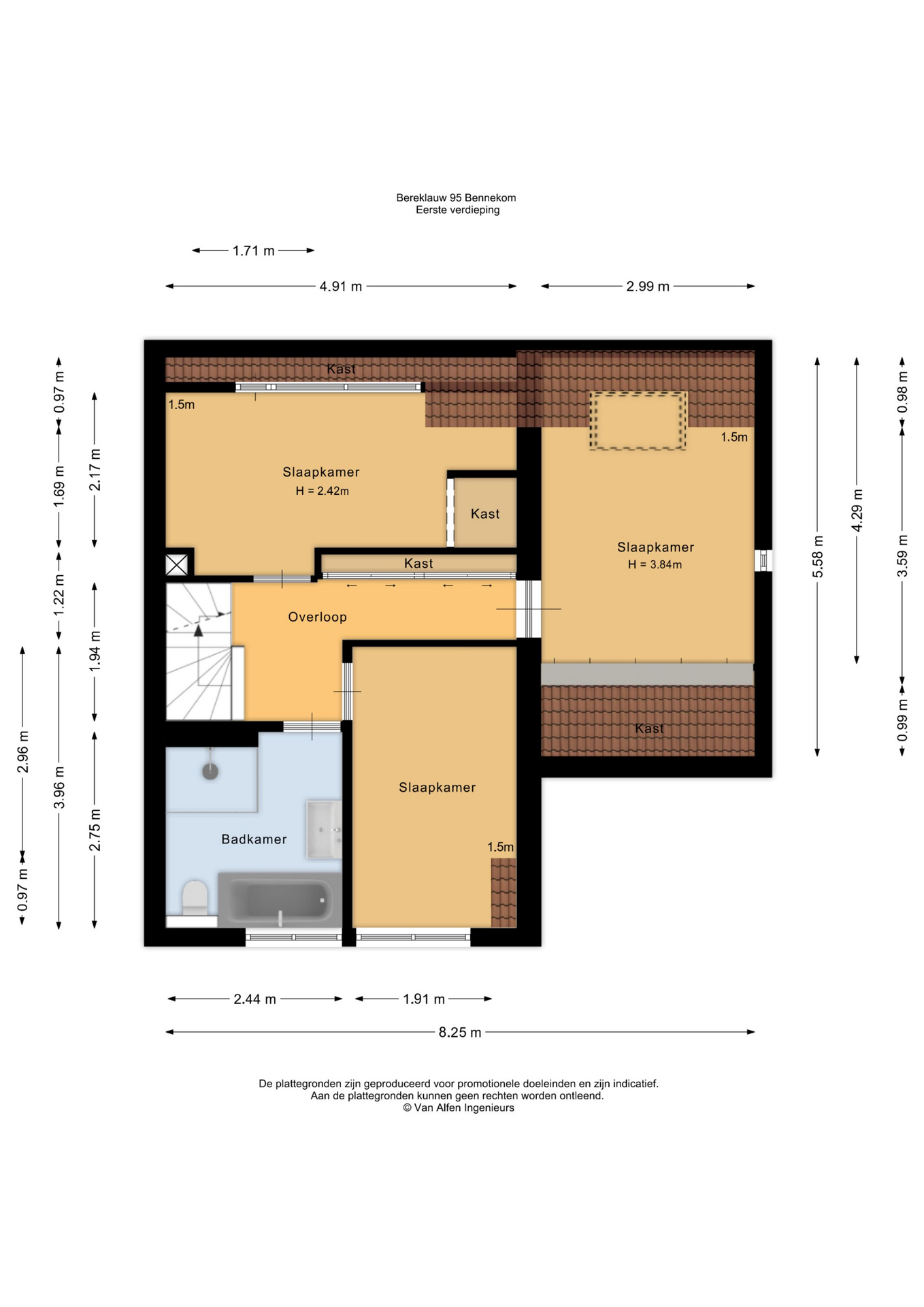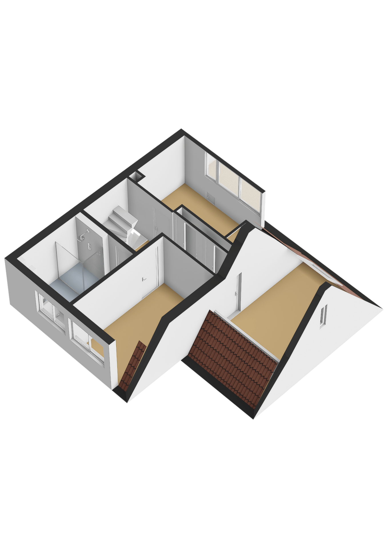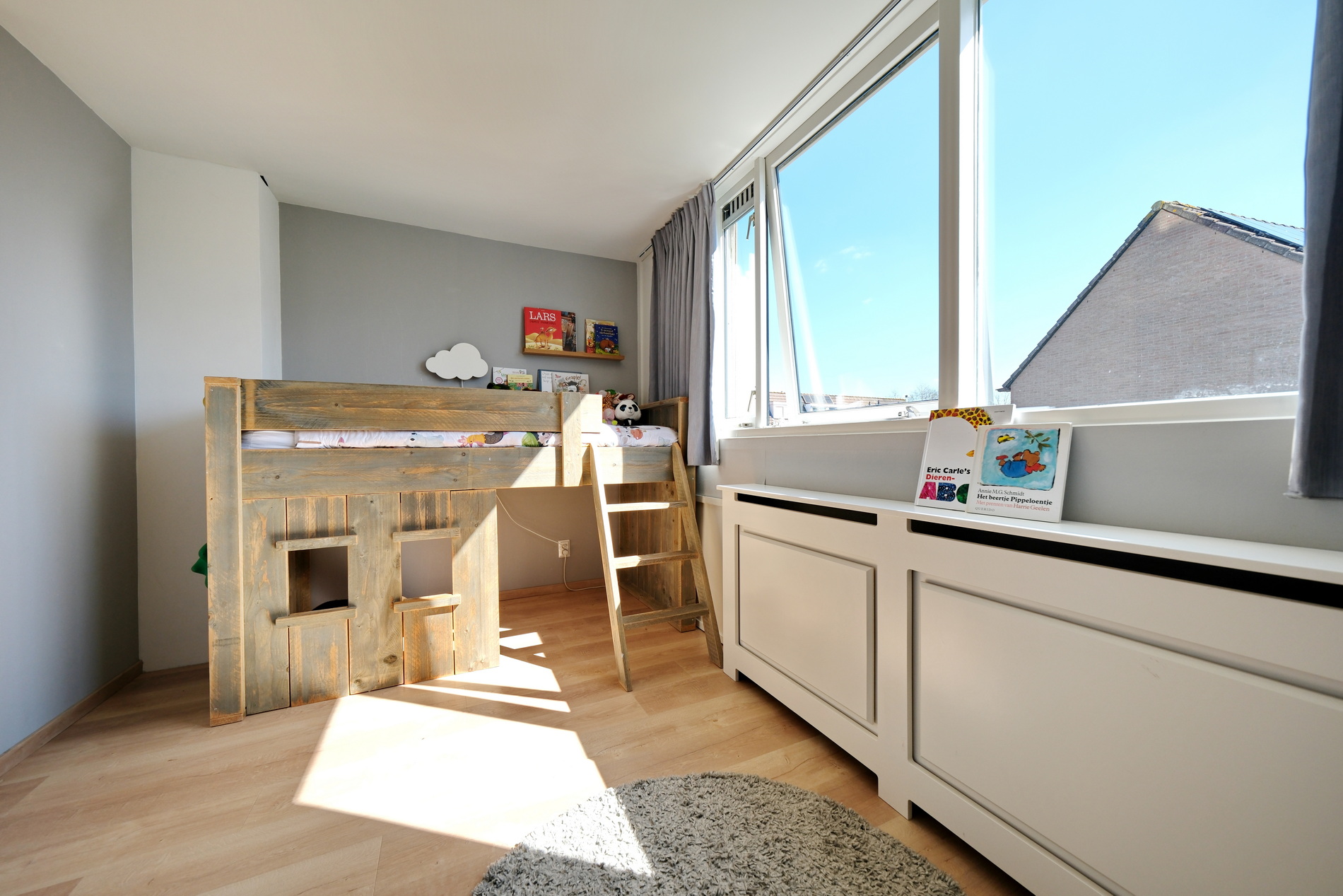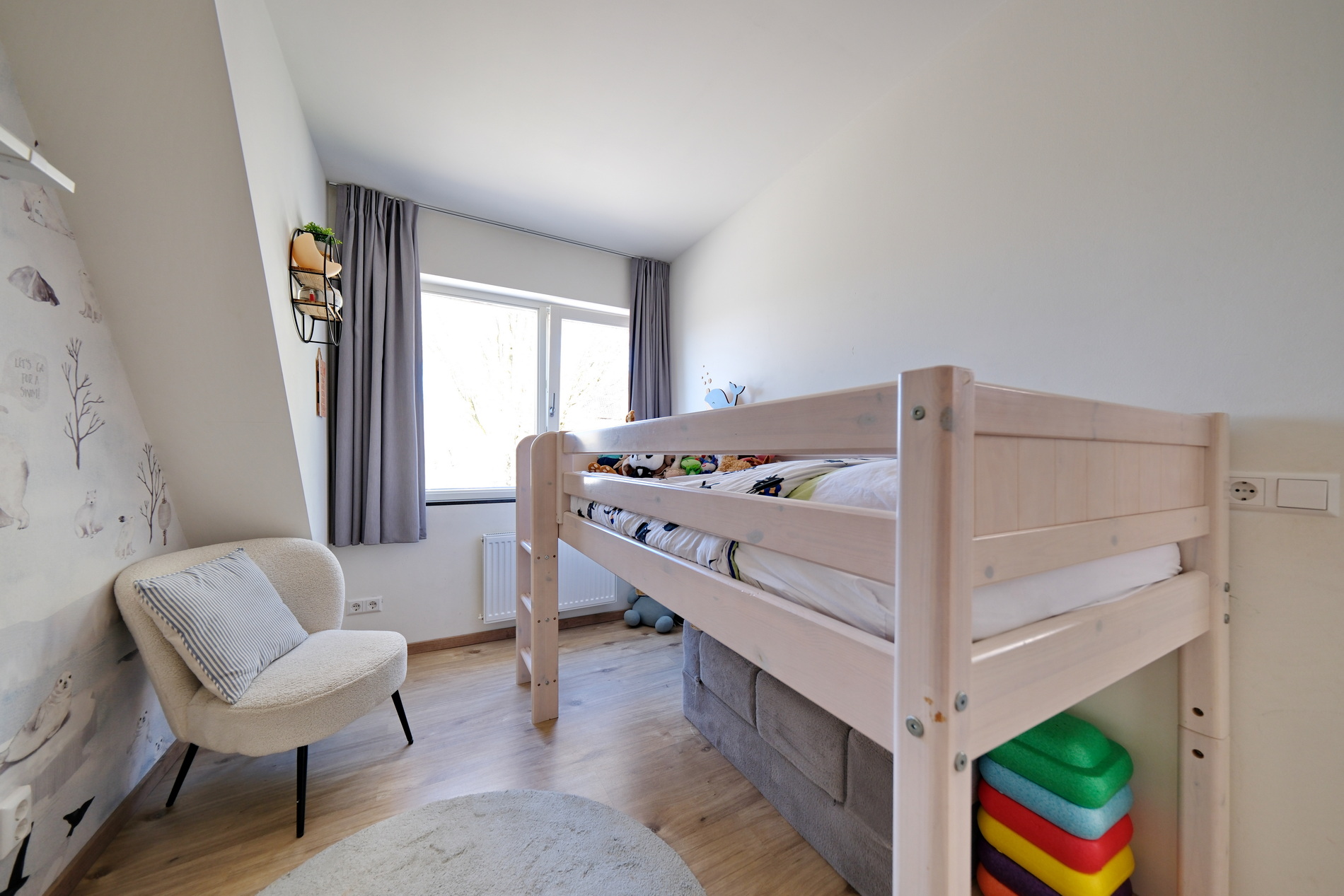 Overloop, drie slaapkamers en een badkamer. De ouderslaapkamer bevindt zich in de uitbouw met een airconditioning, daarnaast zijn er 2 ruime kinderkamers en in het middendeel een praktische kastenwand. Aan de voorzijde is het huis recht opgetrokken over de hele breedte en aan de achterkant bevindt zich een dakkapel.