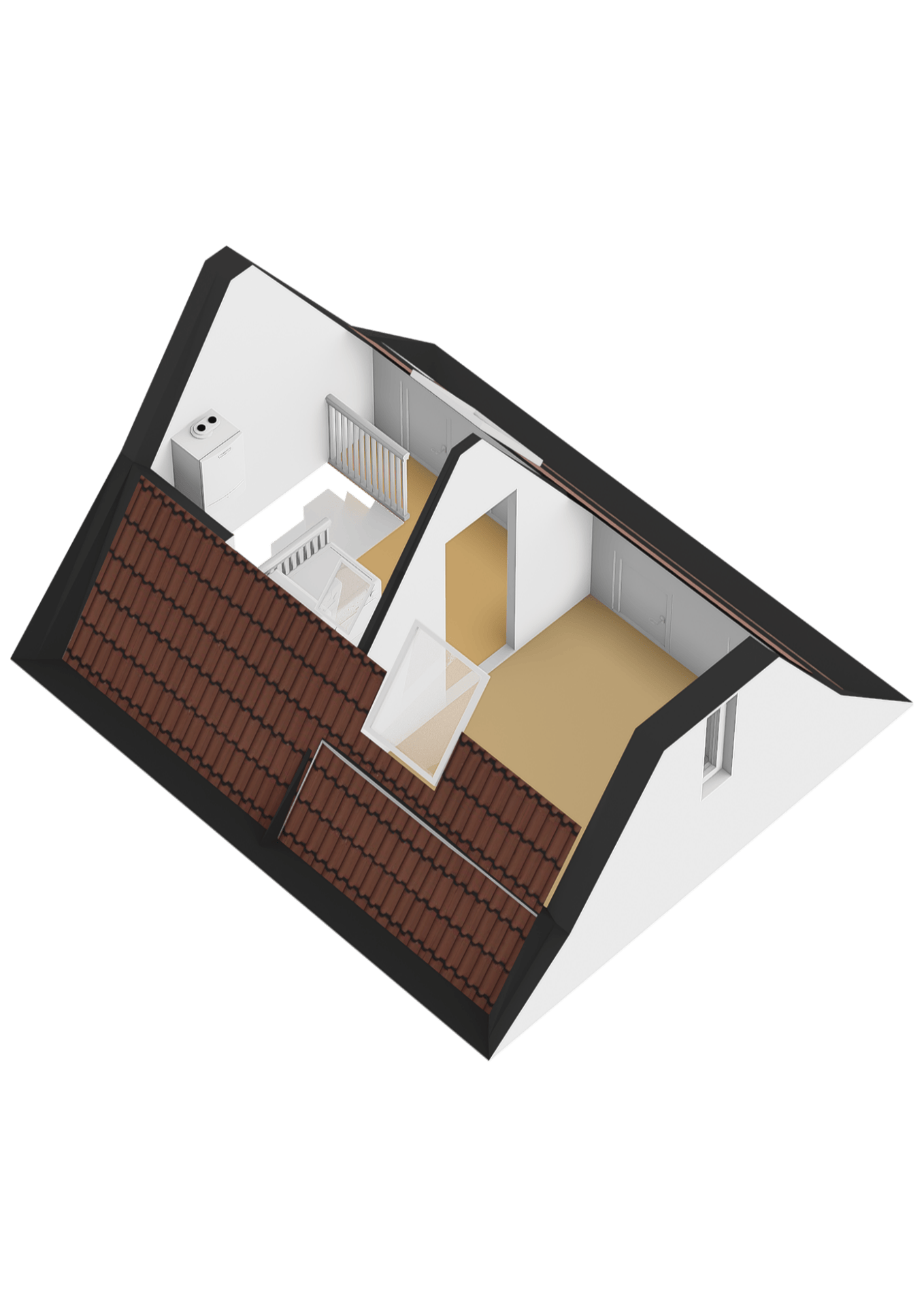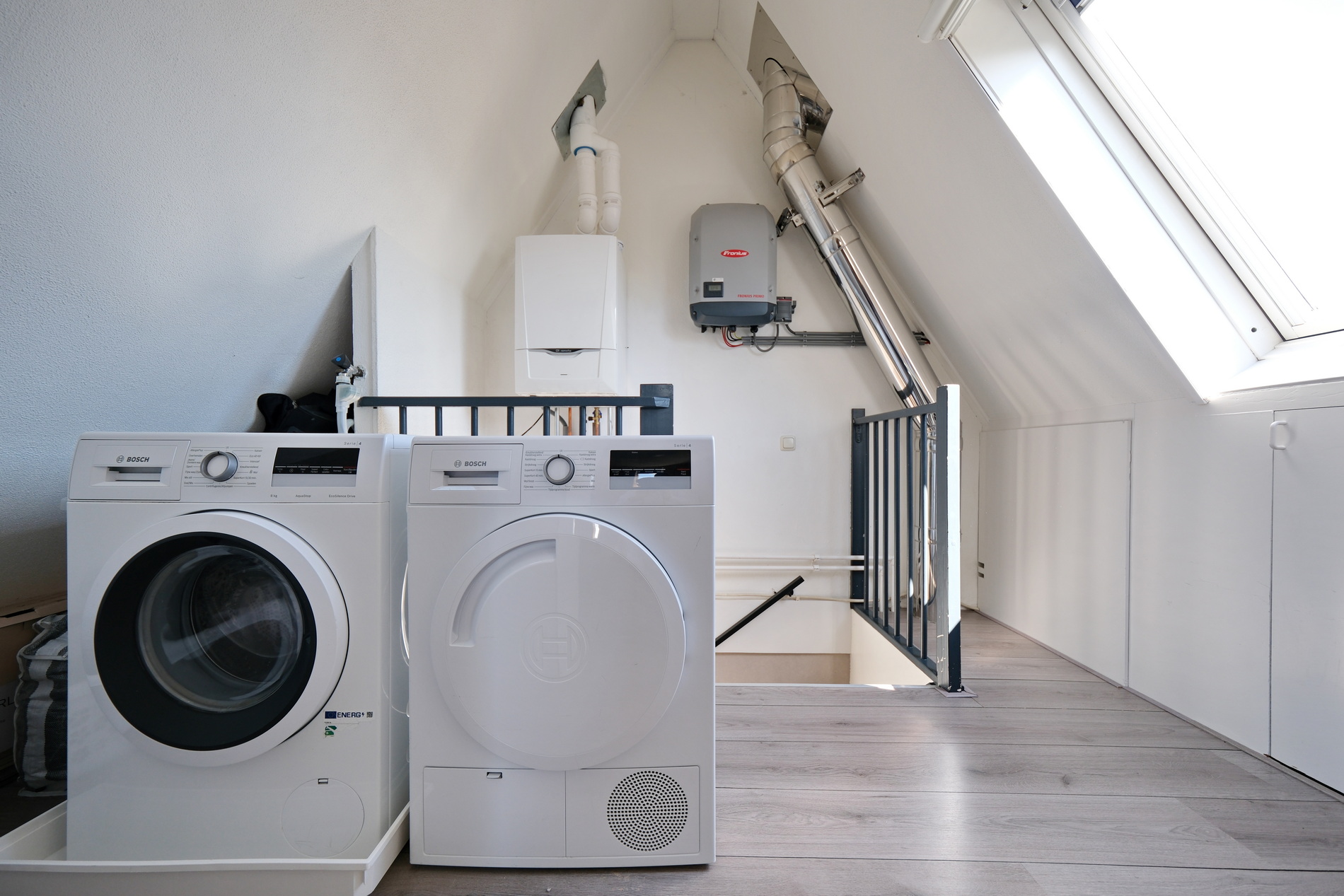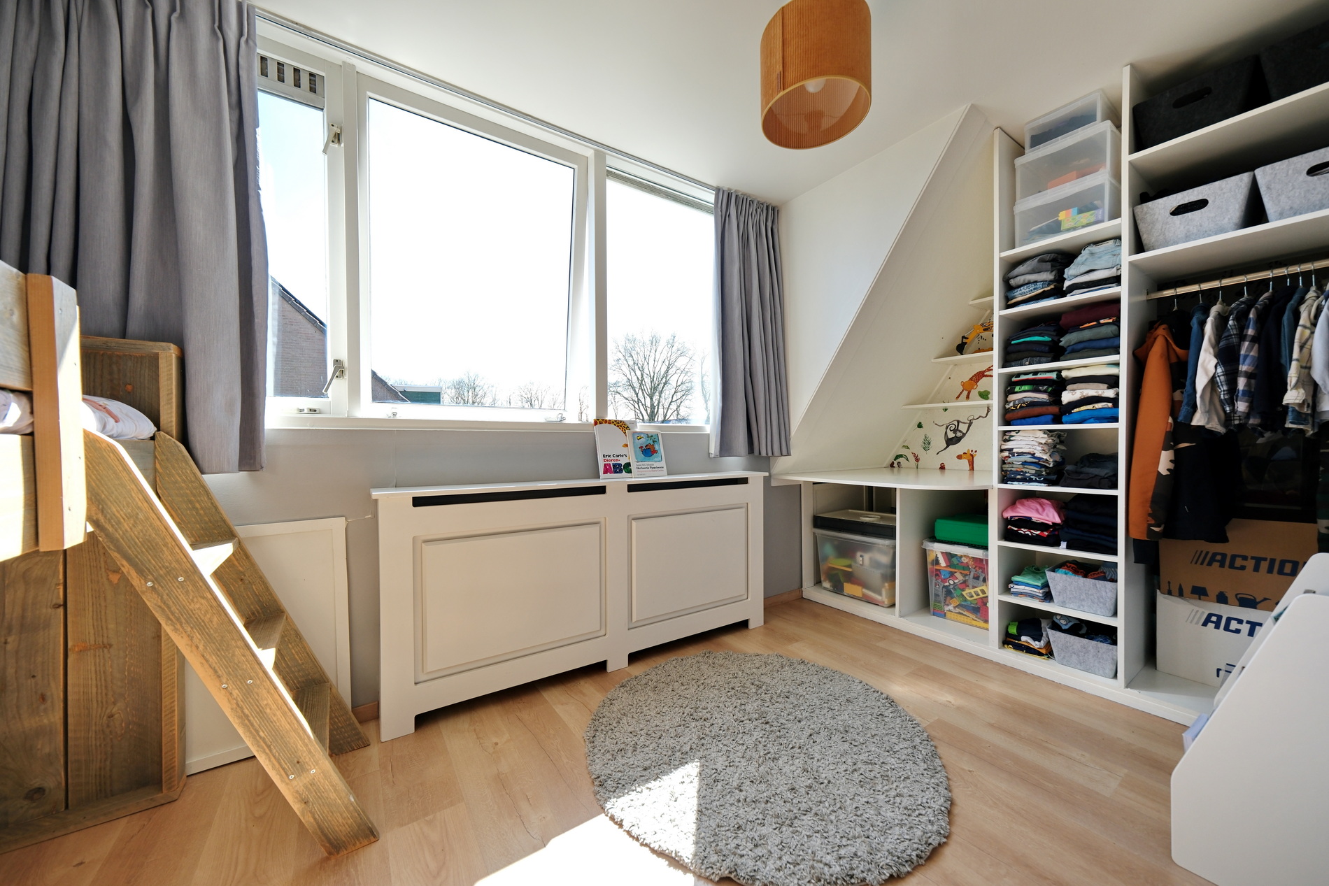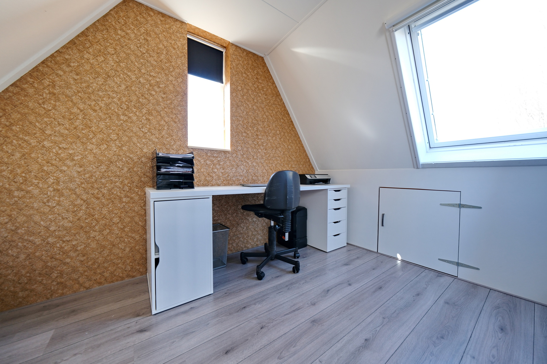 Vaste trap naar de zolderverdieping met voorzolder en een vierde kamer die fungeert als werkplek. Overal bergruimte achter de knieschotten en op deze verdieping zijn 2 Veluxramen. In de nok nog een kleine bergvliering.