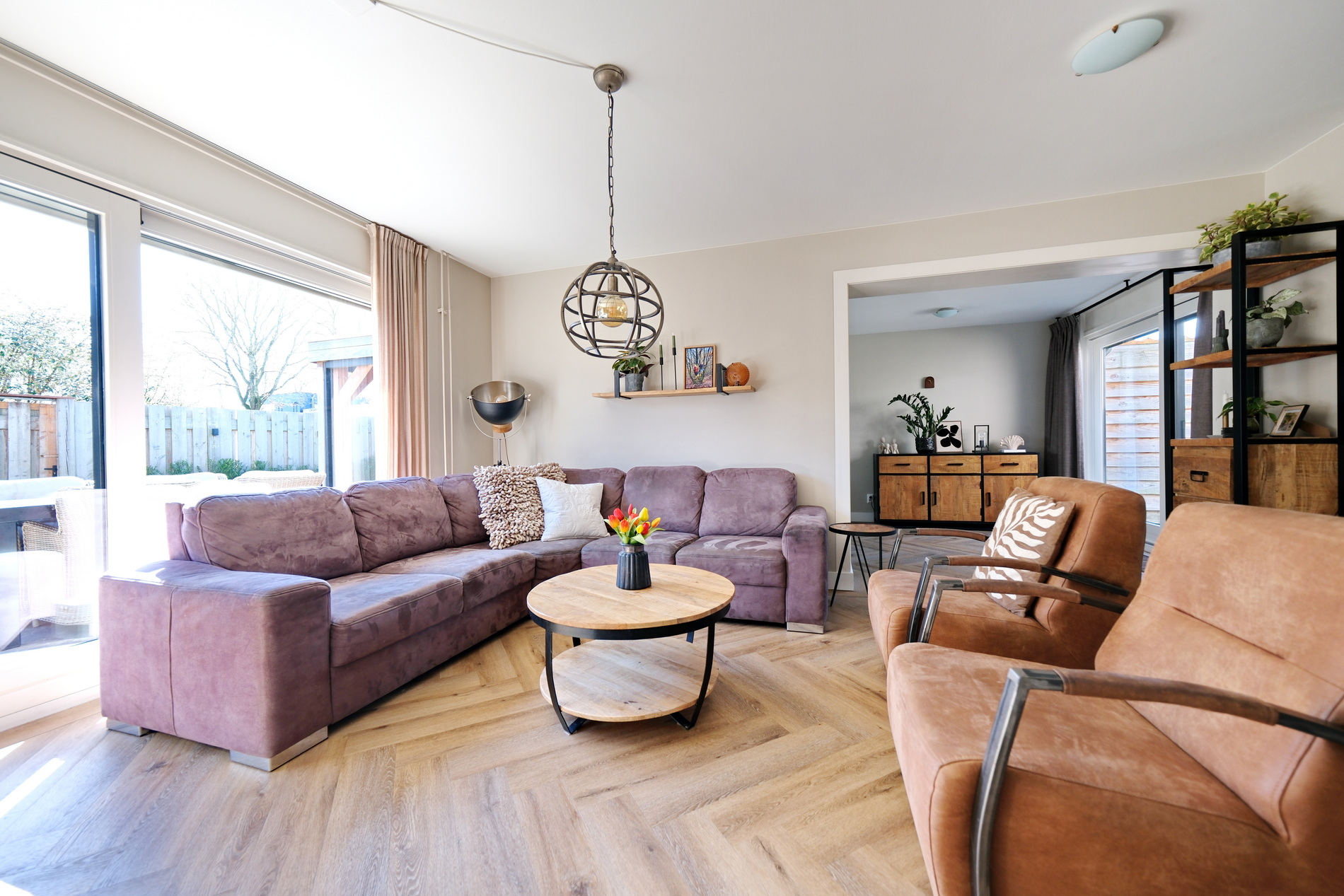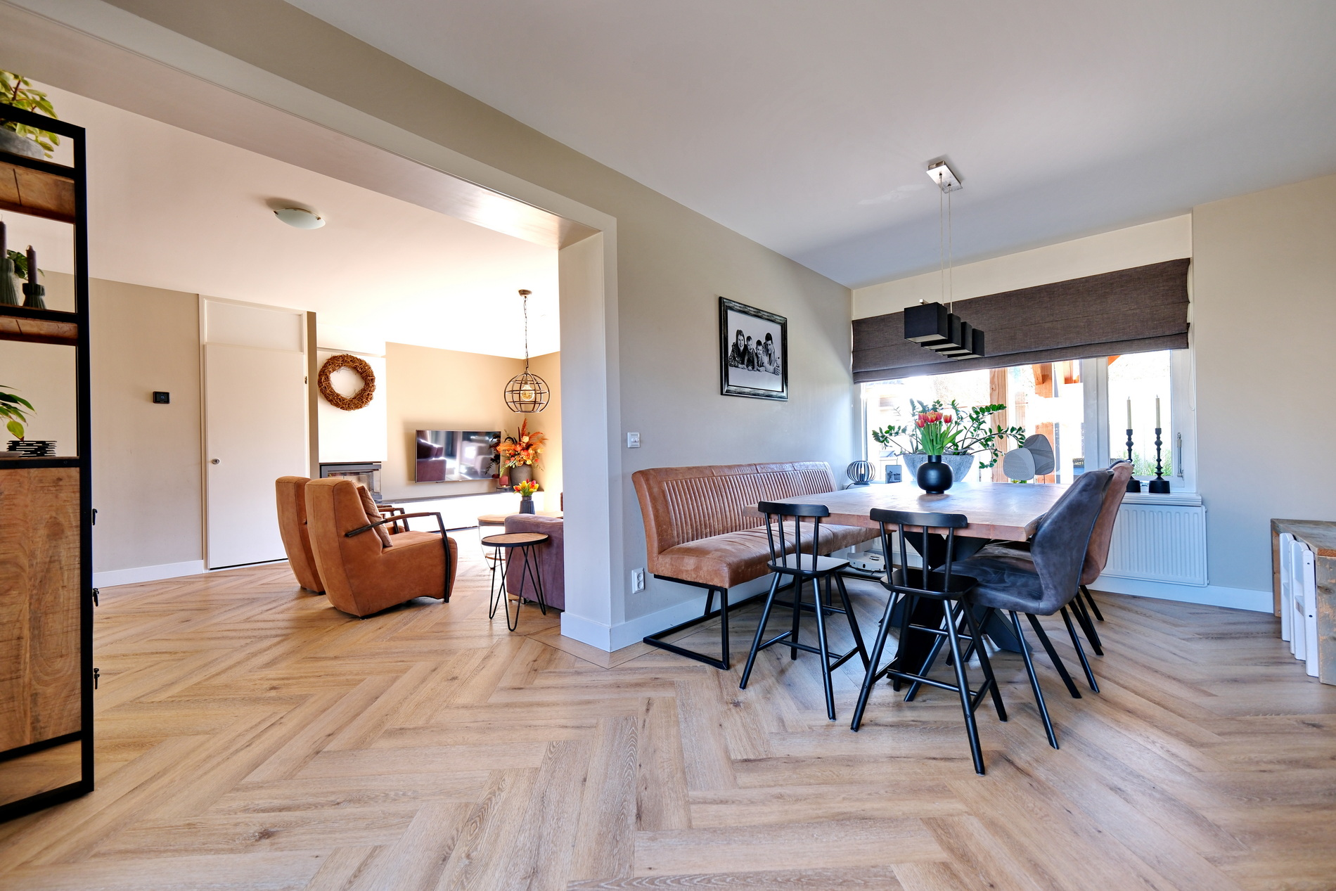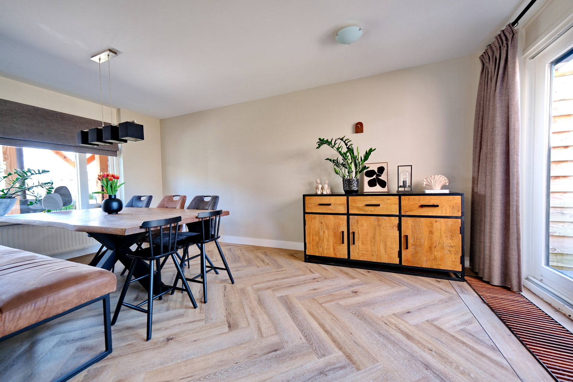De ruime woonkamer biedt veel lichtinval en een gezellige zithoek met houtkachel en uitzicht op de tuin. Aan de zijkant is de woning royaal vergroot: een royale eetkamer en extra ruimte op de verdieping. De eetkamer heeft aan de voorzijde een schuifpui en aan beide zijden rolluiken. Op de begane grond ligt een fraaie PVC-vloer in hongaarse punt.