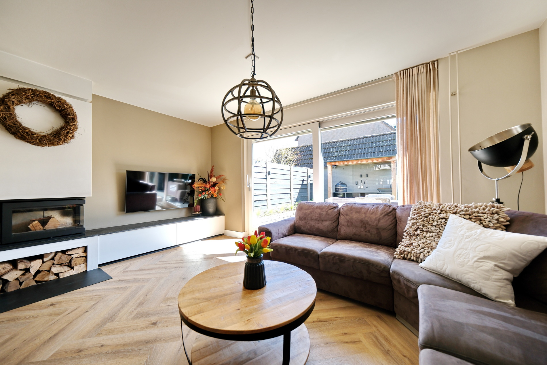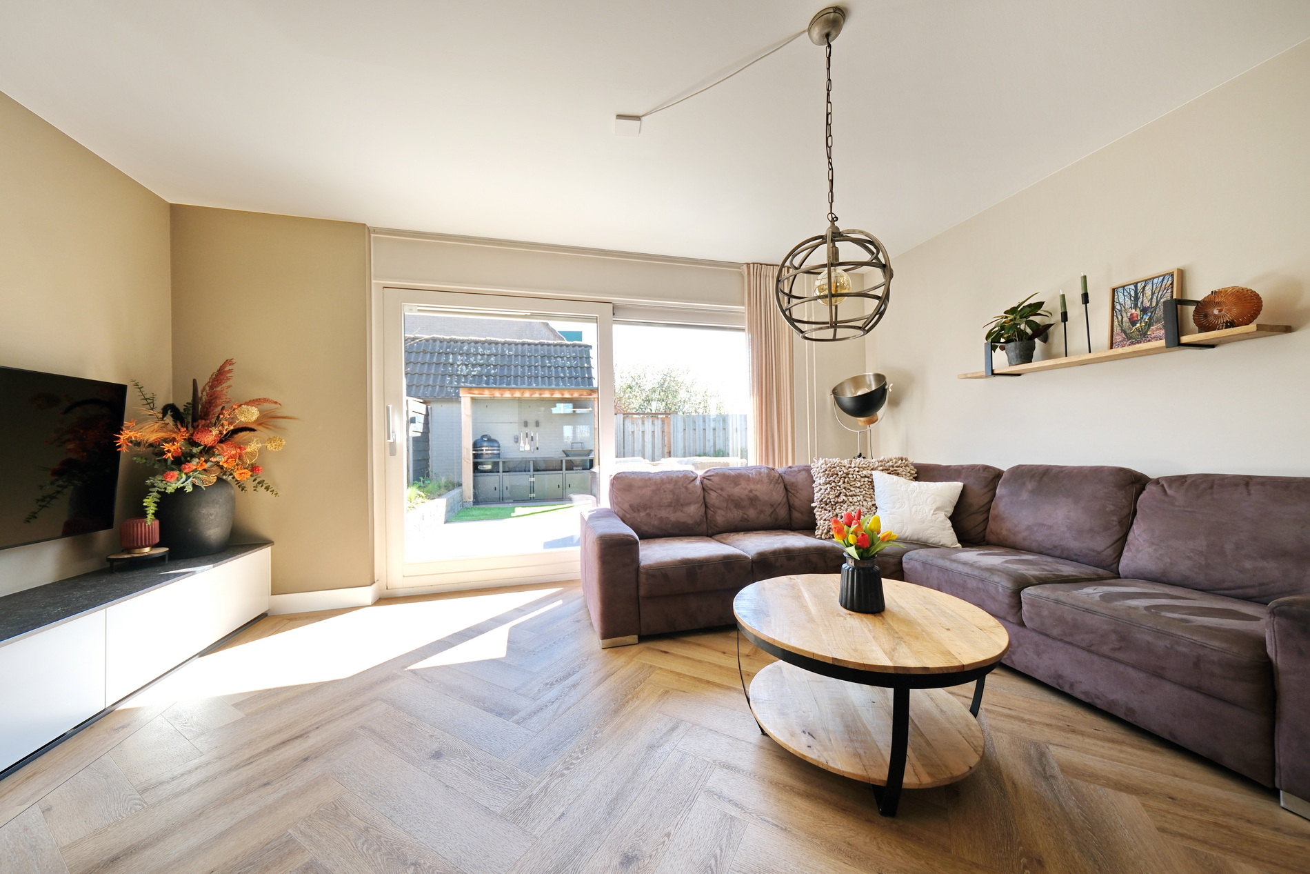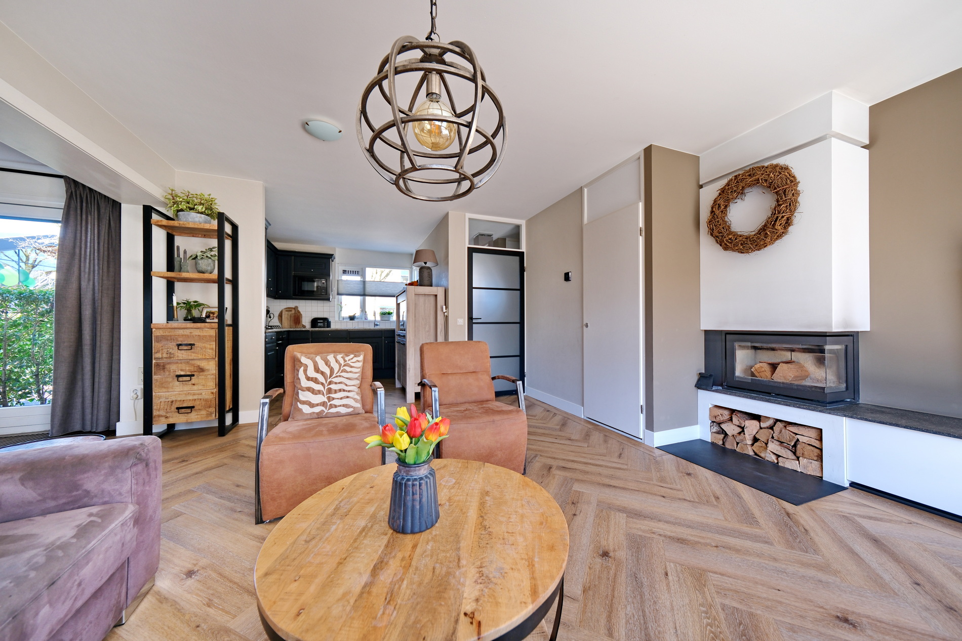 De ruime woonkamer biedt veel lichtinval en een gezellige zithoek met houtkachel en uitzicht op de tuin. Aan de zijkant is de woning royaal vergroot: een royale eetkamer en extra ruimte op de verdieping. De eetkamer heeft aan de voorzijde een schuifpui en aan beide zijden rolluiken. Op de begane grond ligt een fraaie PVC-vloer in hongaarse punt.