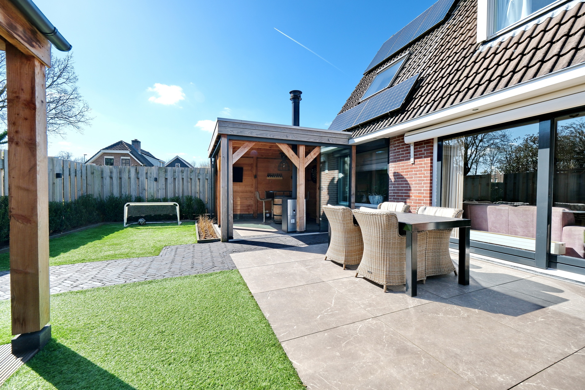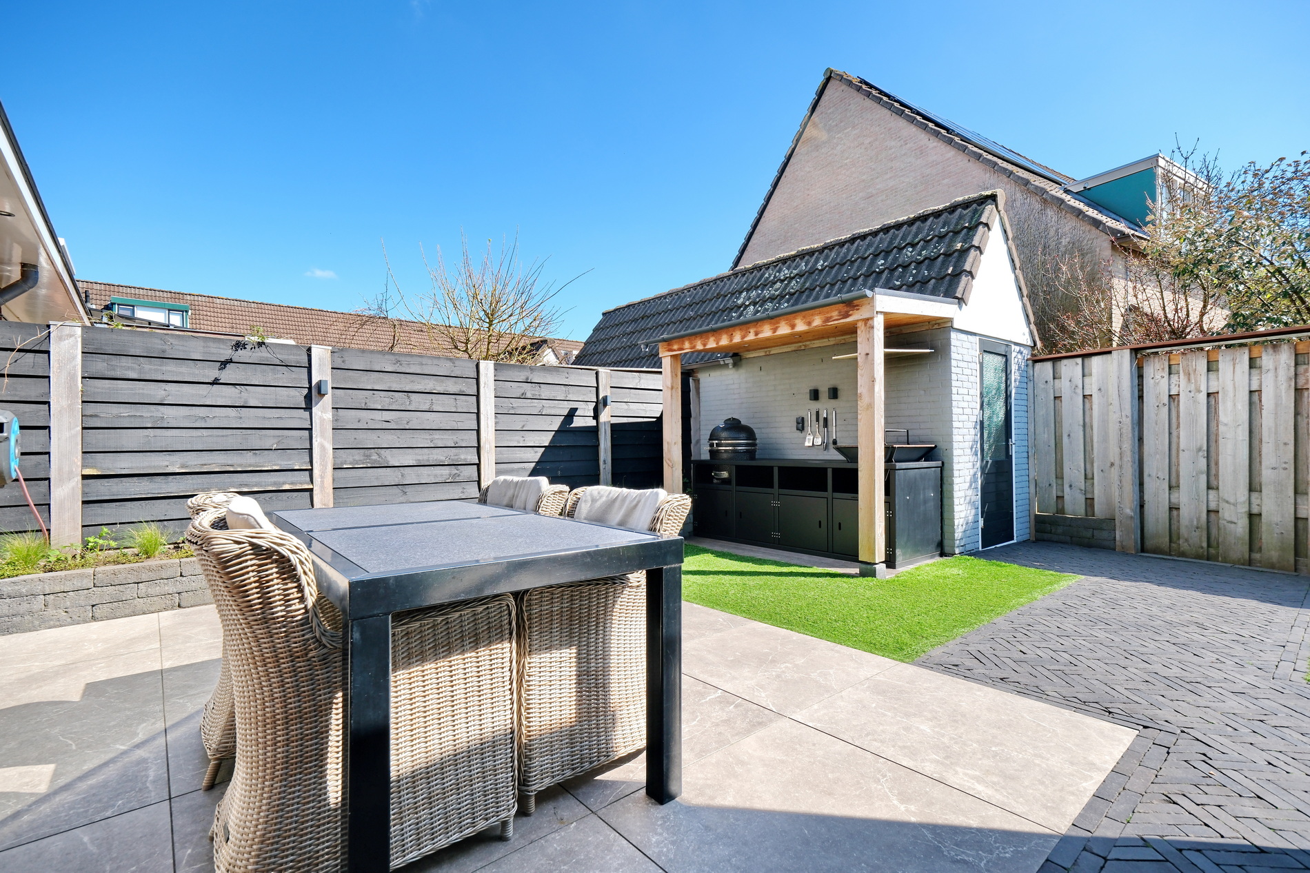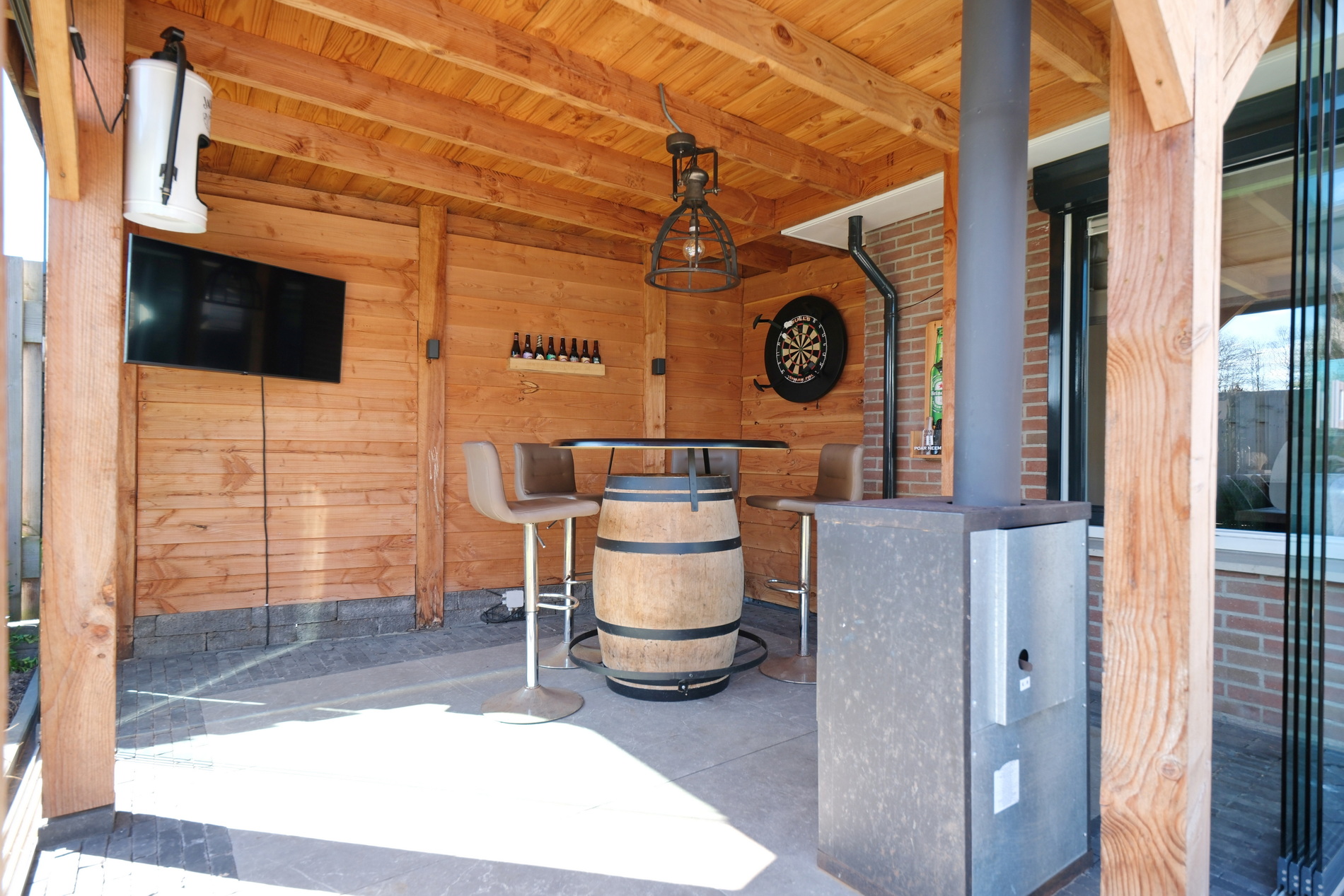 De veranda maakt het mogelijk om het hele jaar door van de tuin te genieten. Met de glazen schuifwanden zit je lekker beschut. Tevens een haard om te verwarmen en een tv-aansluiting. Bij mooi weer zet je alles open en is het een heerlijke loungeplek. De buitenkeuken wordt ter overname aangeboden. De tuin ligt op het zuiden, er is een houten berging met elektra en is achterom bereikbaar via een schuifpoort.
