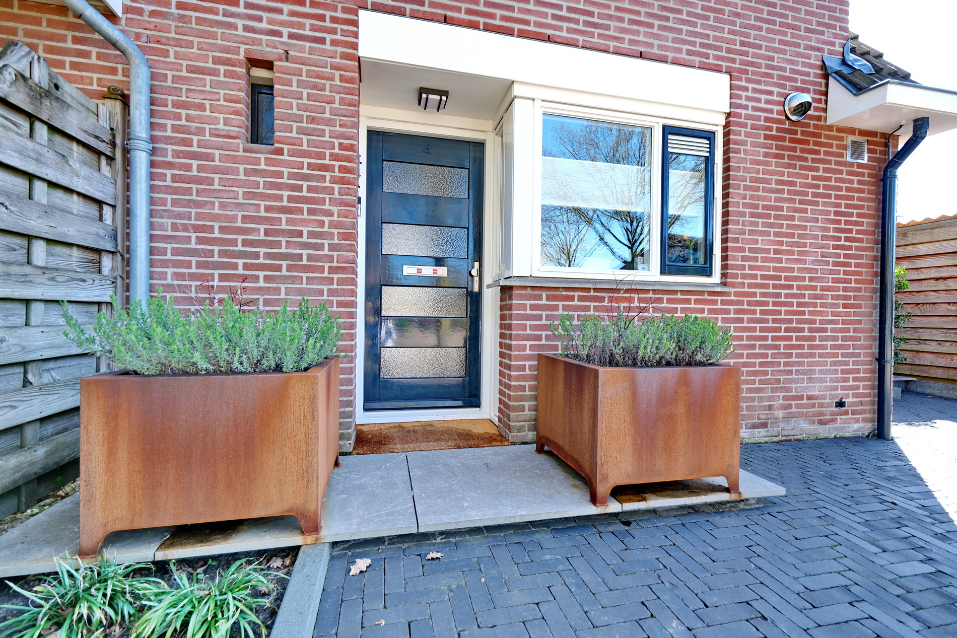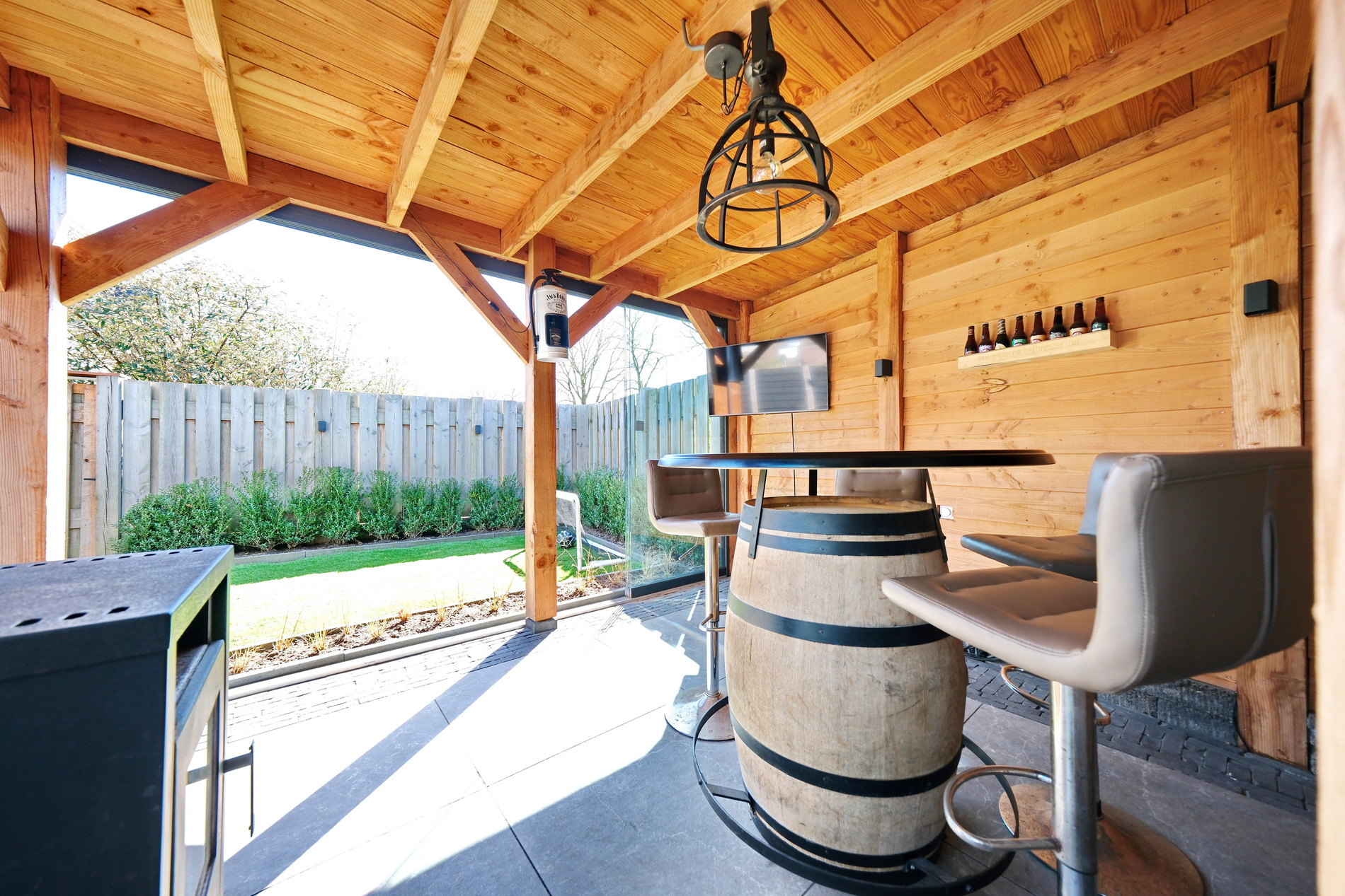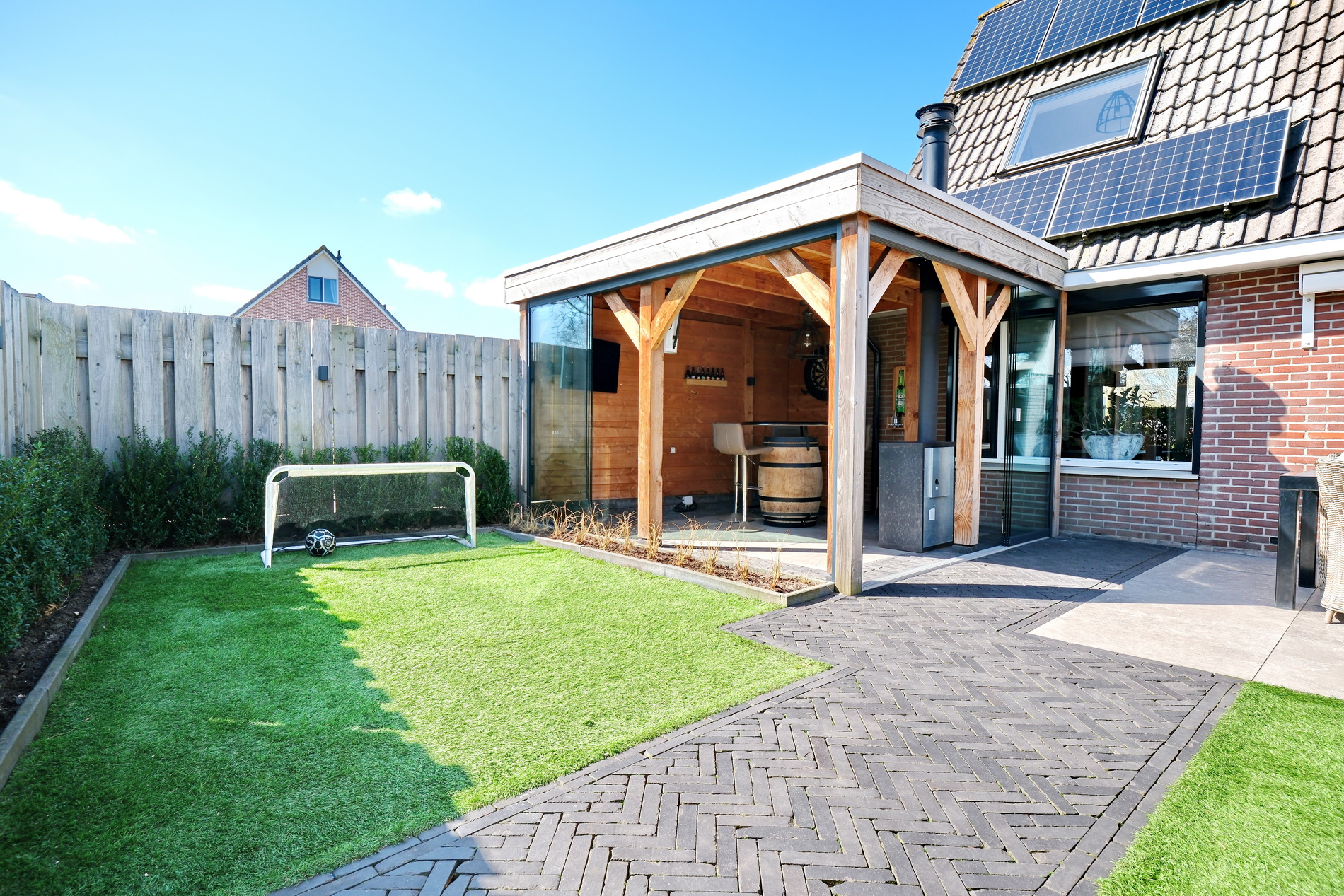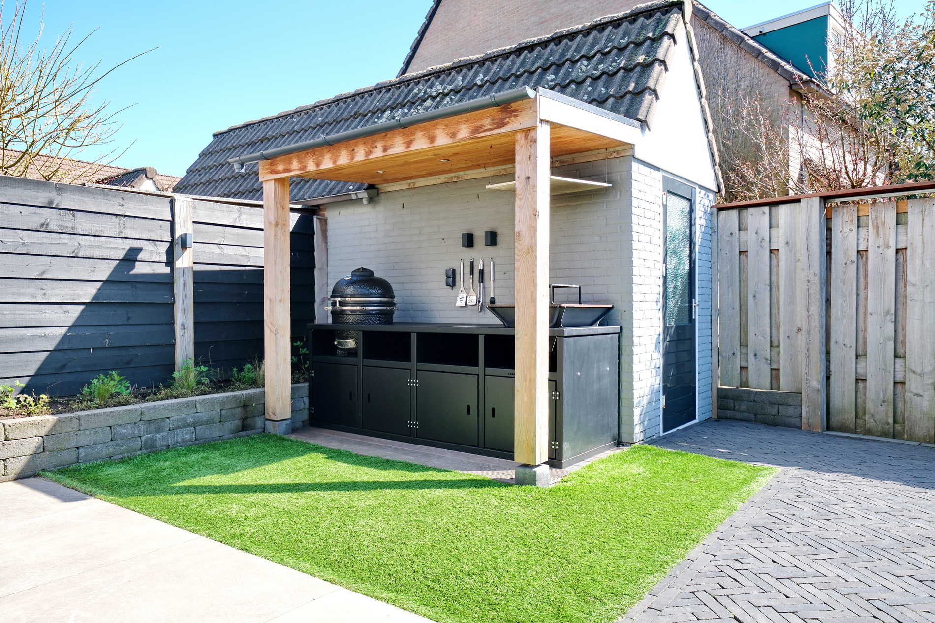 De veranda maakt het mogelijk om het hele jaar door van de tuin te genieten. Met de glazen schuifwanden zit je lekker beschut. Tevens een haard om te verwarmen en een tv-aansluiting. Bij mooi weer zet je alles open en is het een heerlijke loungeplek. De buitenkeuken wordt ter overname aangeboden. De tuin ligt op het zuiden, er is een houten berging met elektra en is achterom bereikbaar via een schuifpoort.