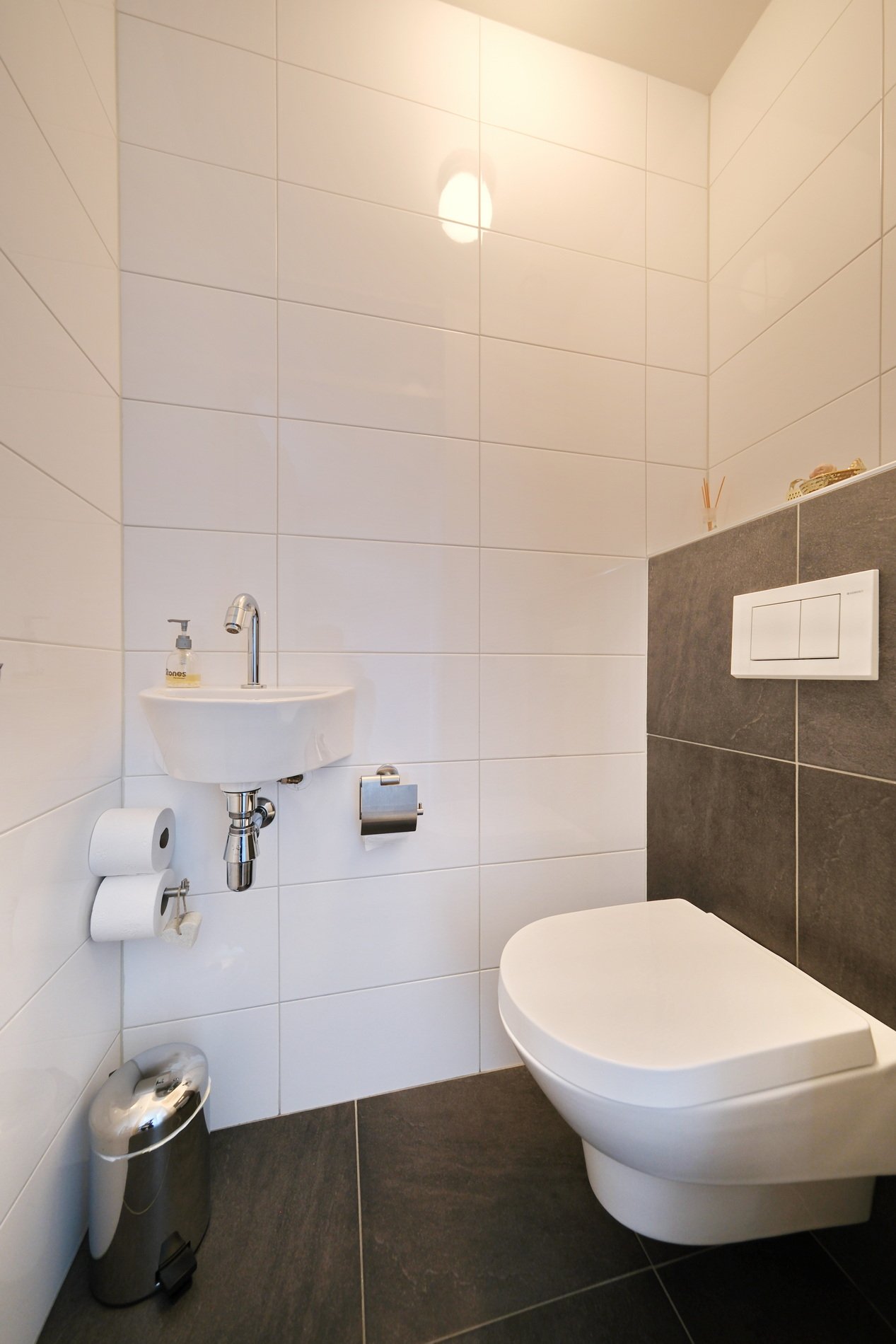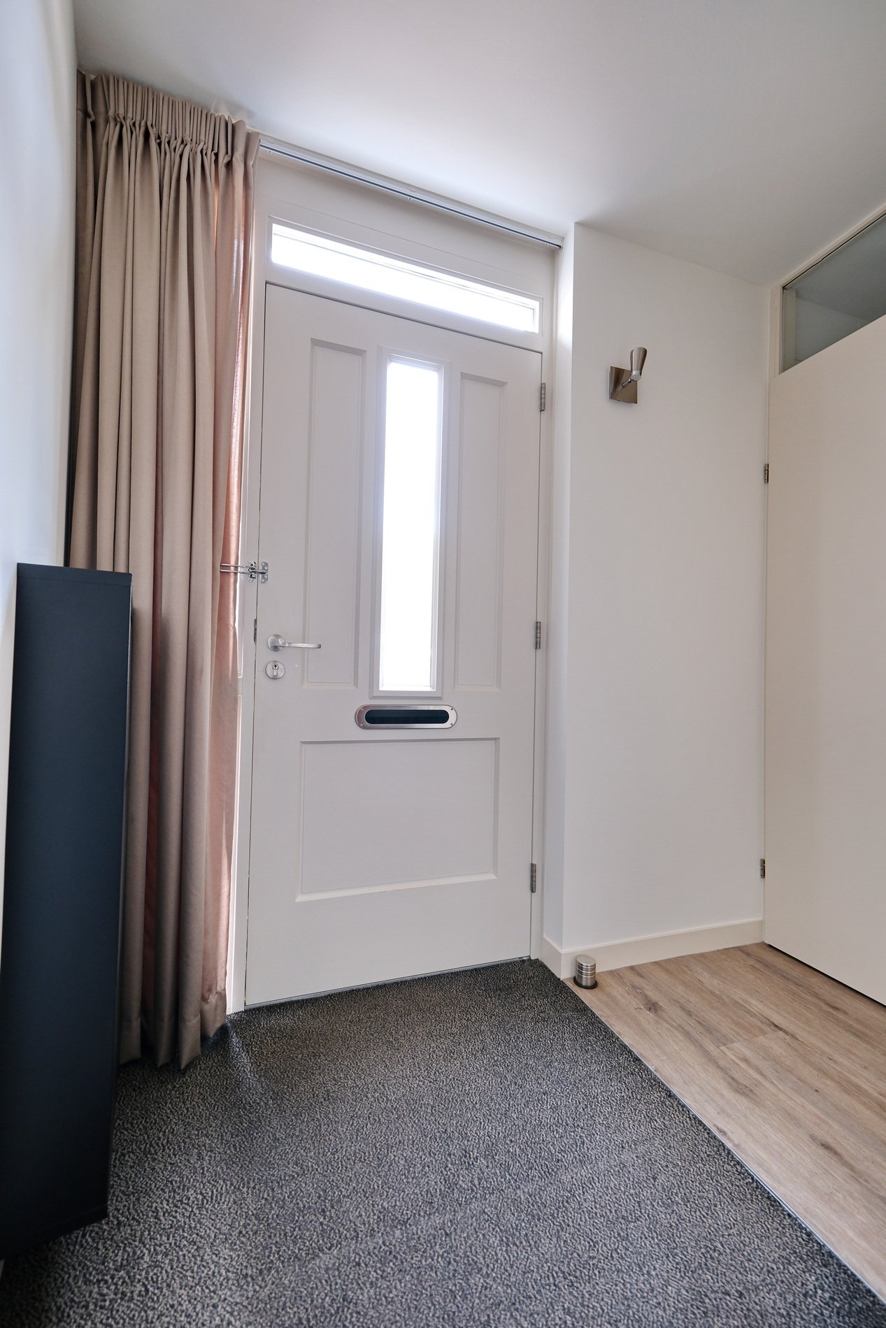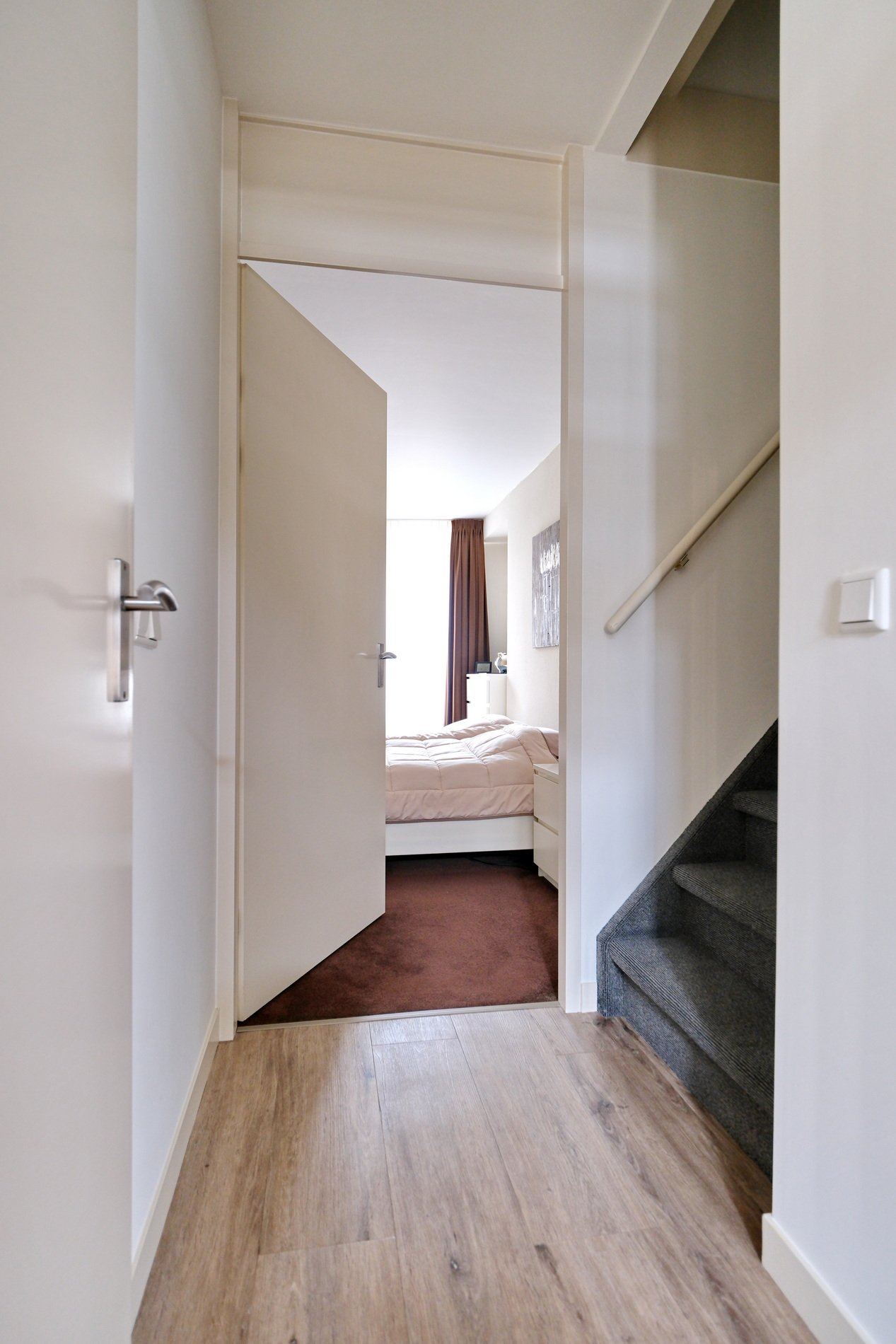 Binnenkomst in de royale hal met toilet, badkamer, slaapkamer, trapopgang en toegang tot de woonkamer.