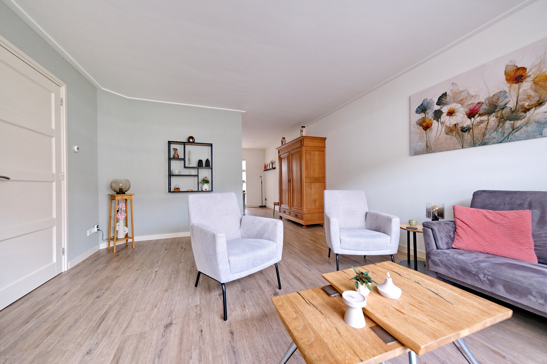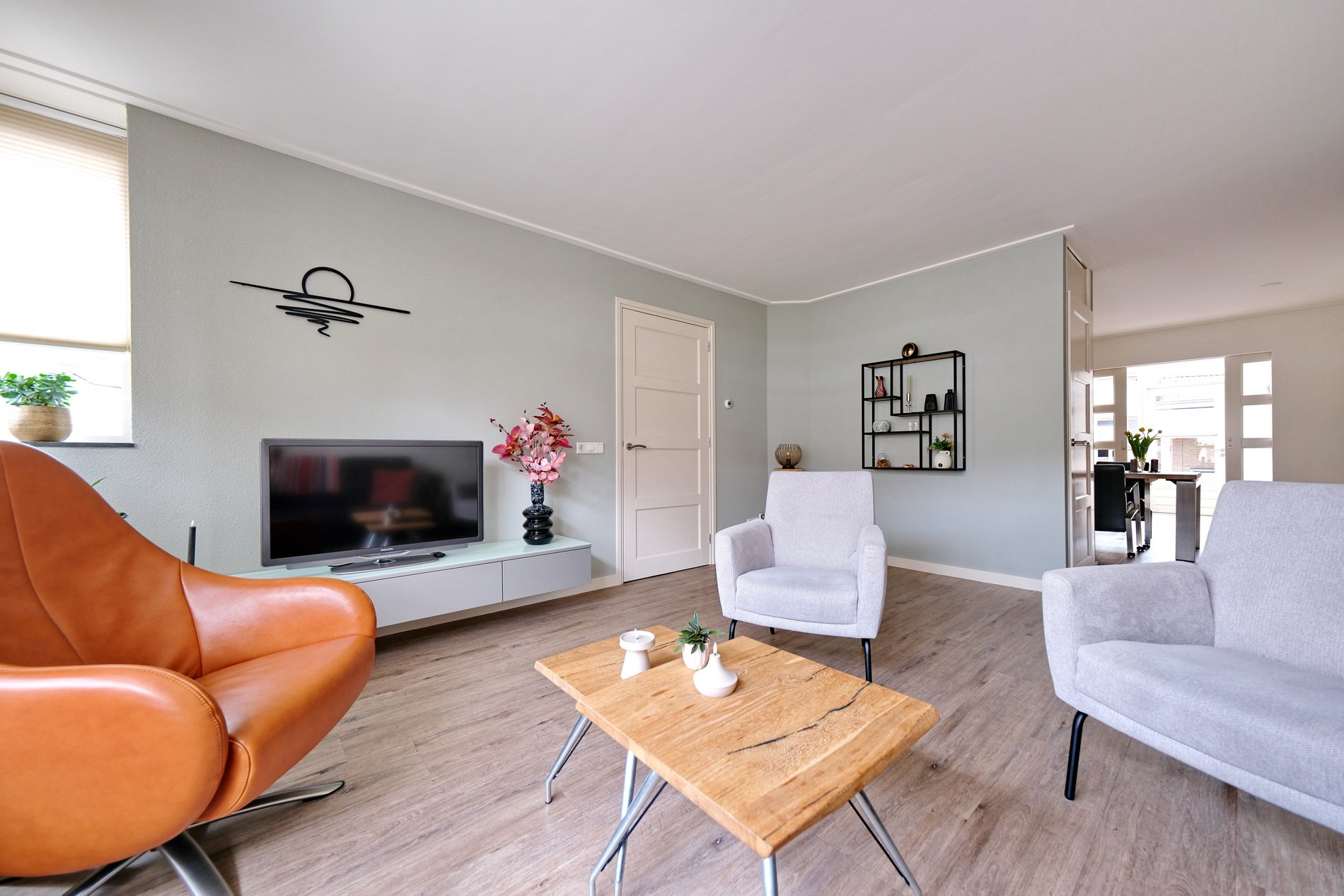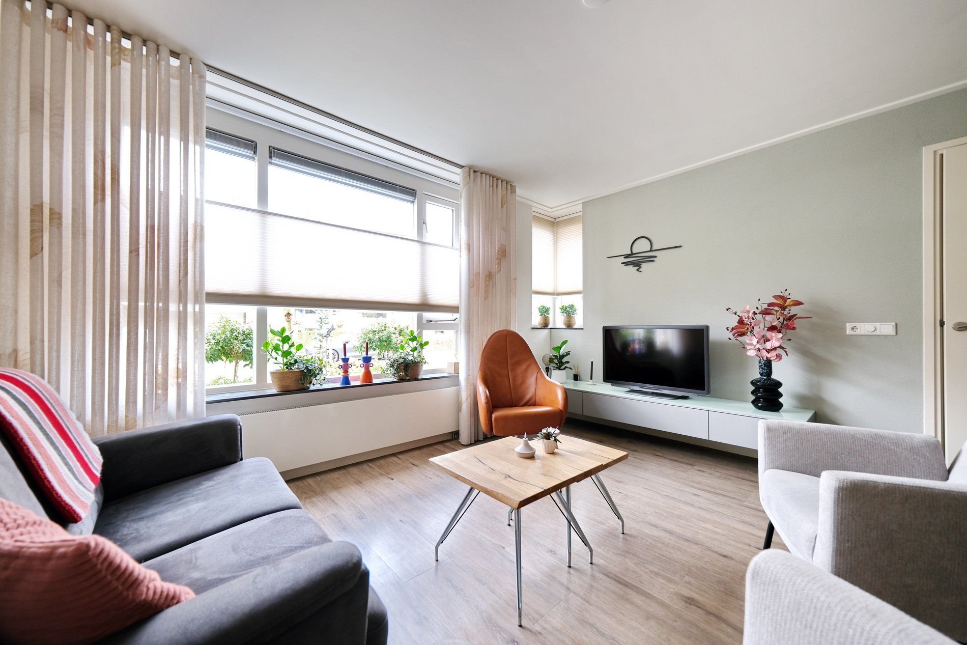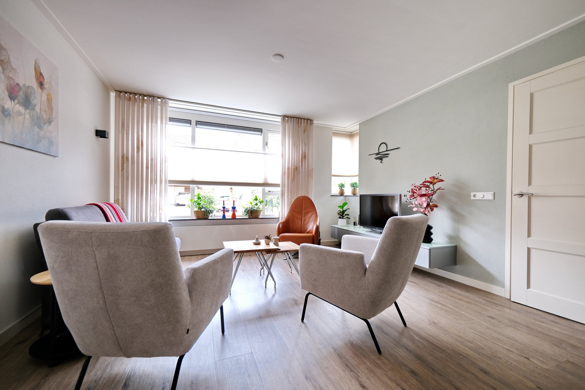 De woonkamer is gesitueerd aan de straatzijde, heeft veel lichtinval en kijkt leuk weg op het straatbeeld.