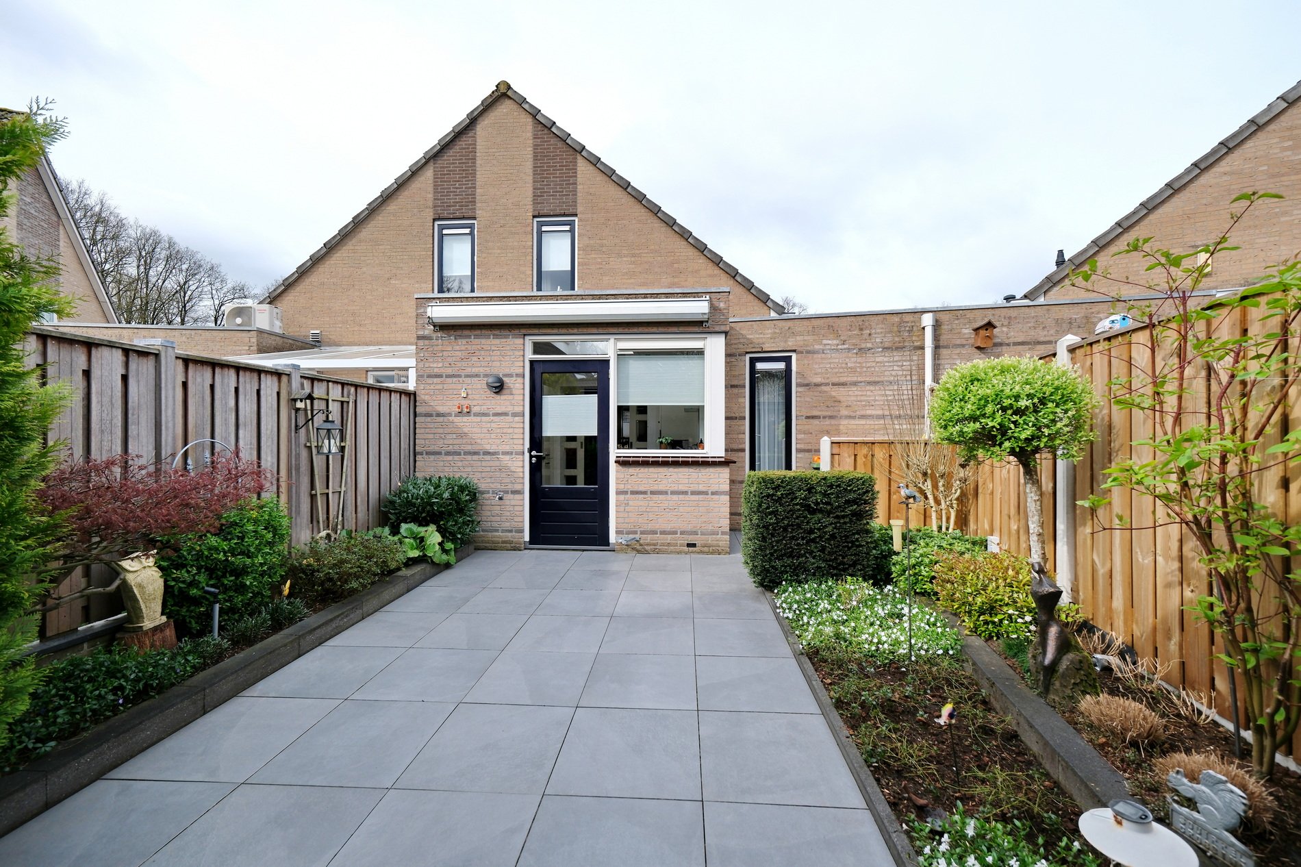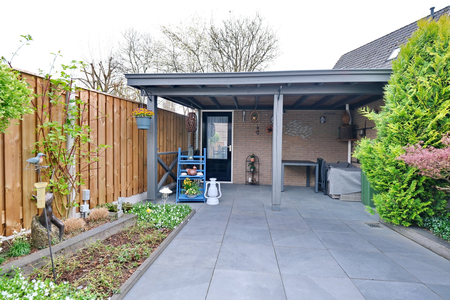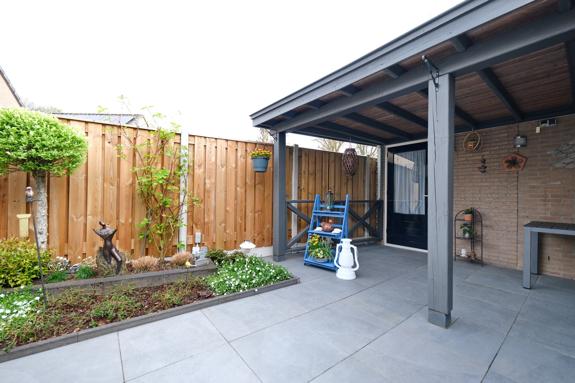 De tuin ligt op het oosten, biedt veel privacy en is aangelegd met een terras, borders met beplanting en een sproeisysteem. Achterin de tuin staat een vergrote stenen berging en een fijne veranda. Hier kan zeker worden genoten van het buitenleven in zowel de zon als de schaduw. Aan de achtergevel een breed zonnescherm en aan de voorkant een elektrisch bedienbaar screen.