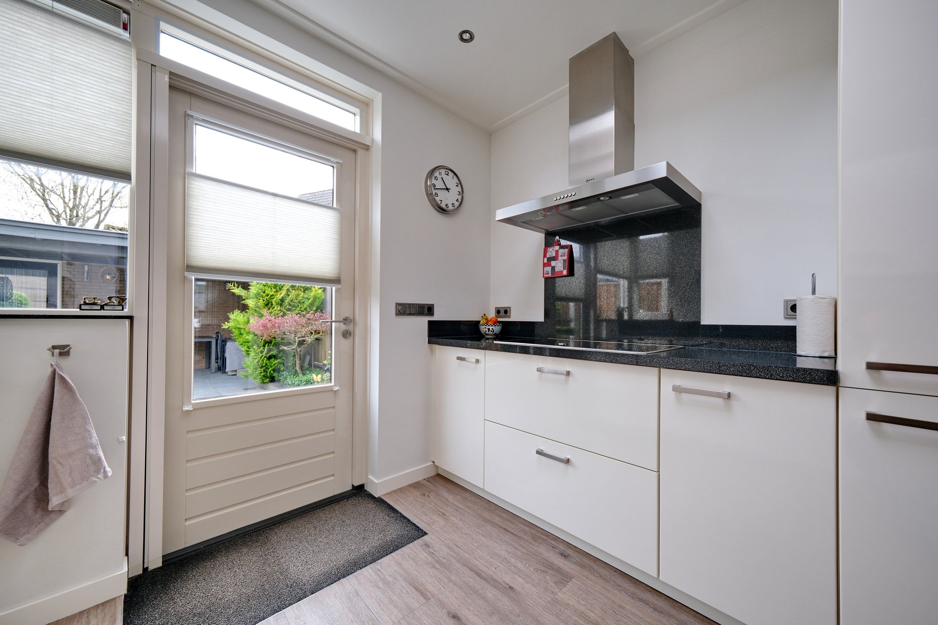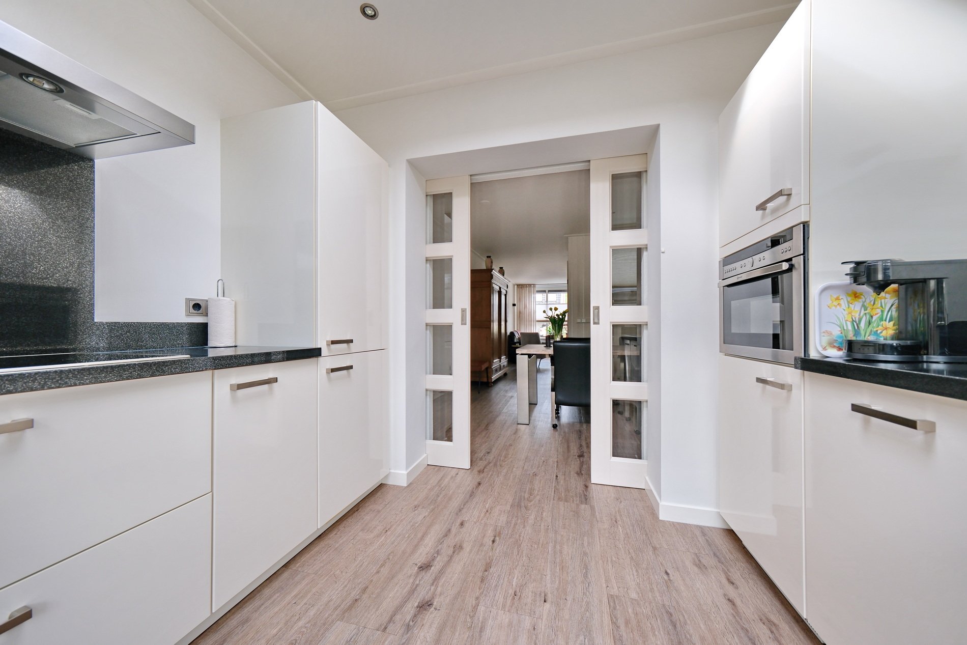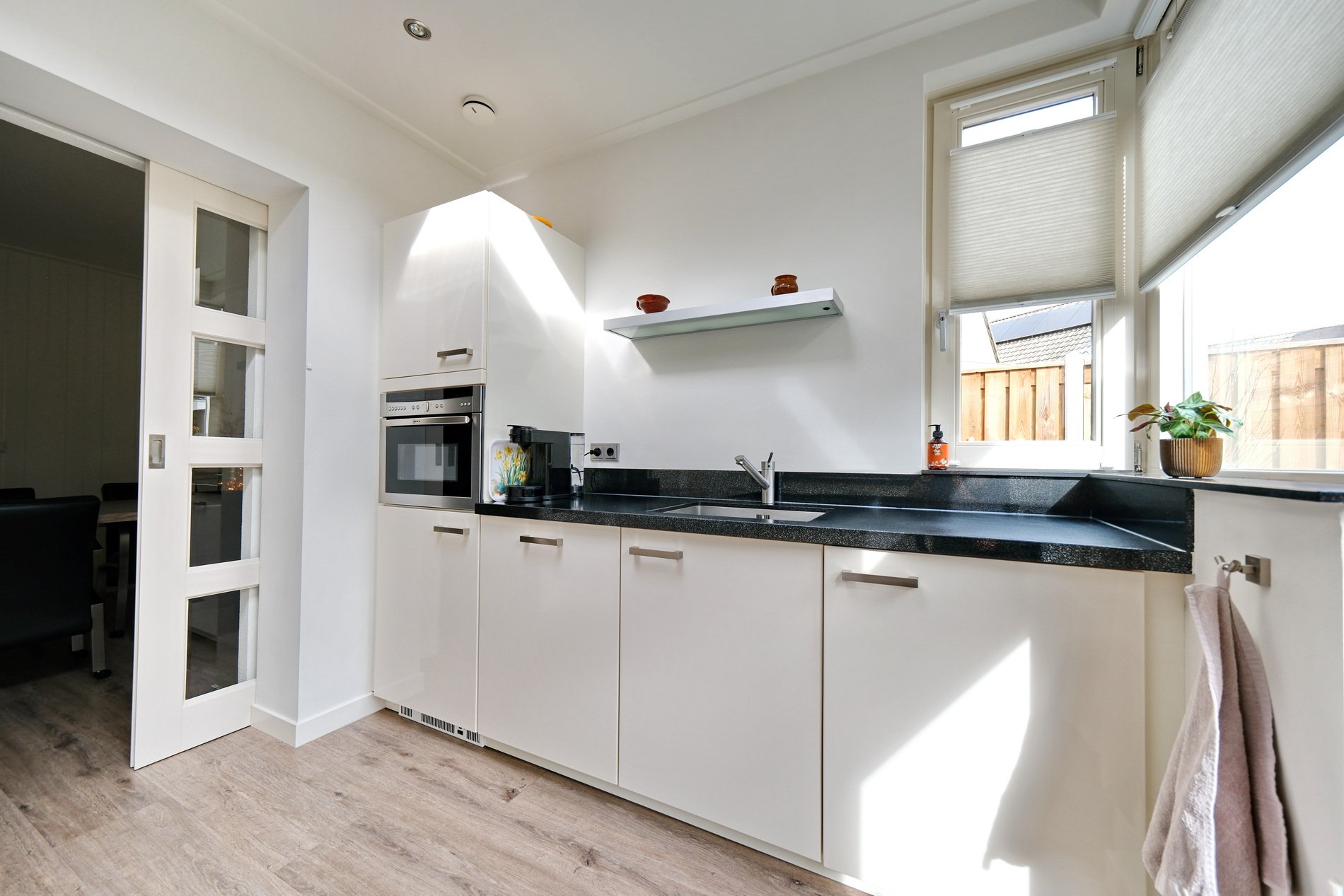 Er is plaats voor een gezellige zithoek en aansluitend een eethoek. Een praktische provisieruimte onder de trap. Via ensuite deuren naar de aangrenzende keuken. Dit is een prachtige lichte ruimte door de dakkoepel en is ingericht met een keukenblok in twee rechte delen en voorzien van inbouwapparatuur als een inductiekookplaat met afzuigkap, koel/vriescombinatie, vaatwasser en combimagnetron. Deur naar de tuin. Alle raambekleding blijft achter, er ligt een fraaie PVC vloer met vloerverwarming en er is diverse zonwering.