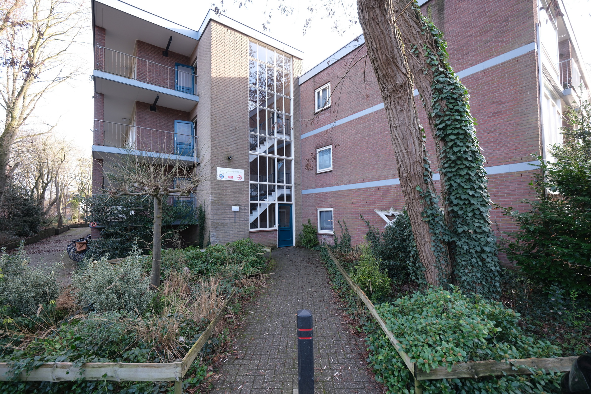 Gezamenlijke hoofdentree met brievenbussen, trappenhuis en een handige privberging in de afgesloten onderbouw.