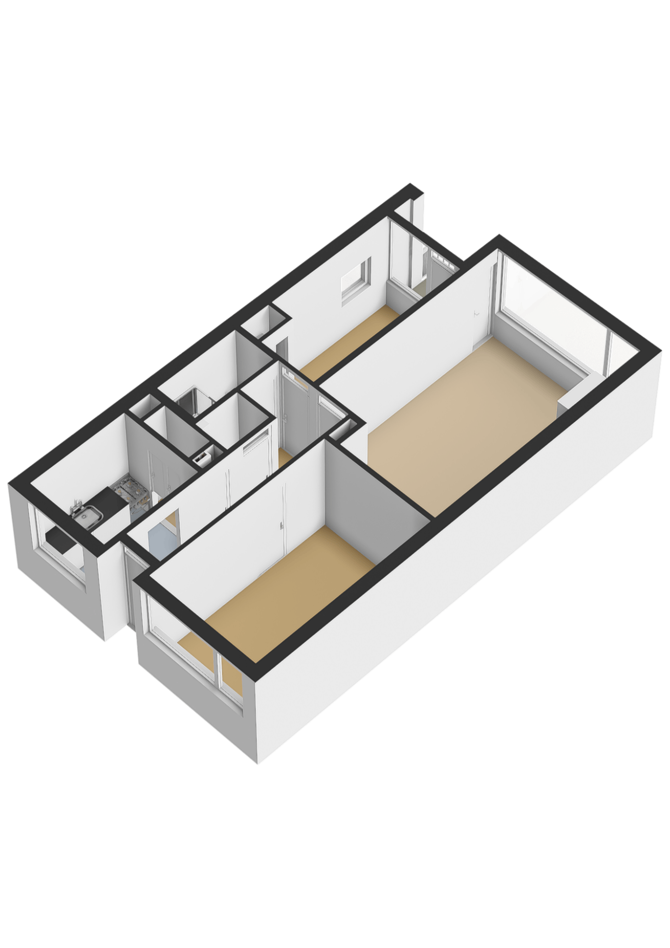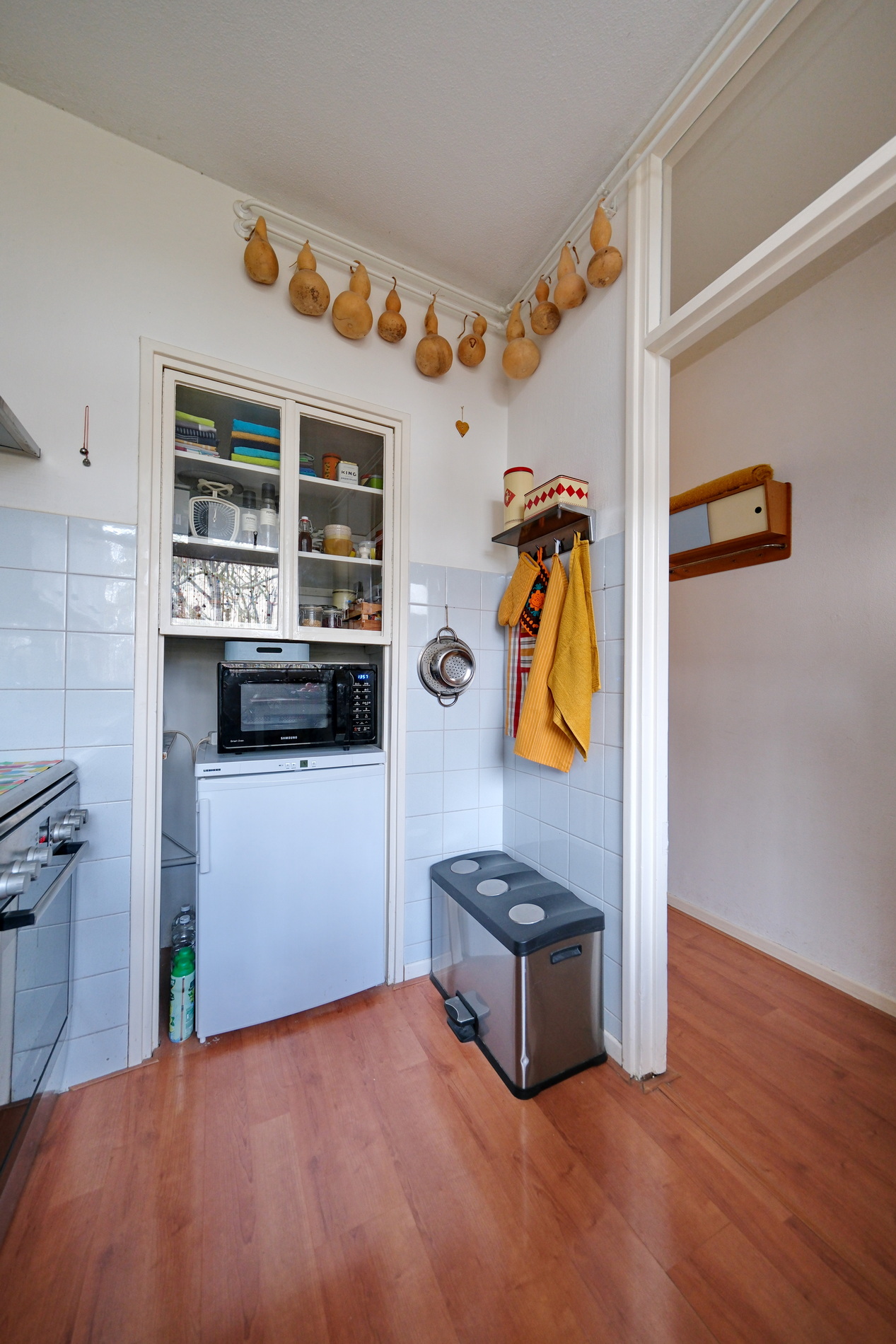 Je komt binnen in een hal die toegang biedt tot alle vertrekken. De keuken bevindt zich aan de galerijzijde en is uitgerust met een rechte opstelling met gaskookplaat, oven, recirculatiekap, praktische bergruimte en een wasmachineaansluiting.