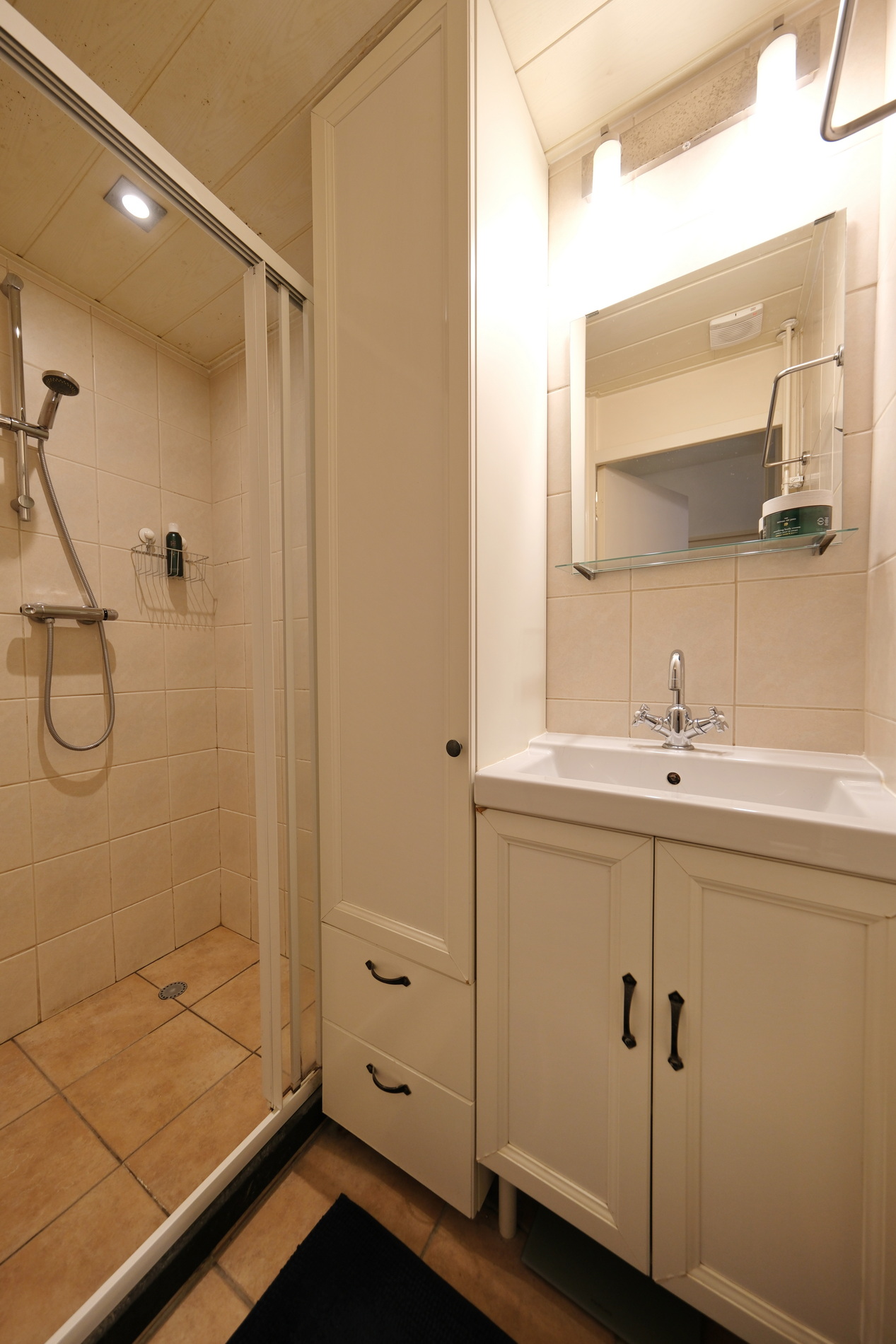 De badkamer is voorzien van een douchecabine met thermostaatkraan, wastafelmeubel en mechanische ventilatie. Het toilet bevindt zich separaat.