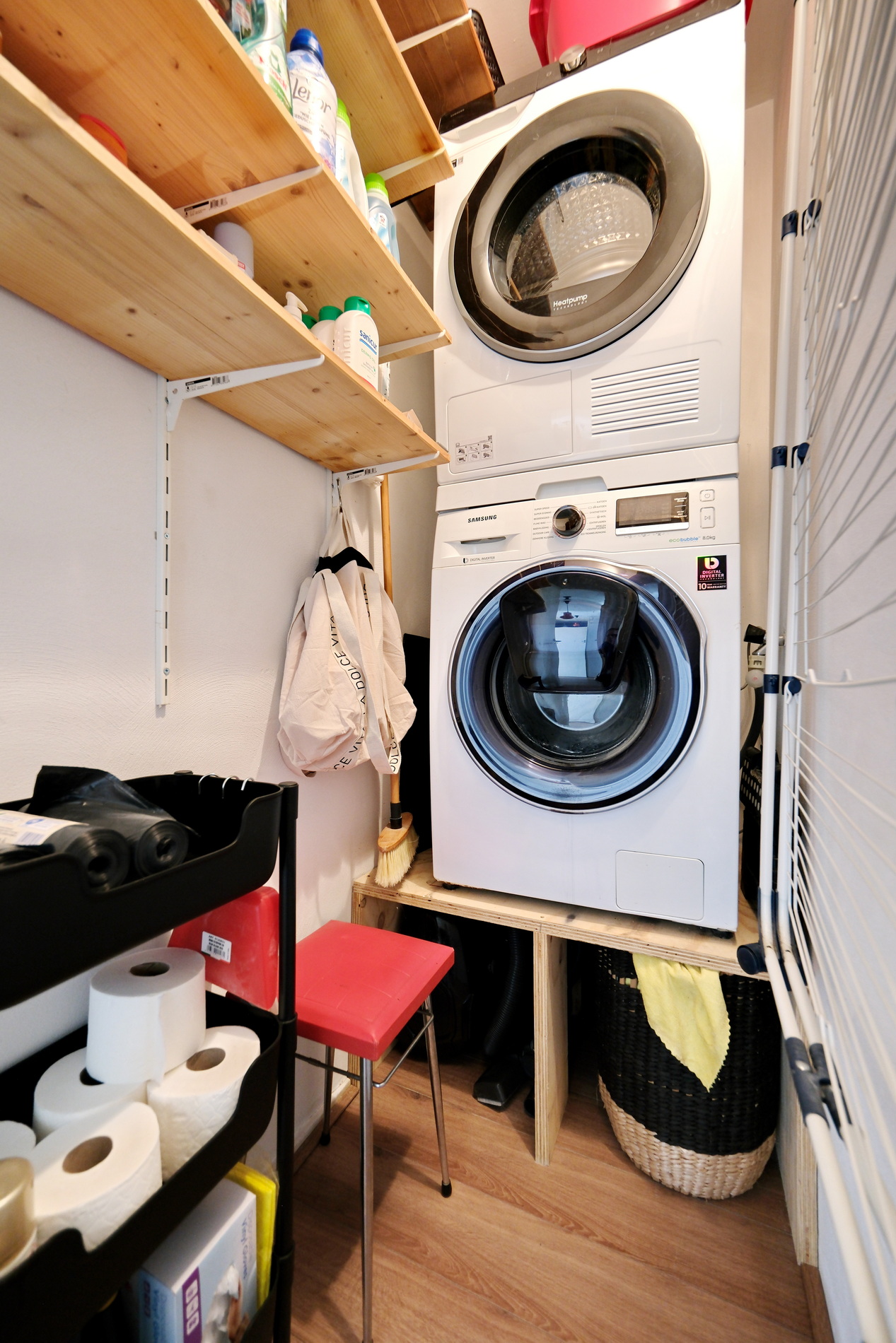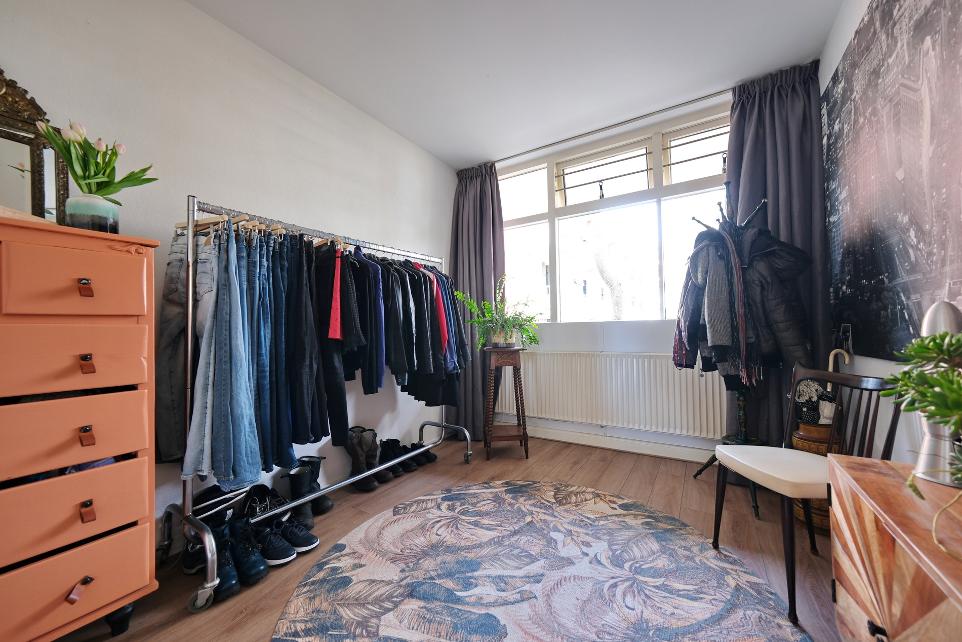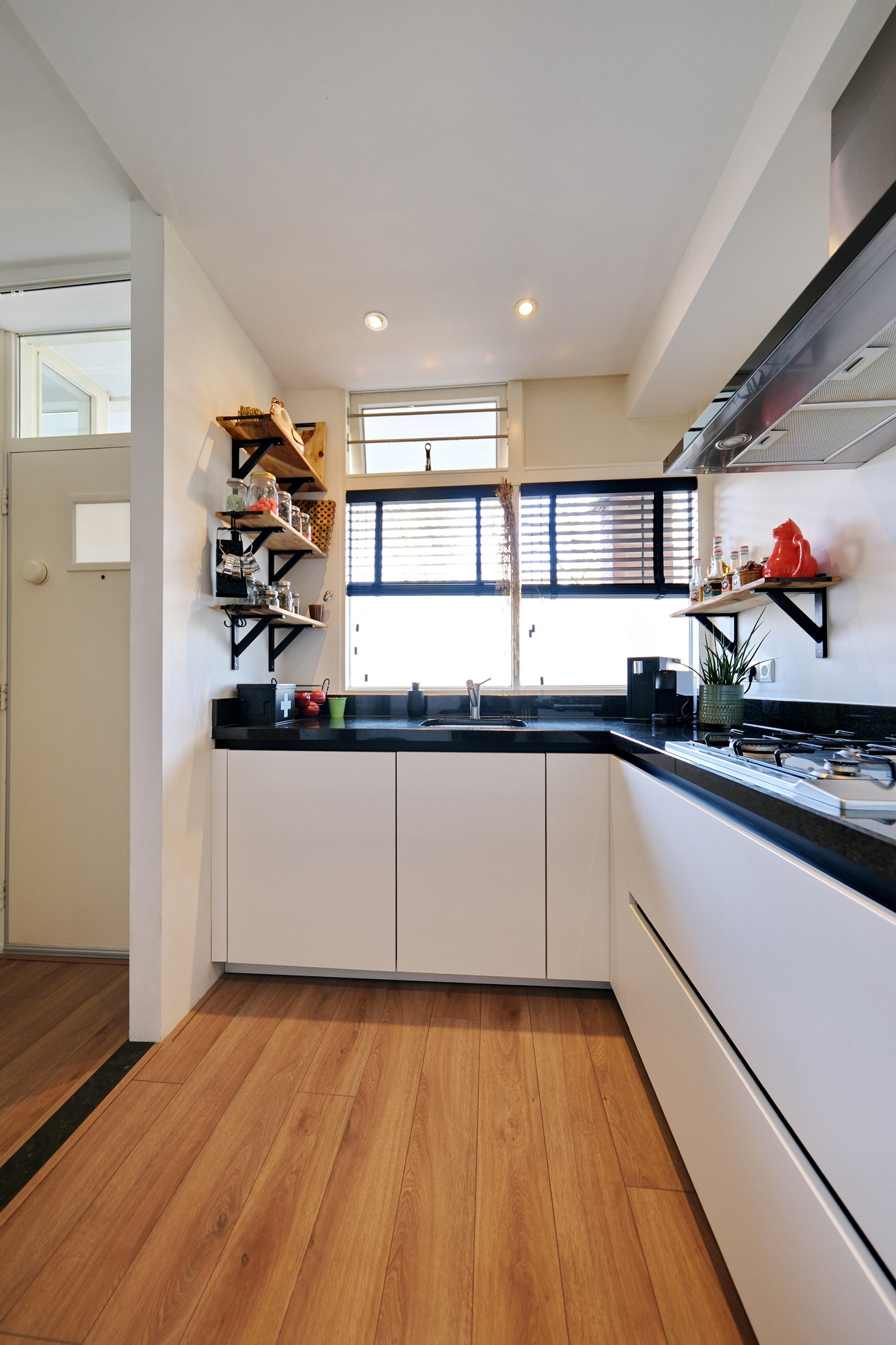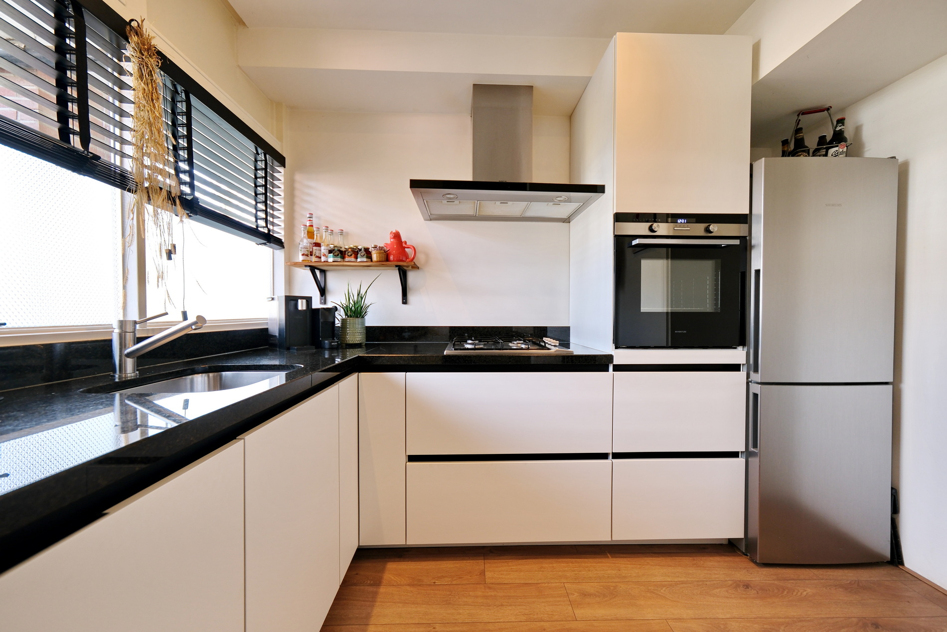 Dichte keuken aan de galerijzijde met een modern keukenblok dat voorzien is van een gaskookplaat, afzuigkap, een vaatwasser en oven. De losse koel/vriescombinatie wordt hierbij ter overname aangeboden. Ruimte in diverse kasten en lades om keukenspullen op te bergen. De CV-ketel is netjes weggewerkt in een kast.