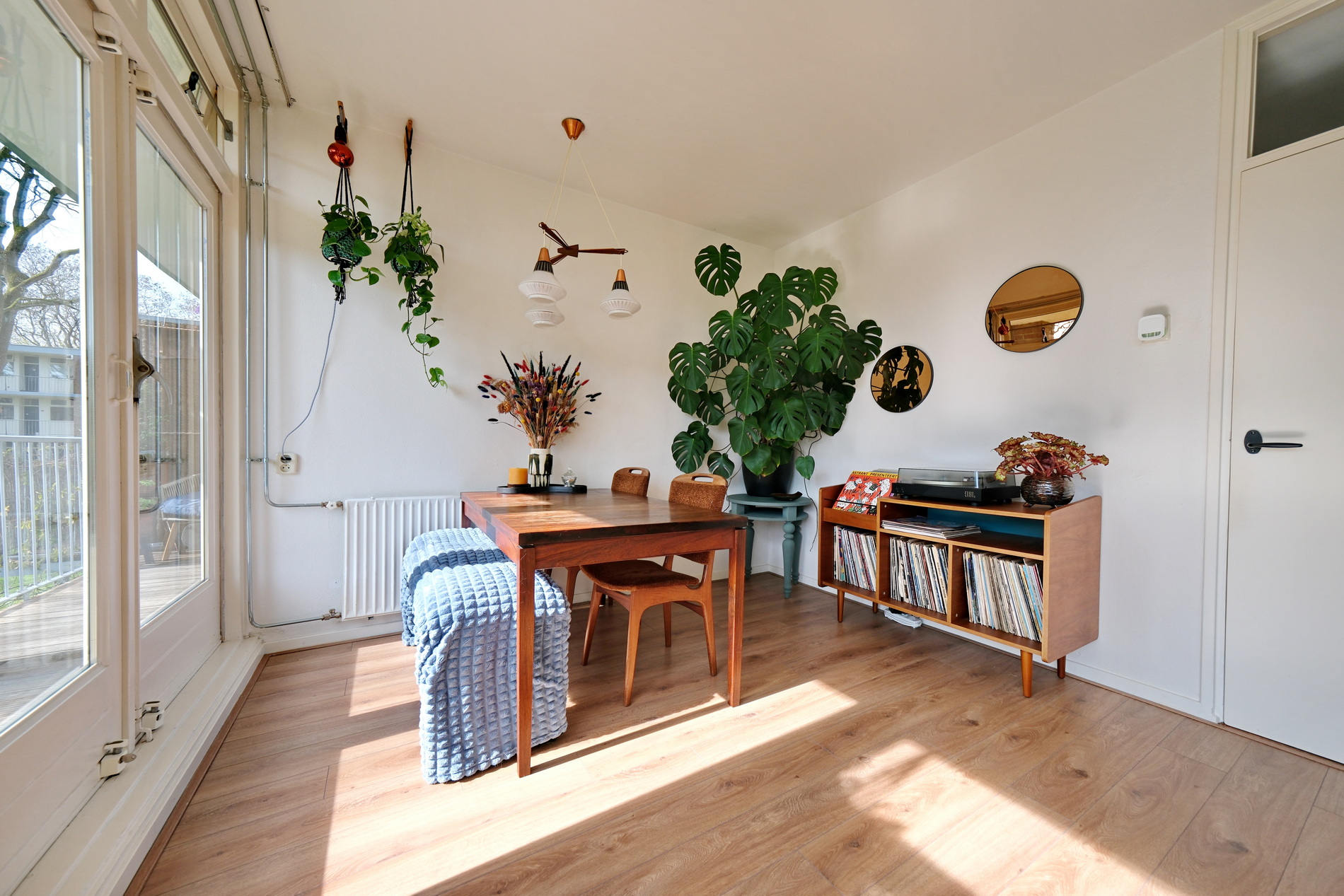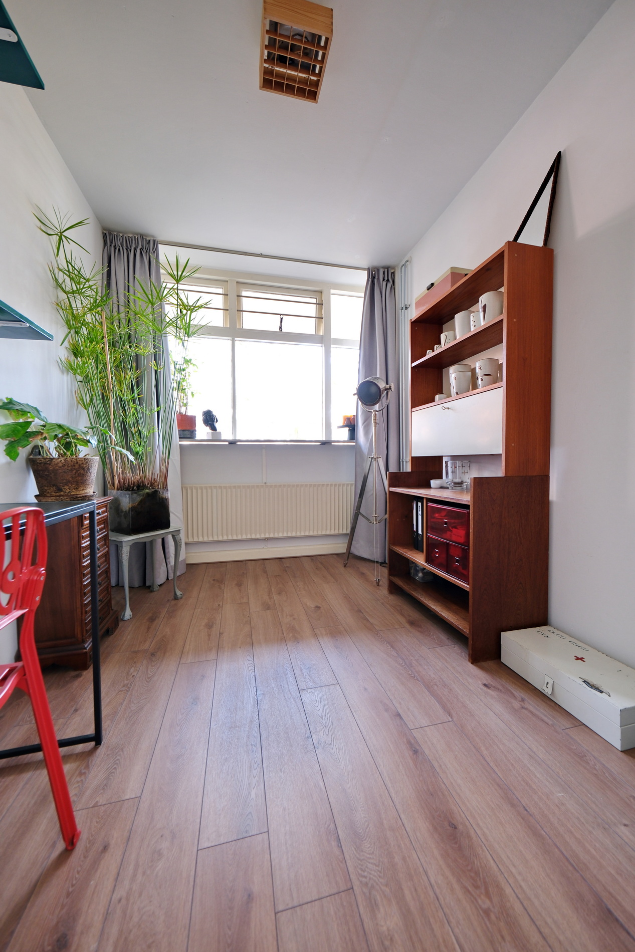 Heerlijk lichte woonkamer met een grote pui voorzien van dubbel glas en toegang tot het balkon via de openslaande deuren. Er is plaats voor een gezellige zithoek en een eettafel. In het gehele appartement ligt een nette laminaatvloer.