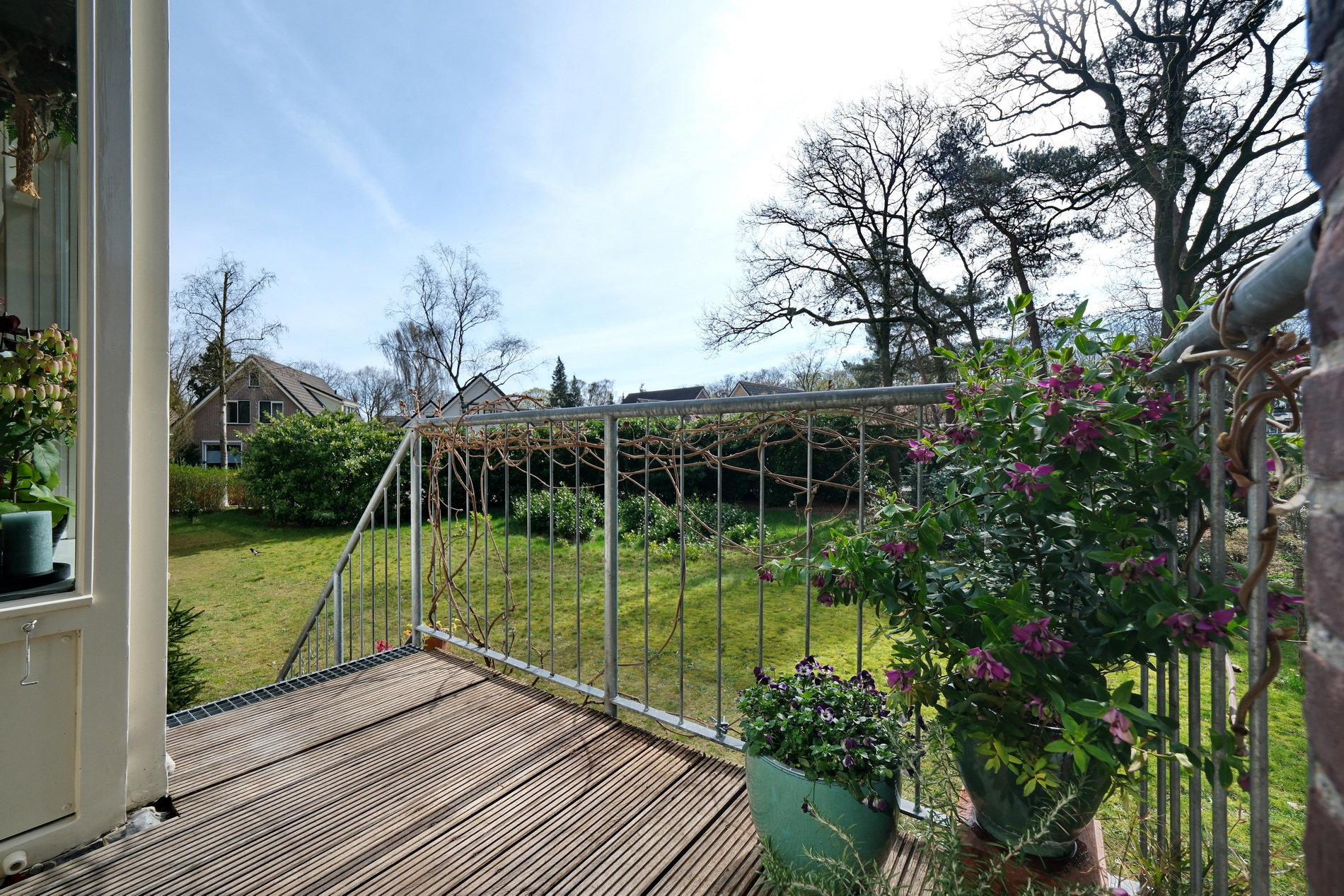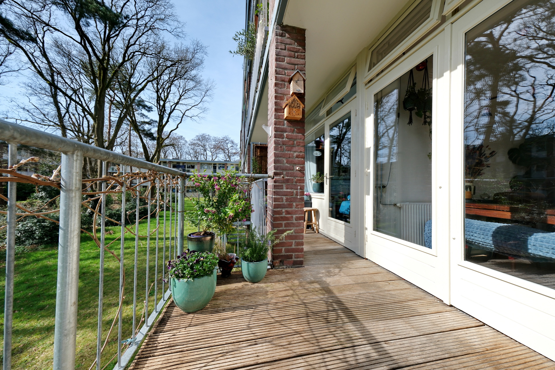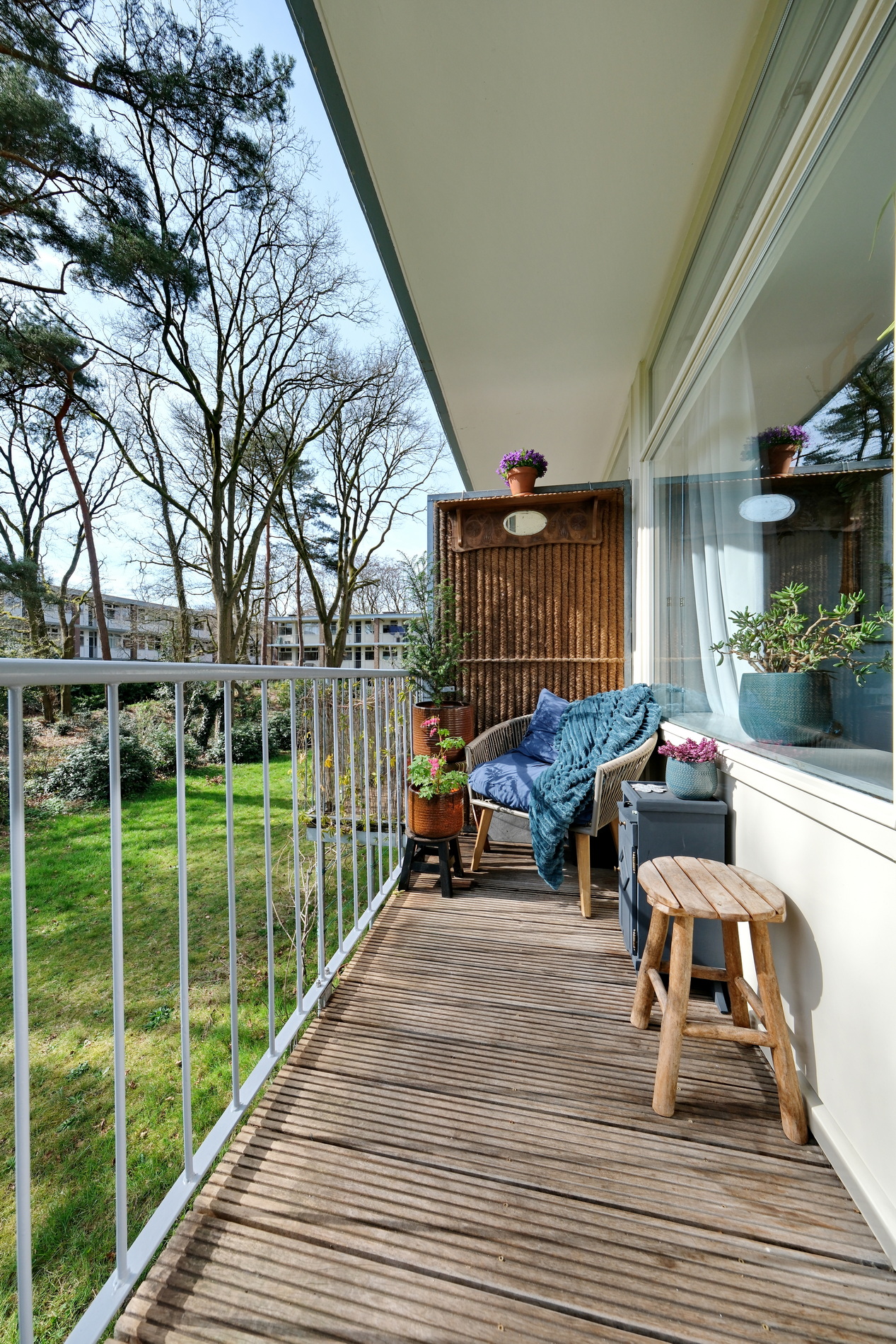 Een heerlijk balkon om buiten te zitten dat grenst aan een bosperceel. Hierdoor kijk je lekker weg in het groen en kun je ook nog van de zon genieten. Een trapje geeft direct toegang tot de gezamenlijke tuin.