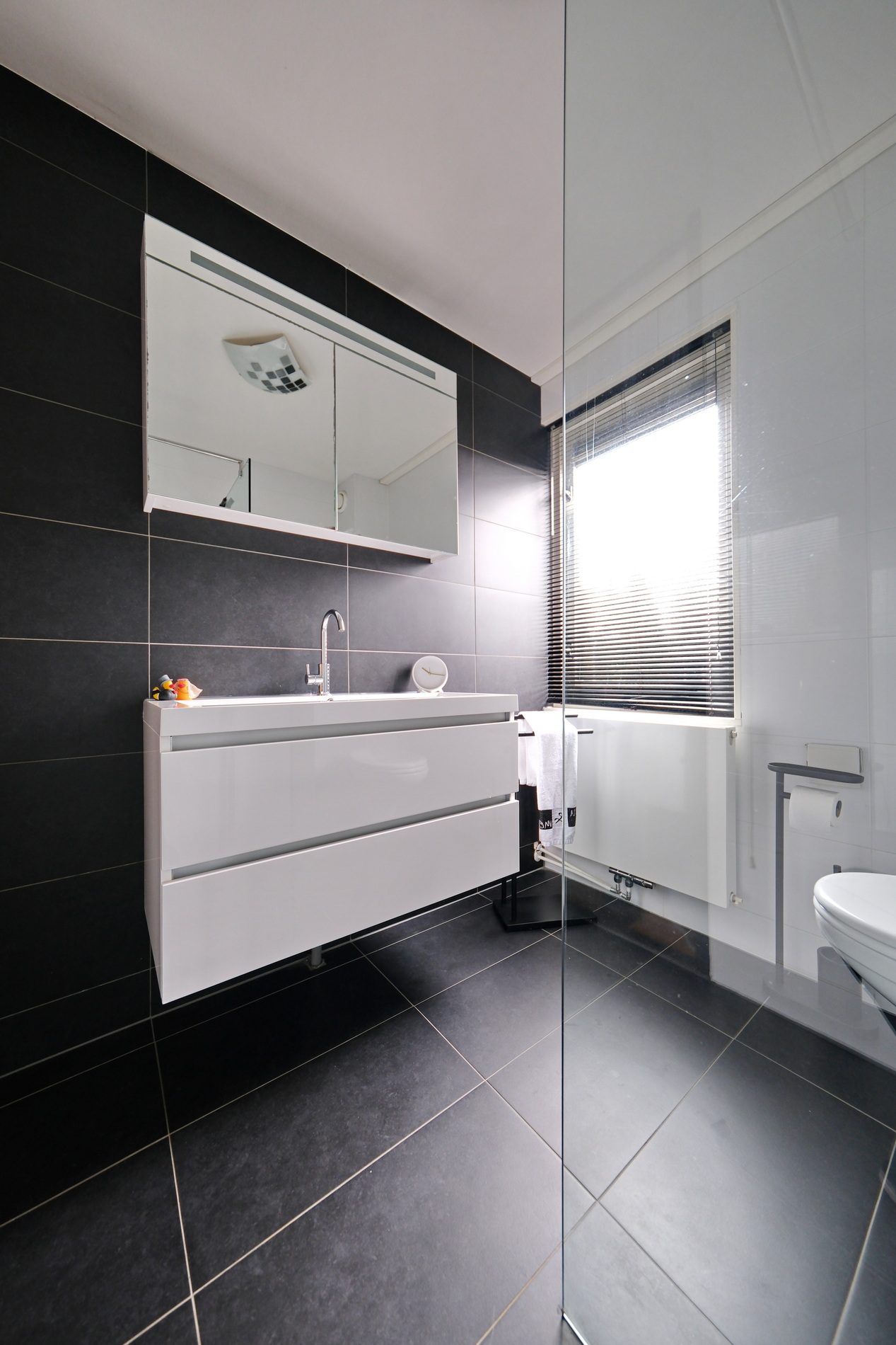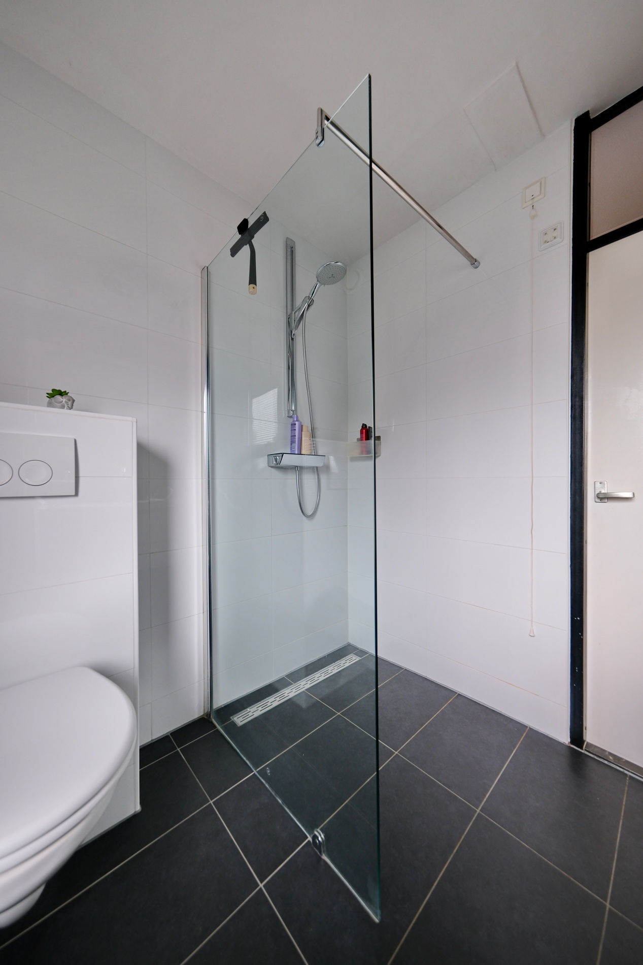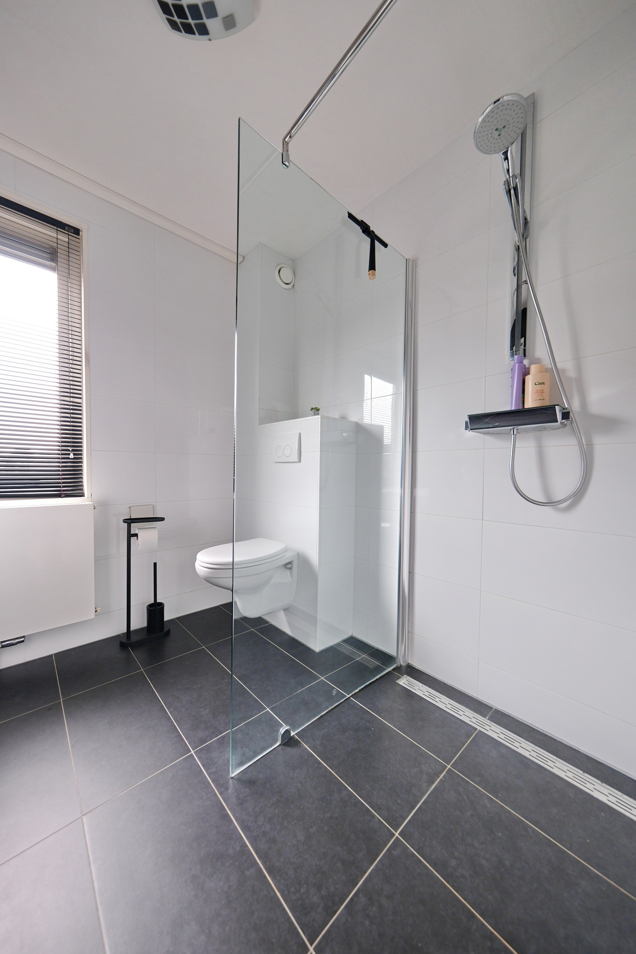 De badkamer is ingericht met een inloopdouche, wastafelmeubel en een 2e toilet. Deze ruimte heeft een raam voor natuurlijke ventilatie en daglicht.