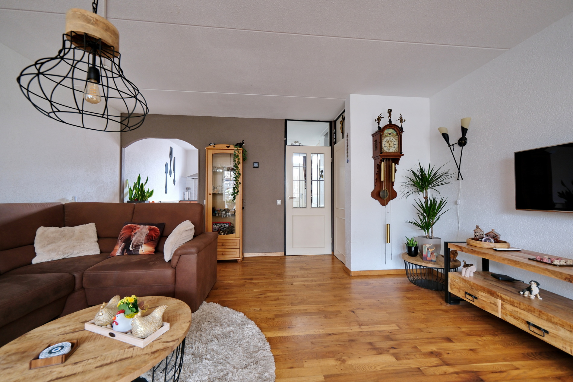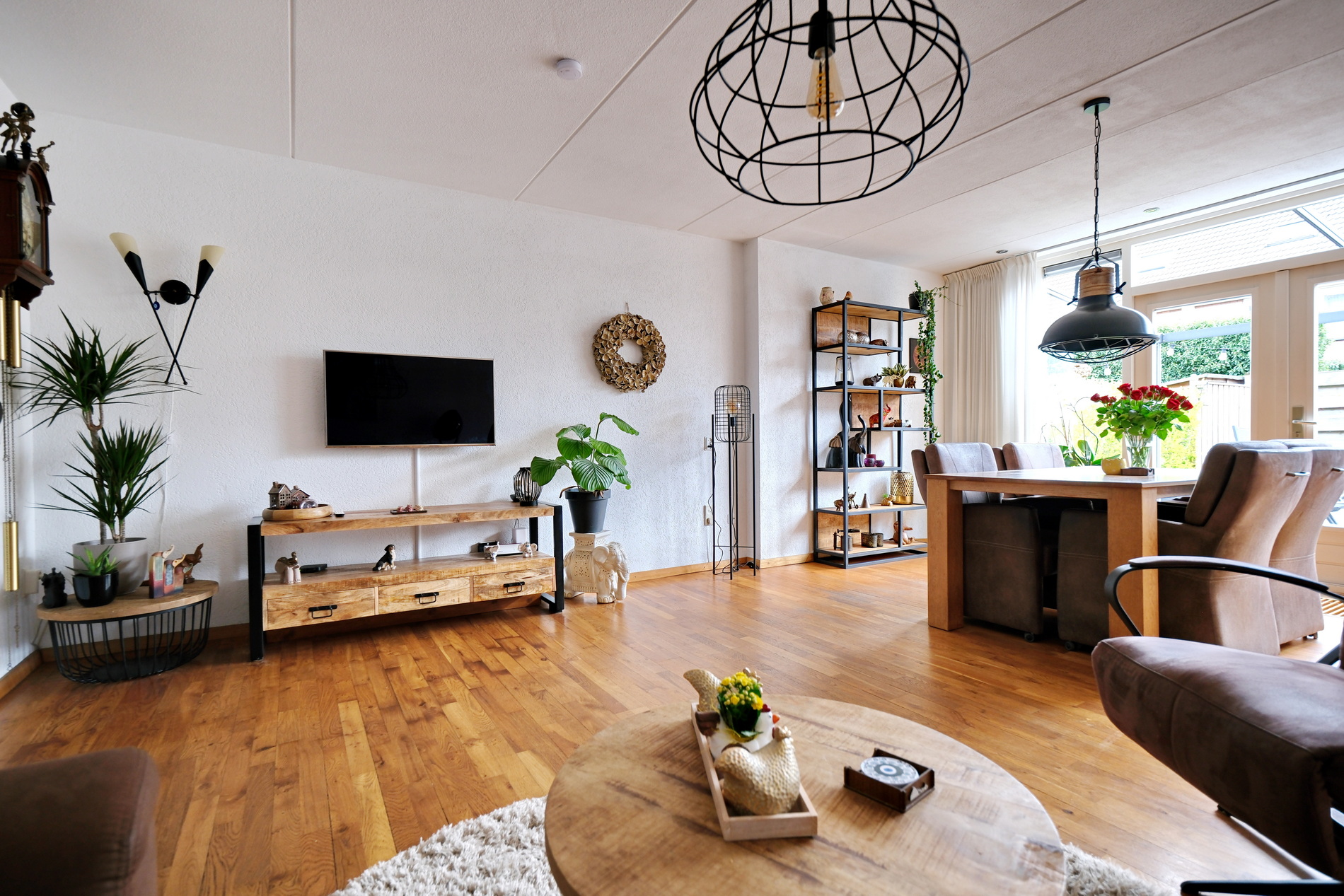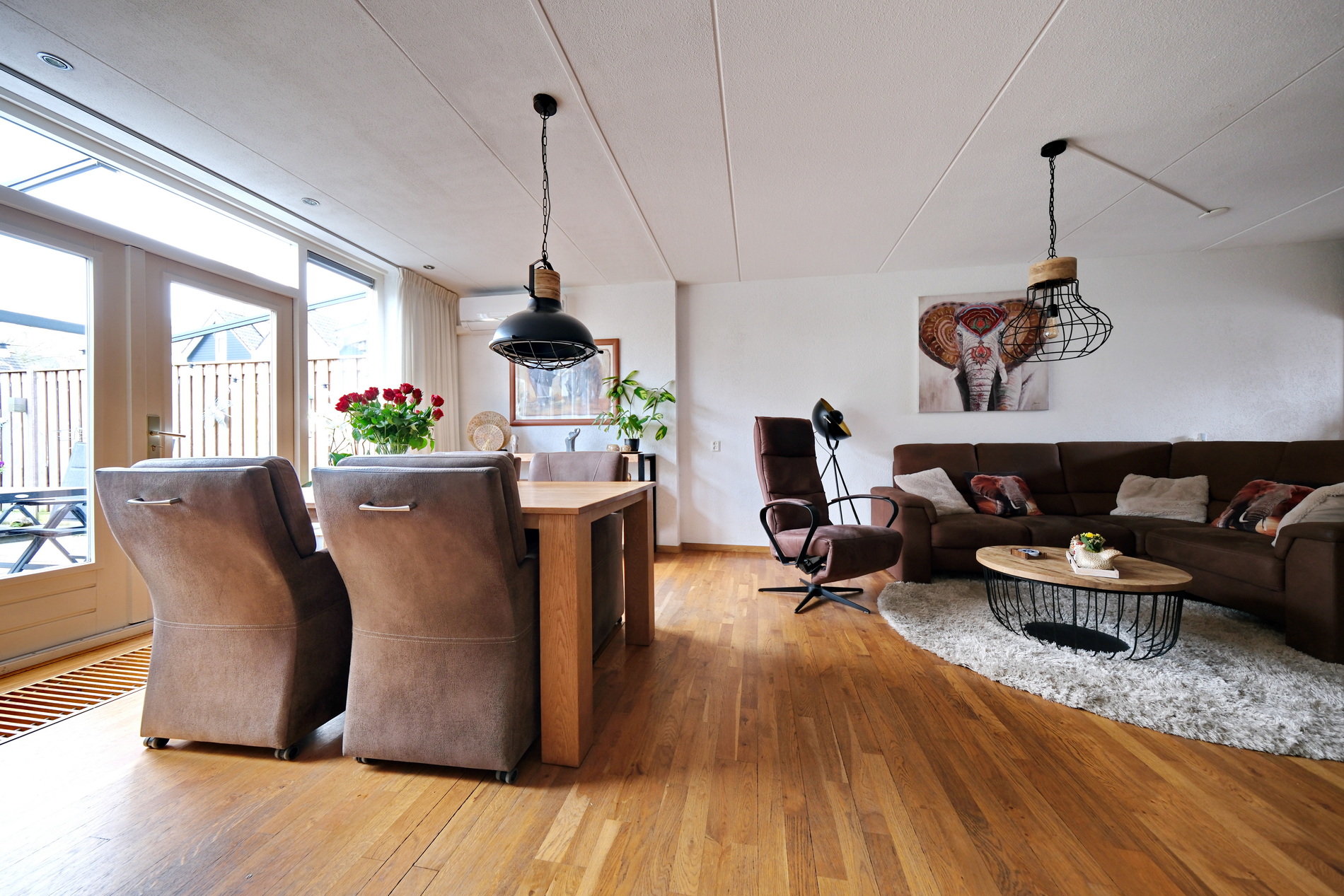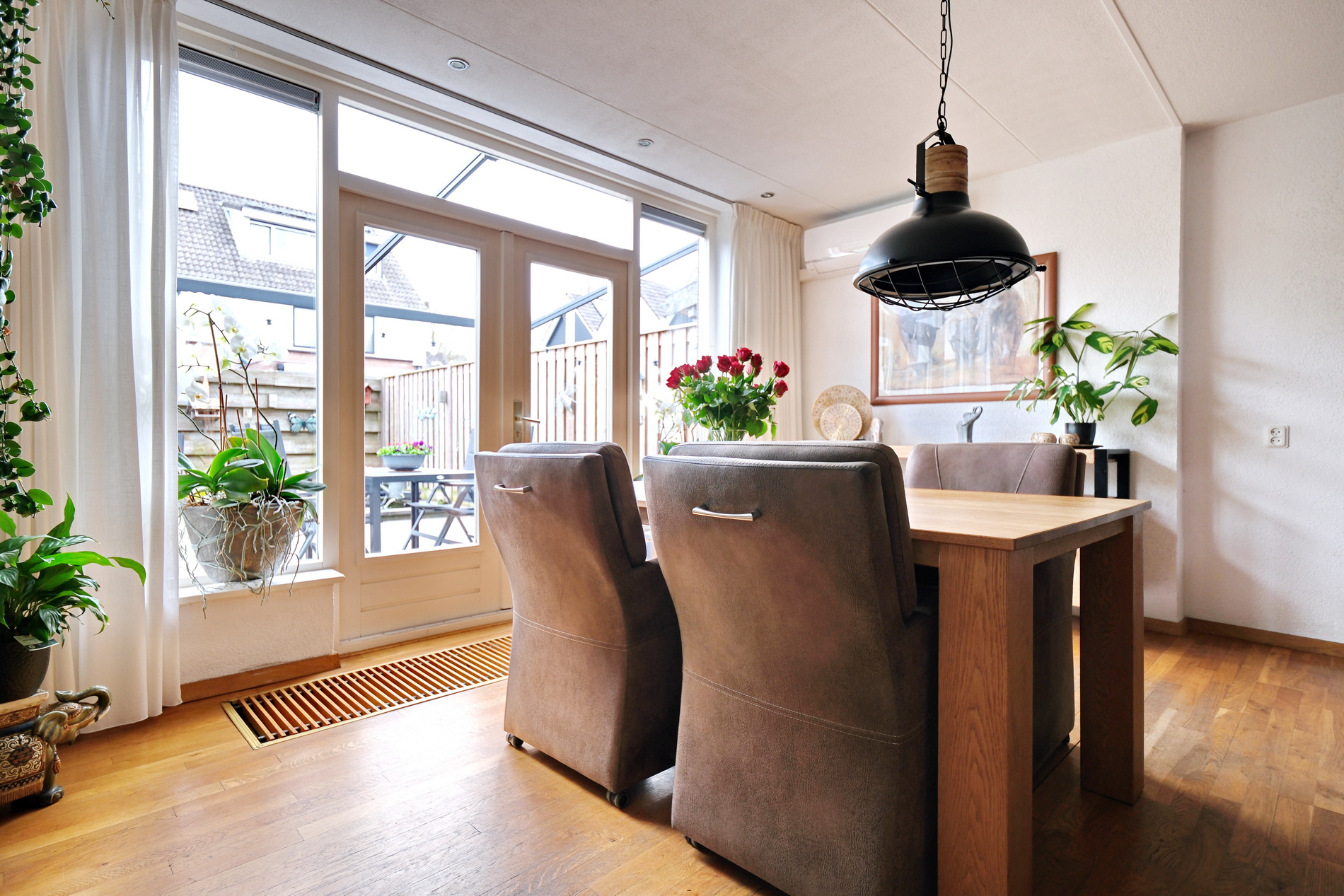 De tuingerichte woonkamer is heerlijk licht. Een praktische trapkast biedt ruimte voor het opbergen van diverse spullen.