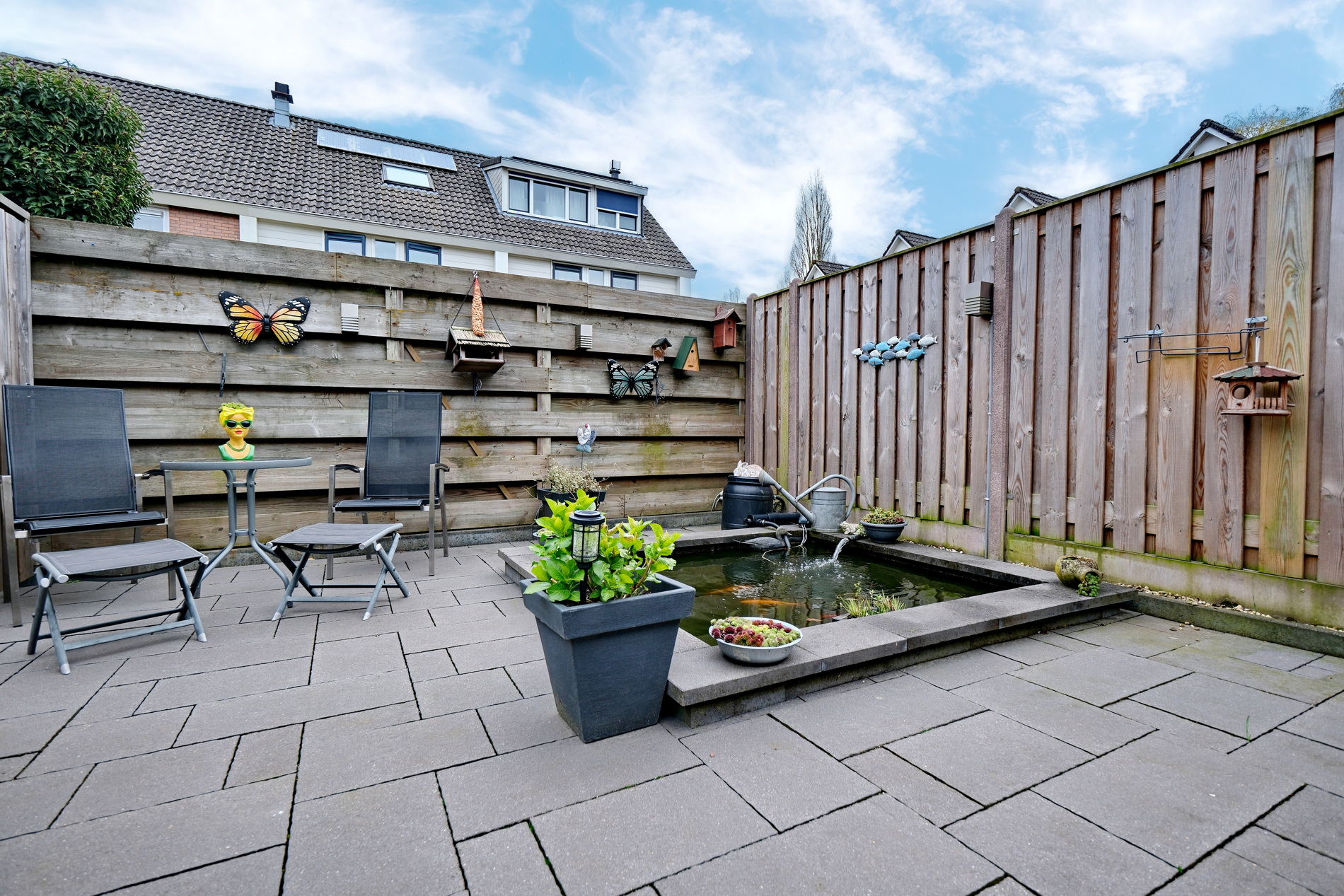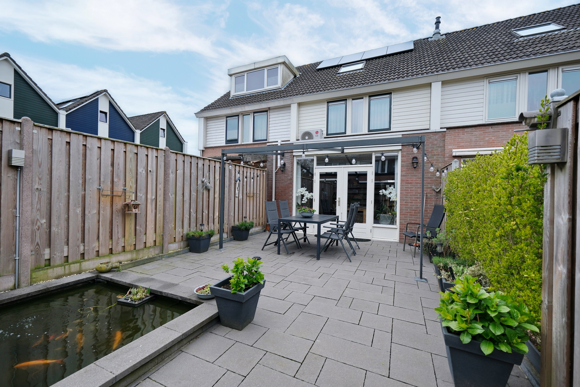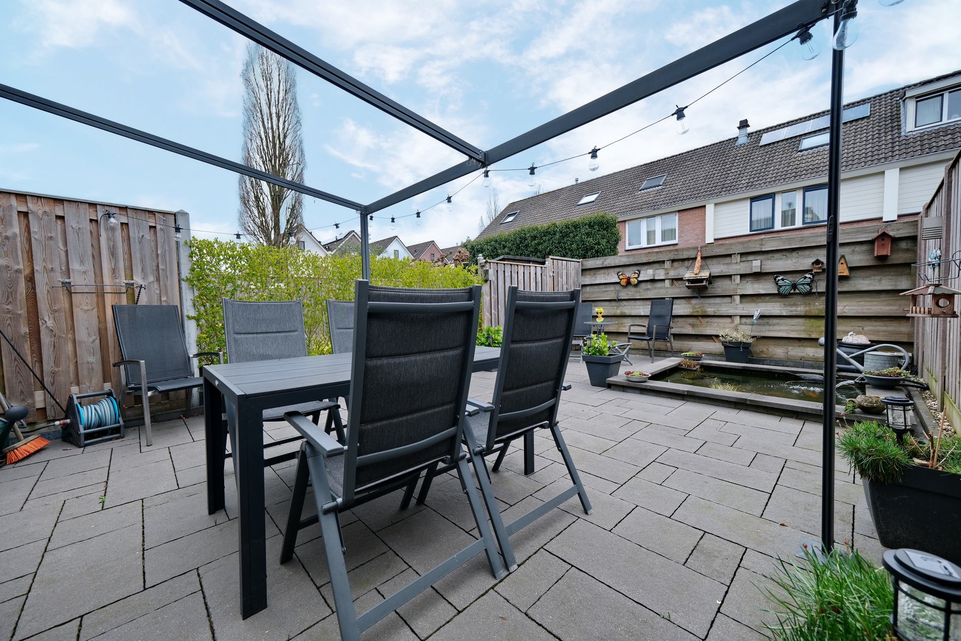 De tuin is voorzien van sierbestrating, verandaluifel en een vijver. Ook is de tuin achterom bereikbaar.