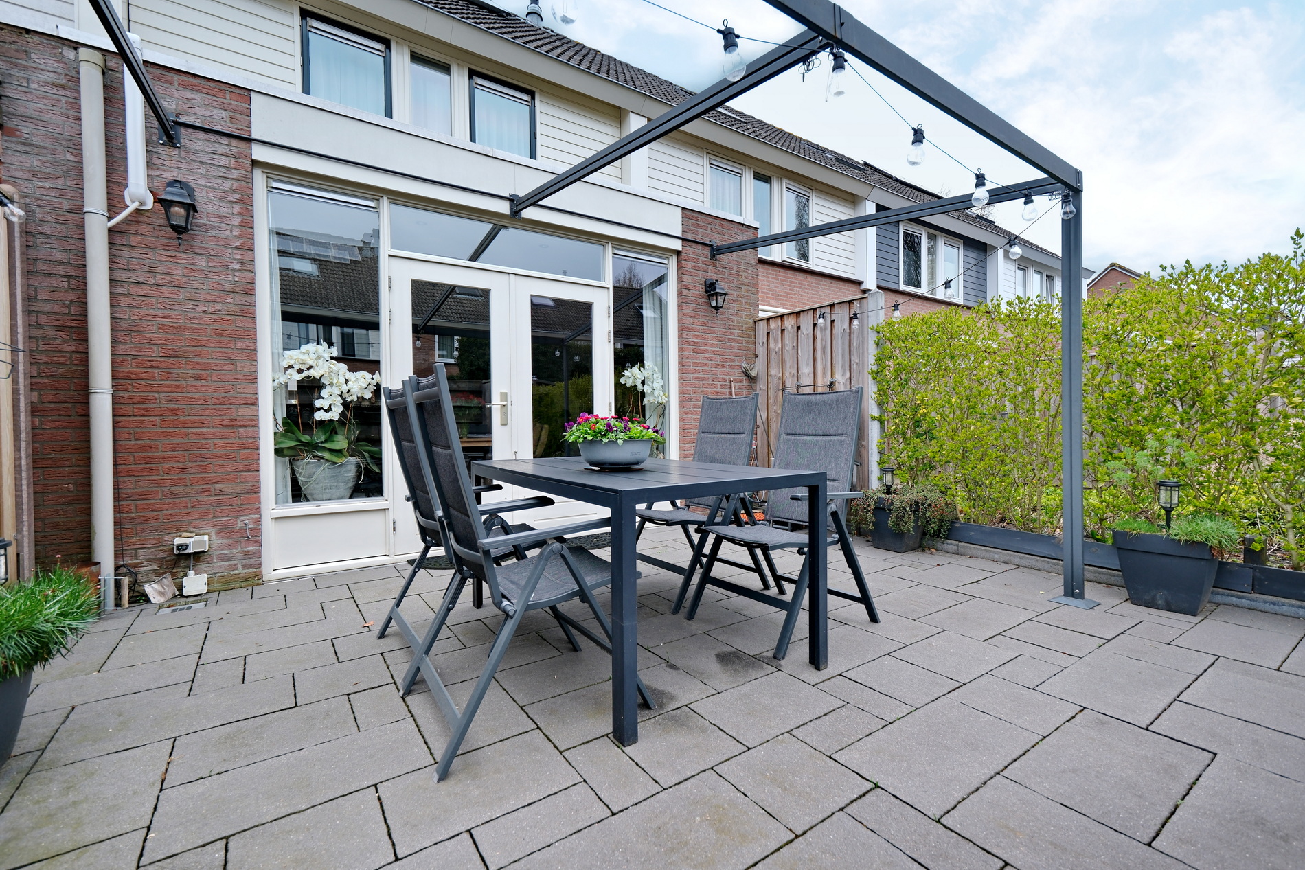 * Besloten tuin op het oosten met een luifel als zonwering en aangelegd met sierbestrating. Achterom bereikbaar.