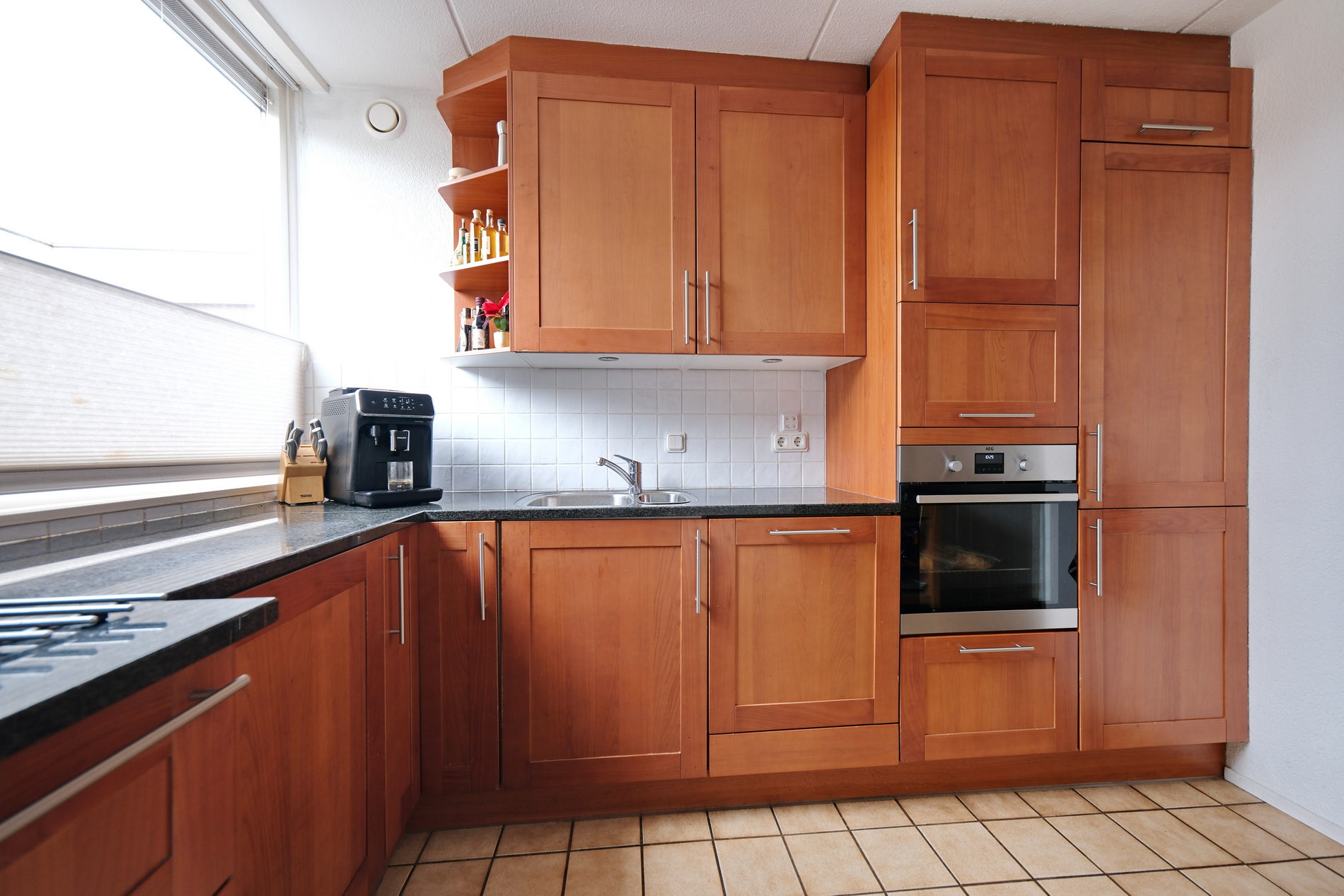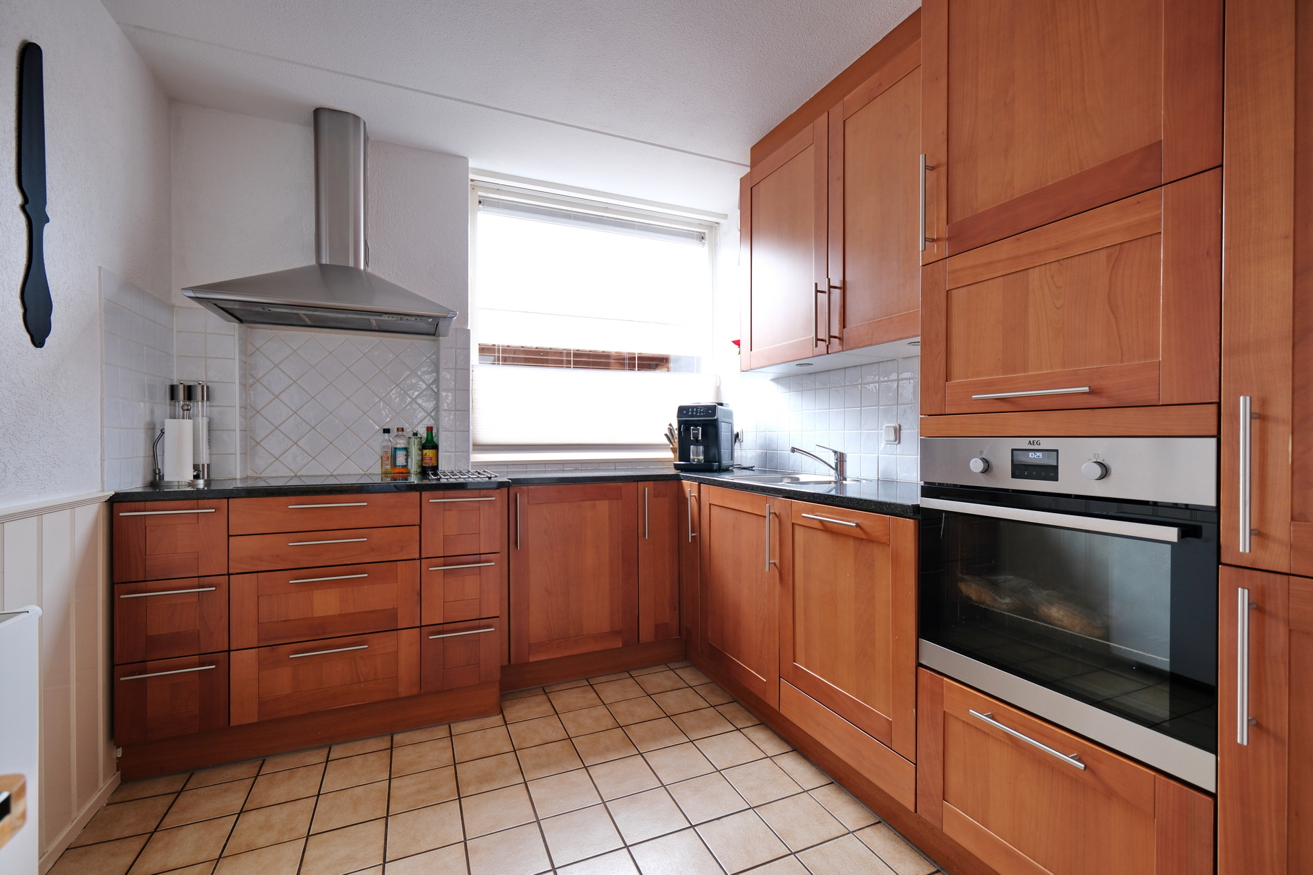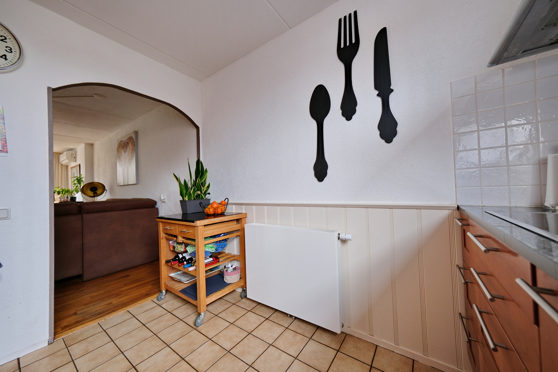 Half open keuken in een L-opstelling beschikt een 4-pits keramische kookplaat met afzuigkap, vaatwasser, koel/vriescombinatie, oven, magnetron. Op de gehele begane grond ligt een fraaie parketvloer. Bij de uitbouw is een convector put, zodat er vrij uitzicht is over de tuin.
