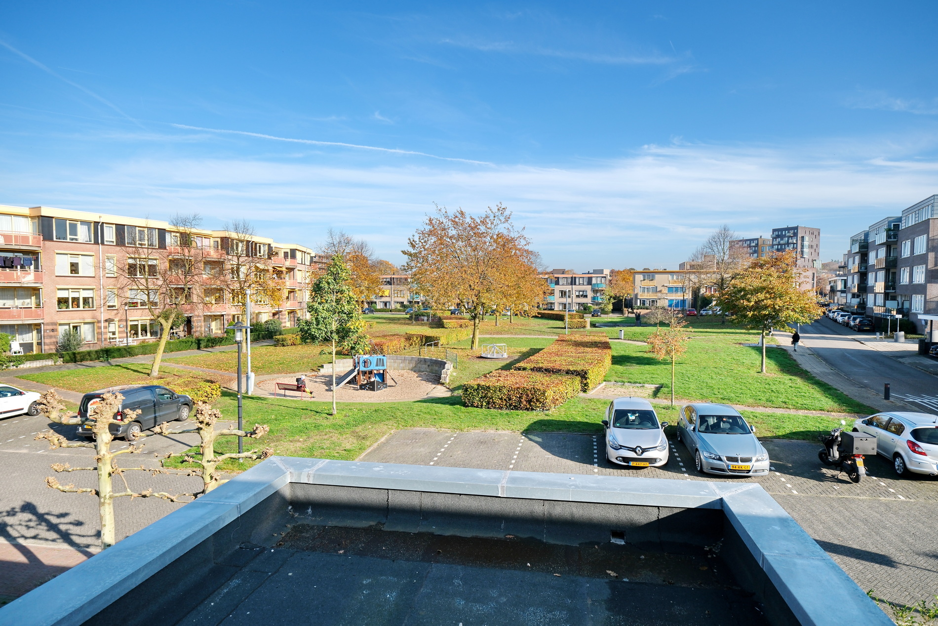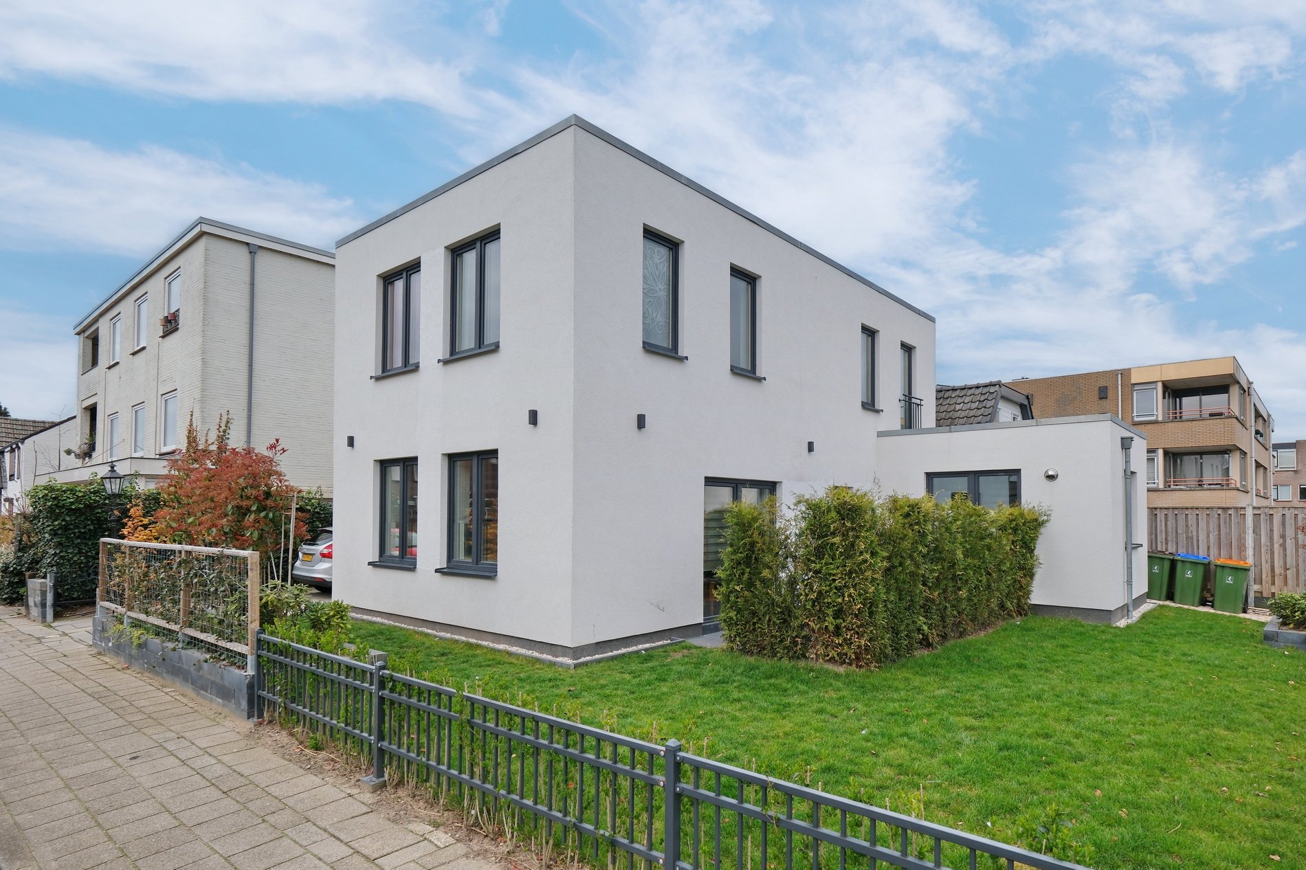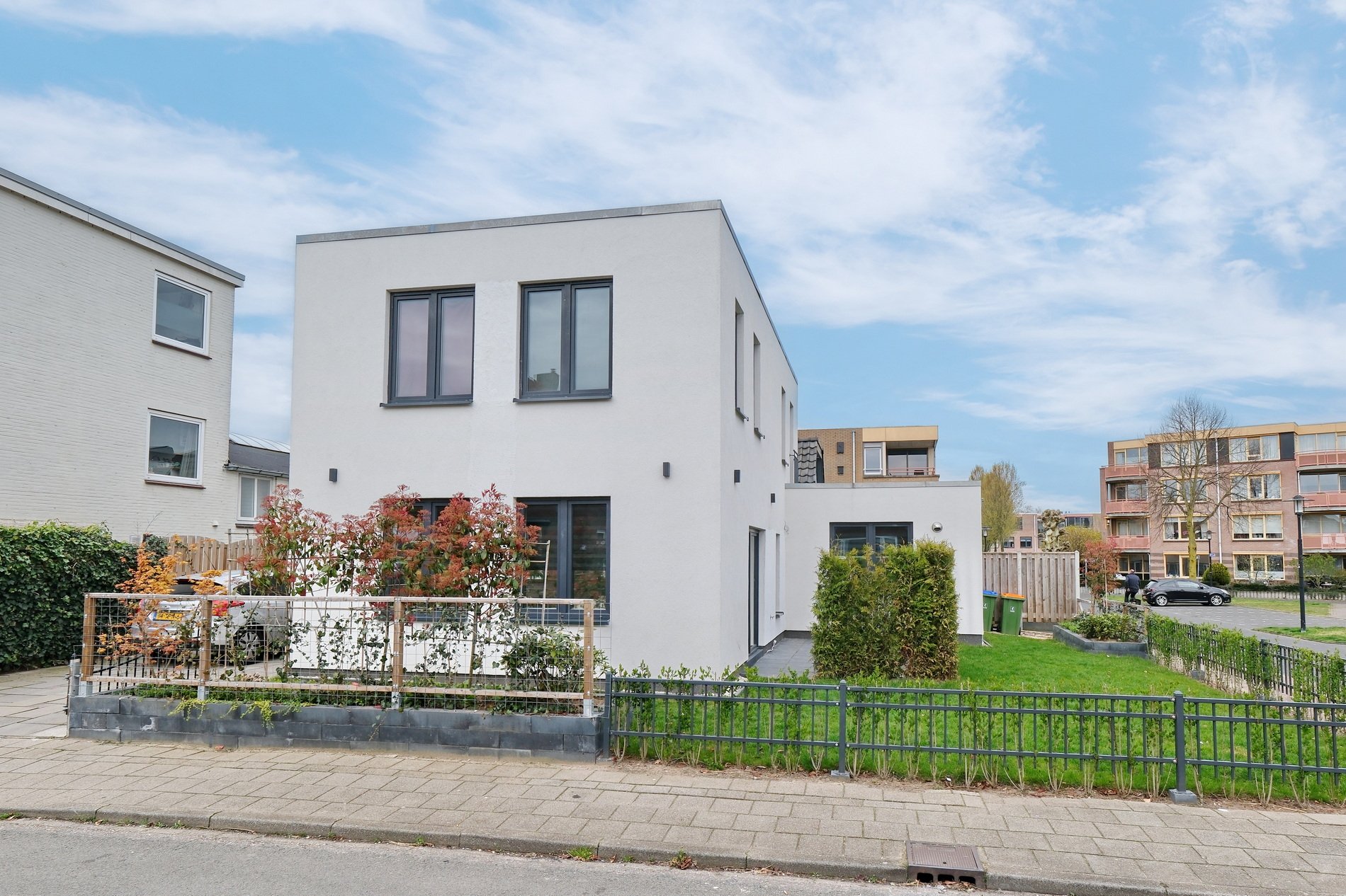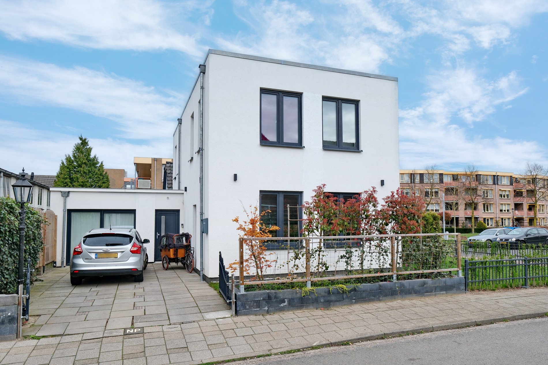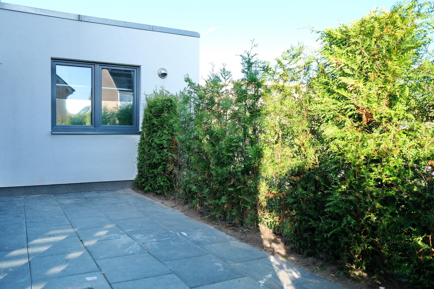 De voor- en zijtuin zijn keurig aangelegd en onderhoudsvrij. Parkeren kan op eigen terrein.