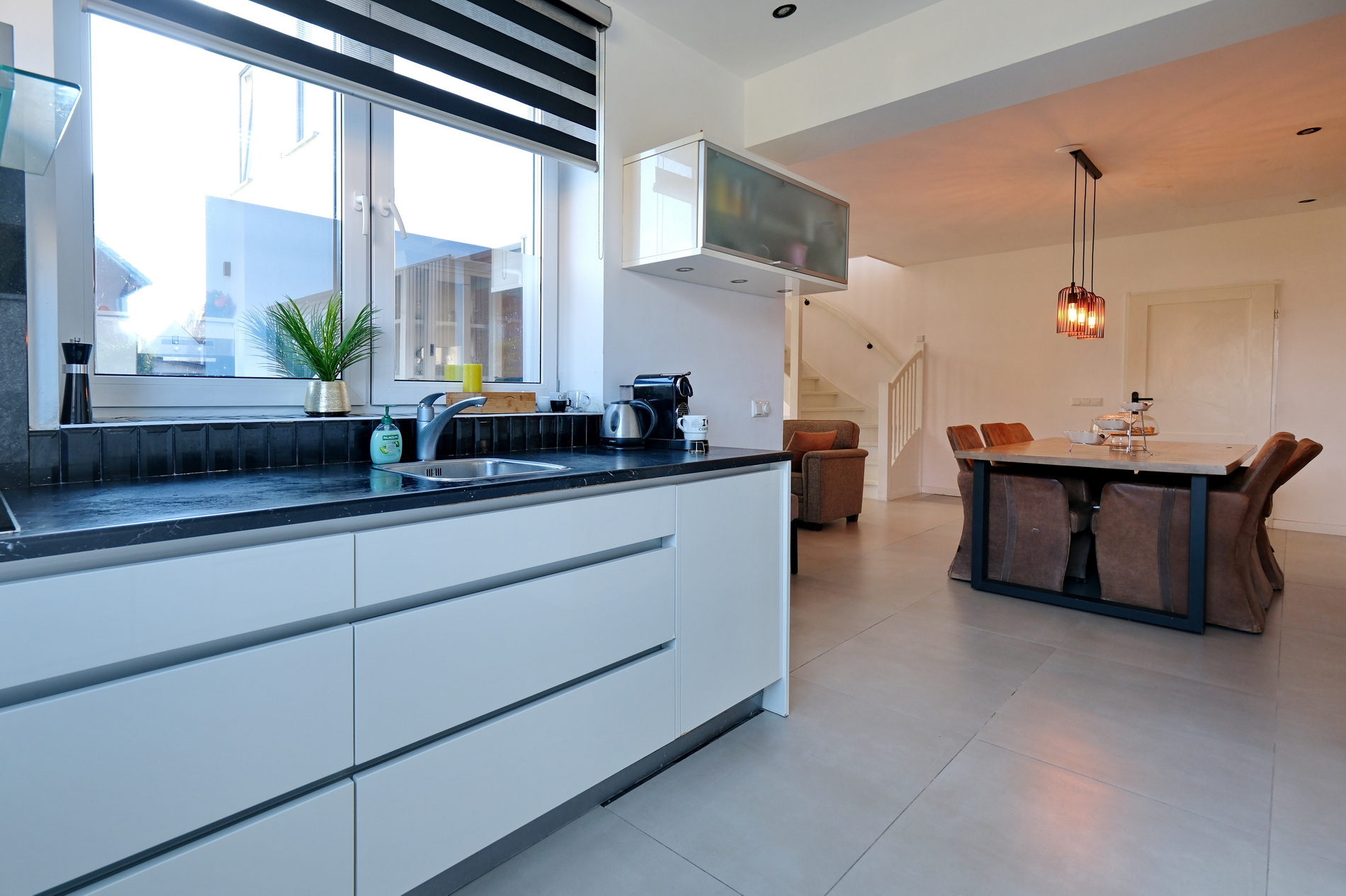 De moderne keuken is compleet uitgerust met een 4-pits inductiekookplaat, afzuigkap, koelkast, vriezer, vaatwasser en combimagnetron.