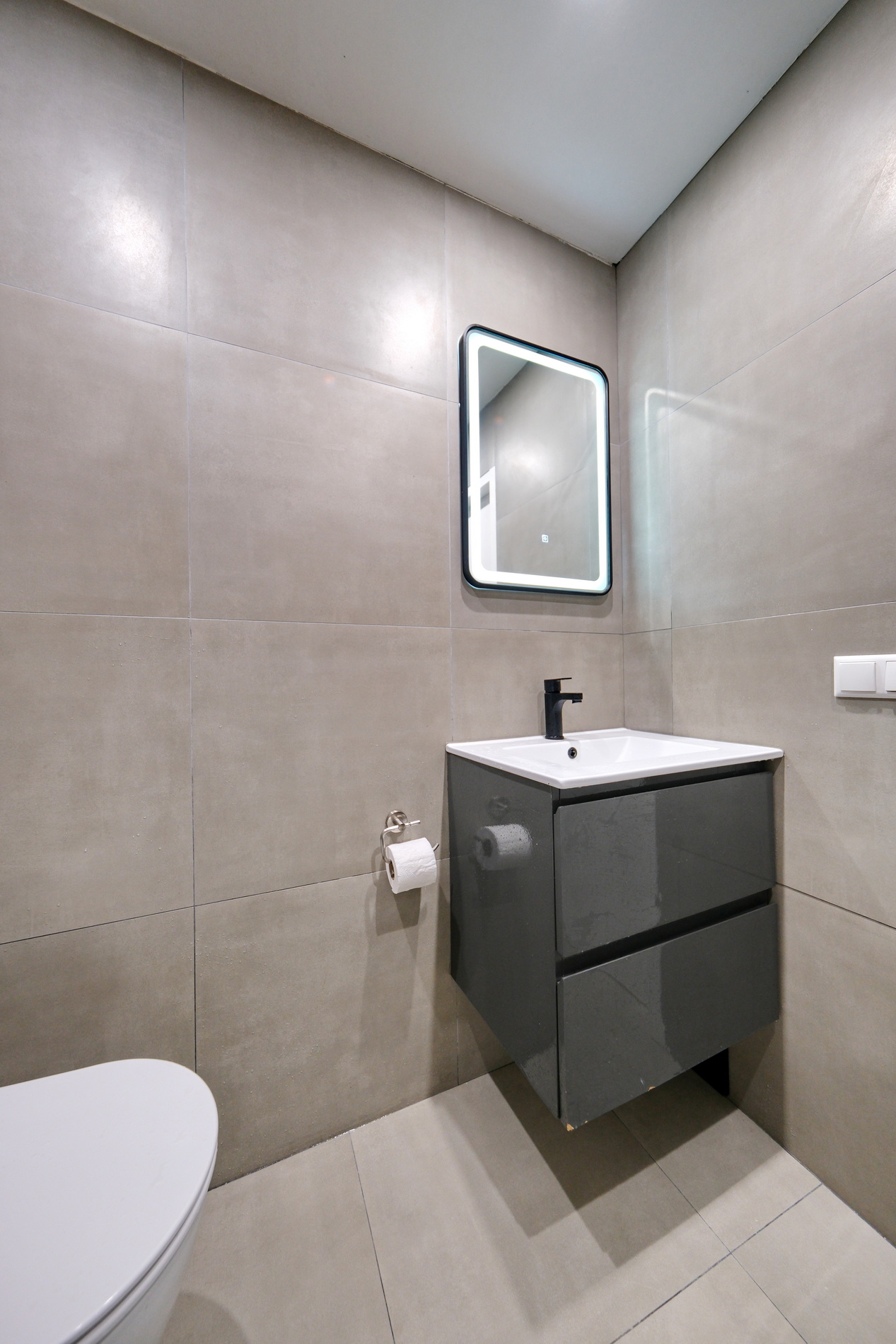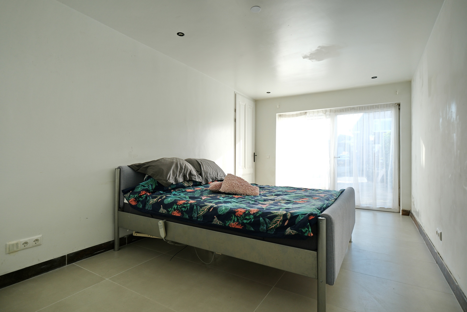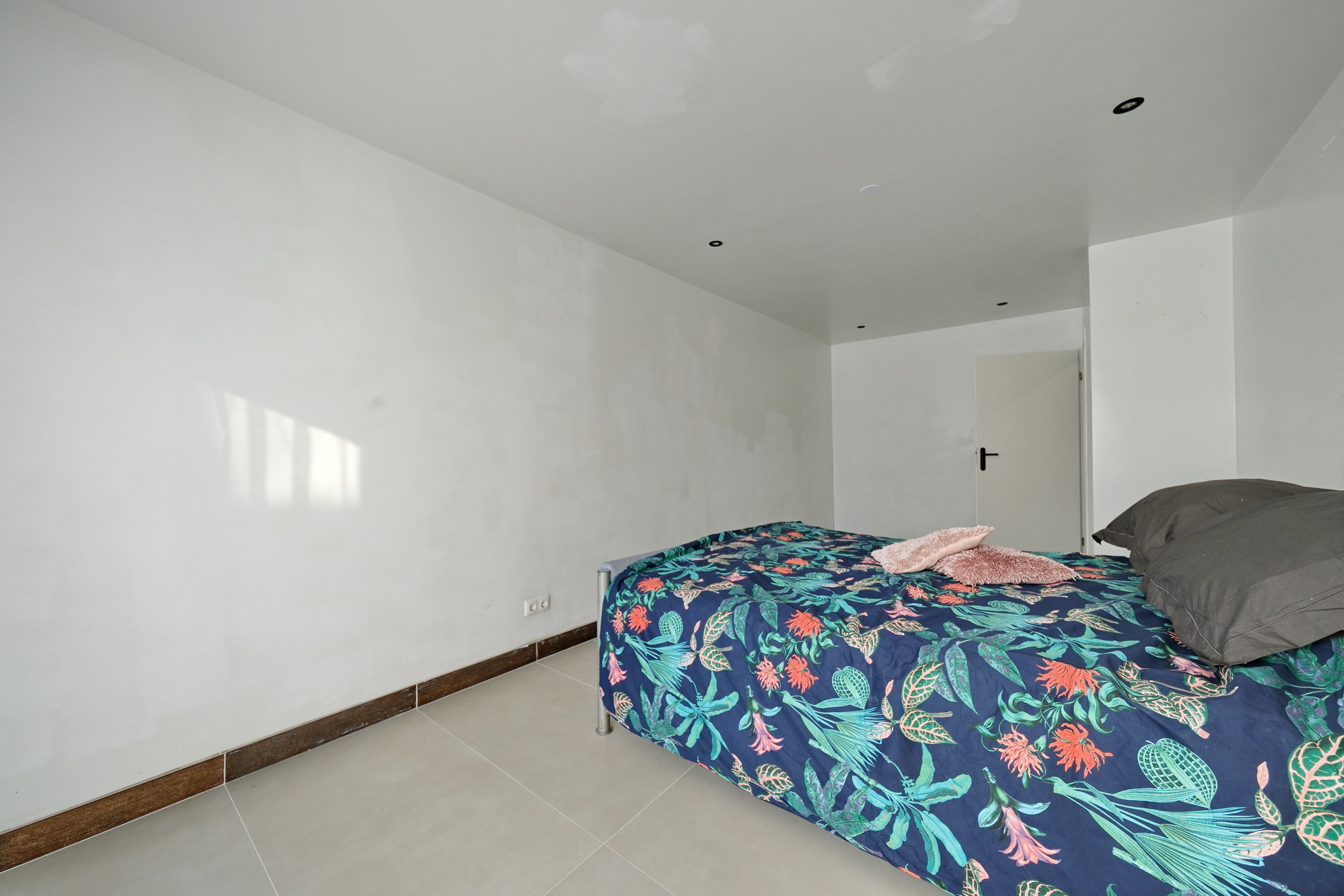 De slaapkamer ligt aan de zijkant van het huis en beschikt over een badkamer en-suite met inloopdouche, wastafelmeubel en een tweede toilet. Ook hier is vloerverwarming aanwezig.