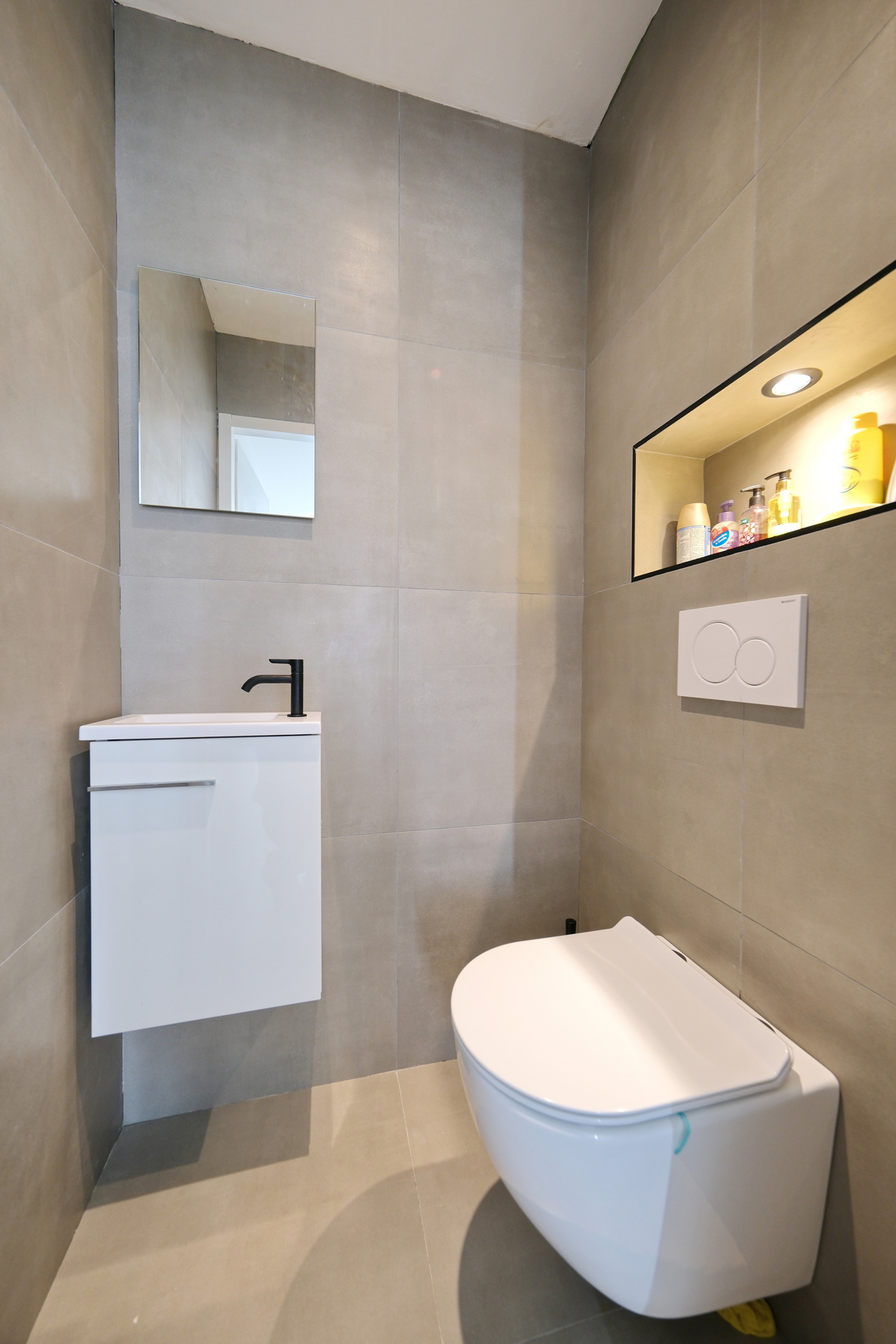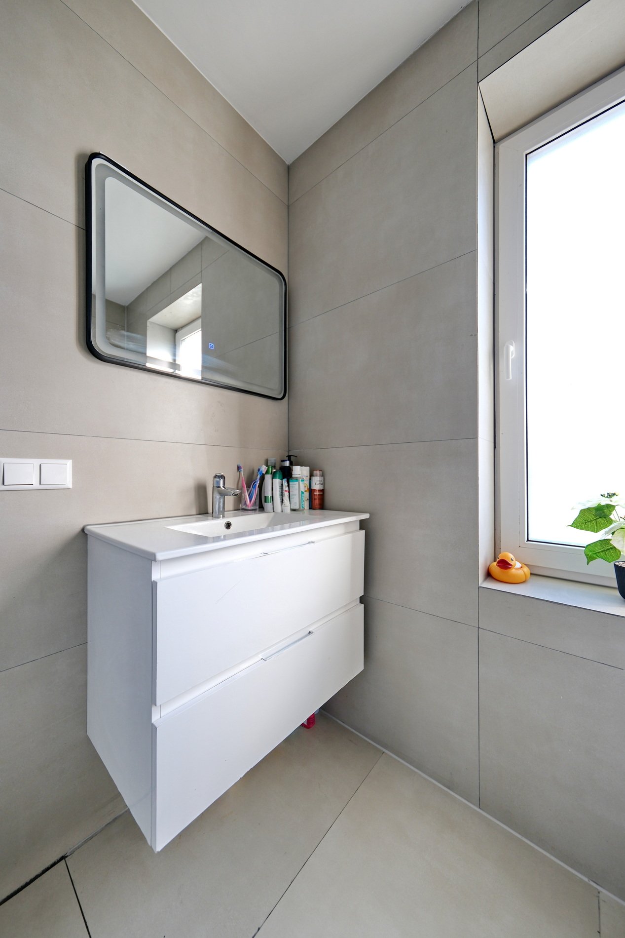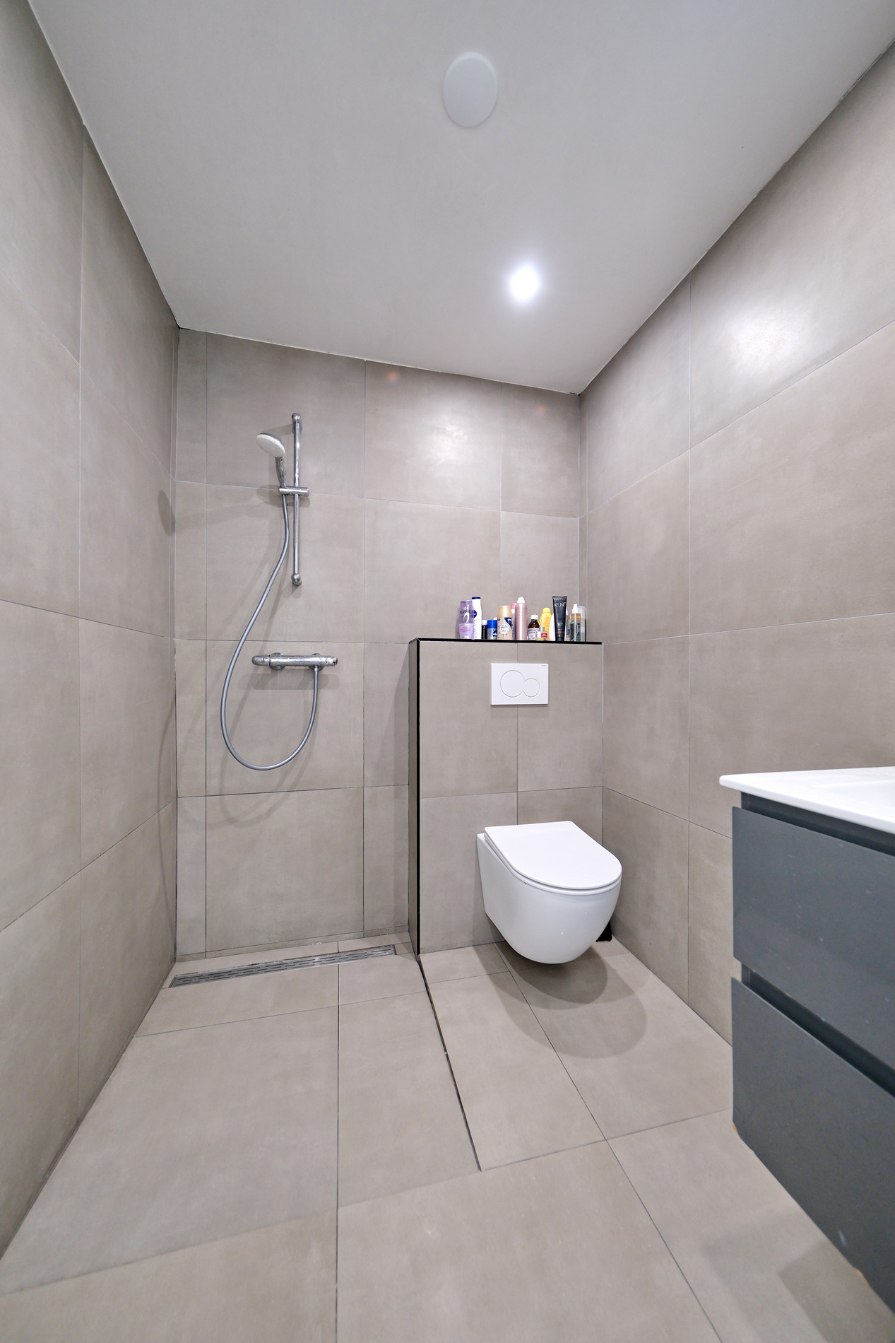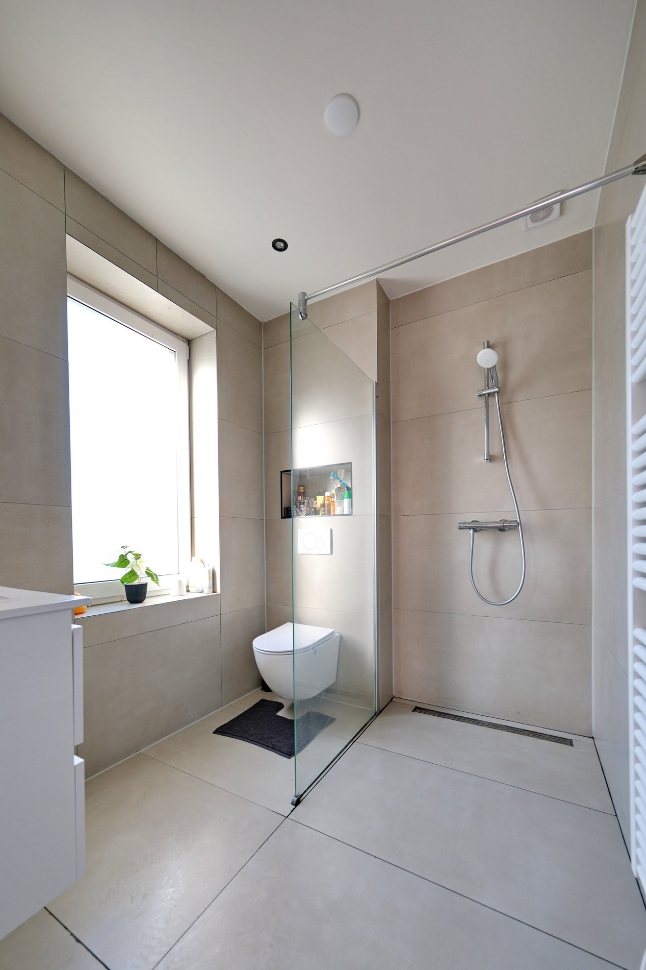 Deze badkamer is voorzien van een inloopdouche, wastafelmeubel, derde toilet, mechanische ventilatie en een raam voor daglicht.