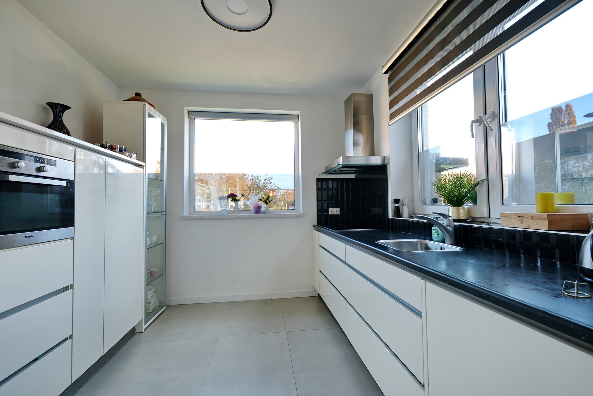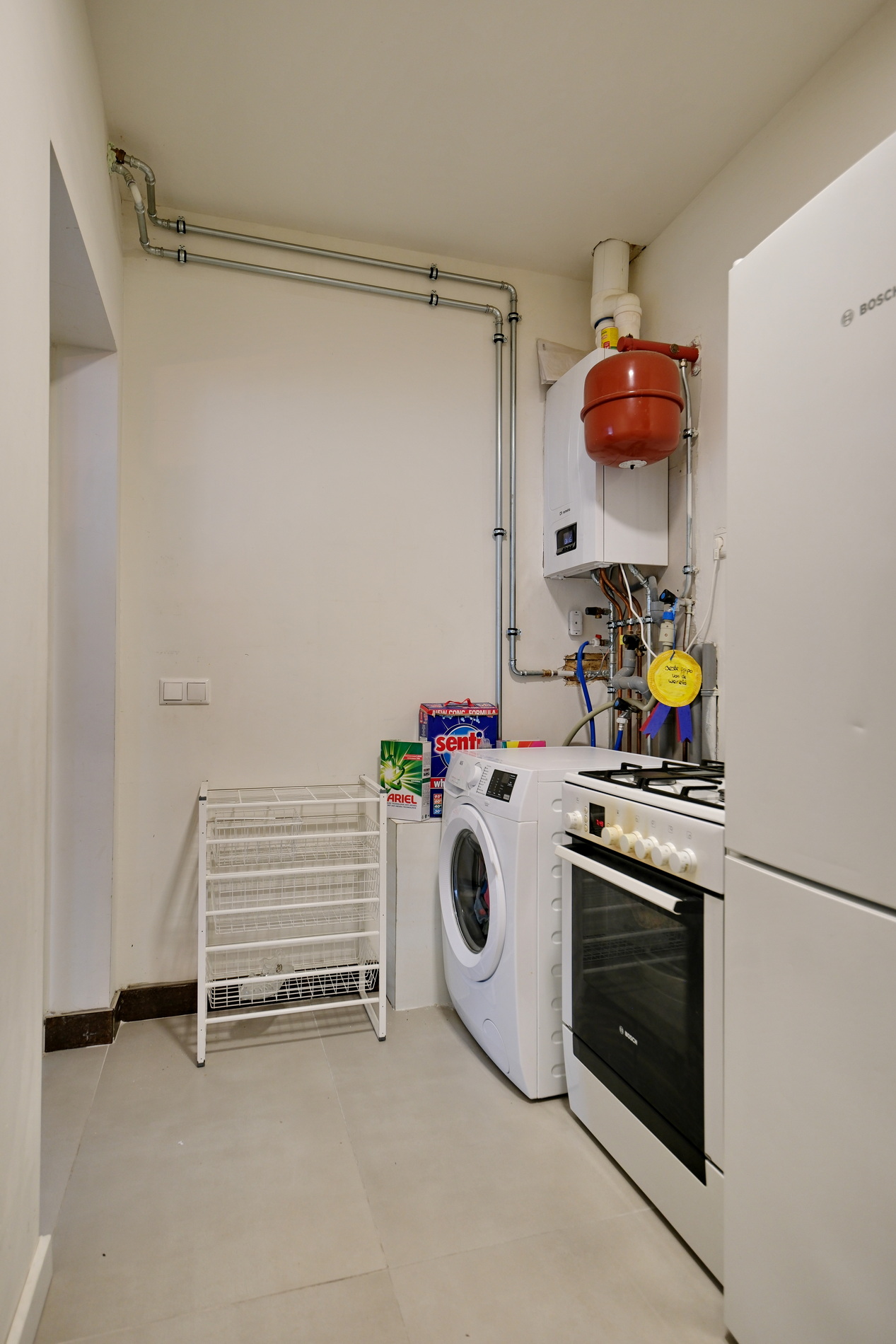 Aansluitend bevindt zich de bijkeuken met aansluiting voor wasapparatuur, de opstelling van de CV-ketel en toegang tot de berging.