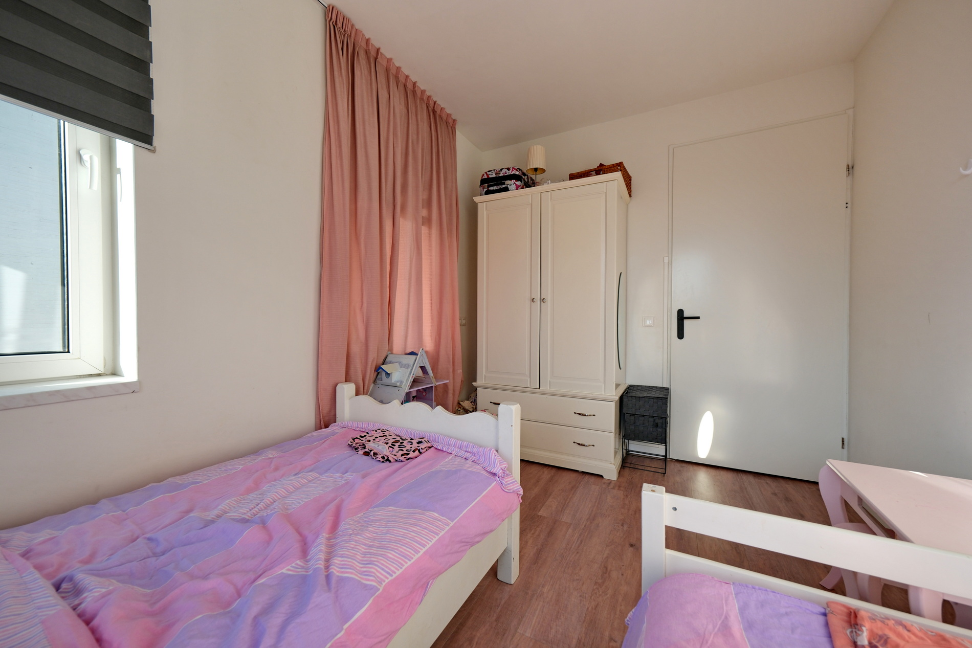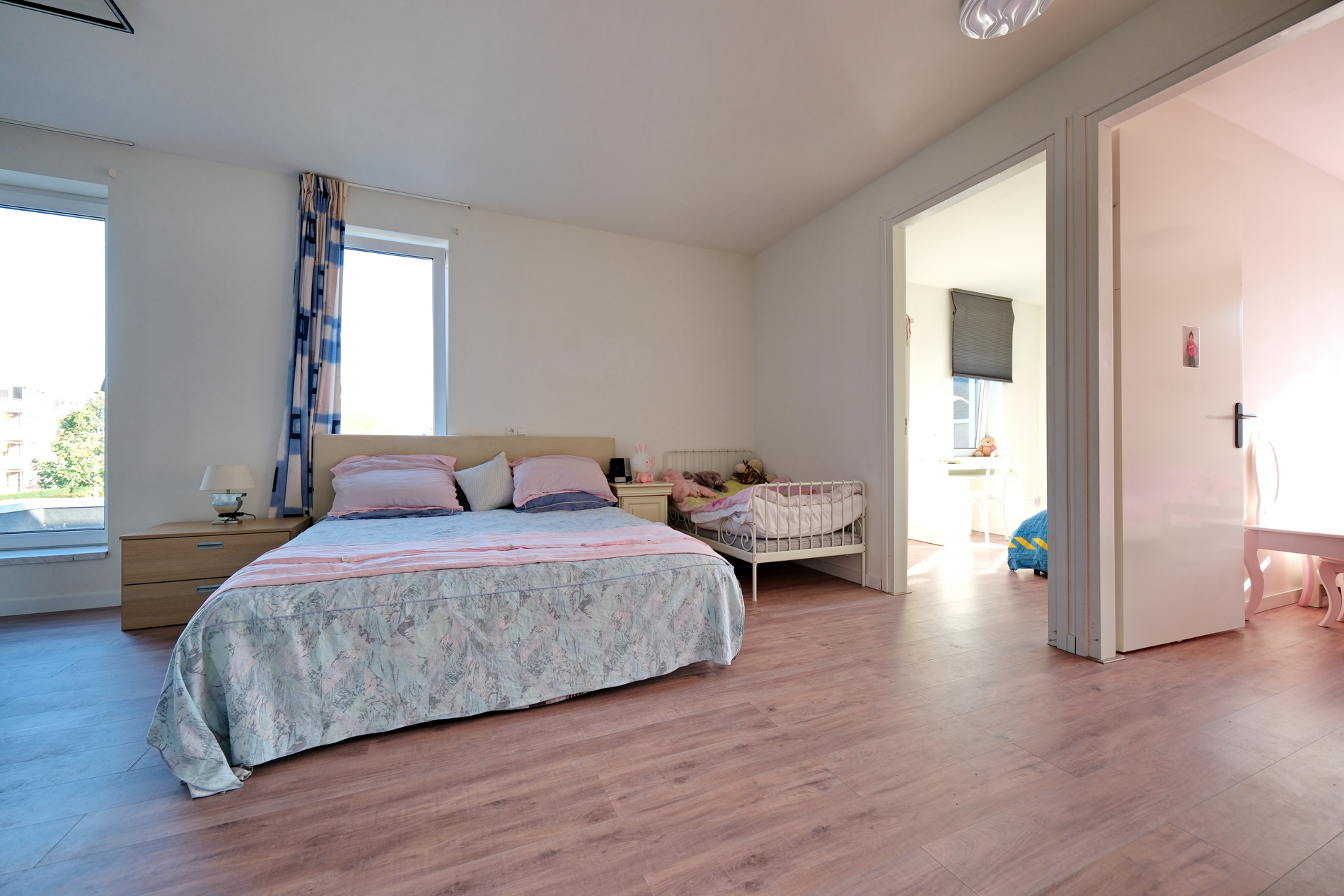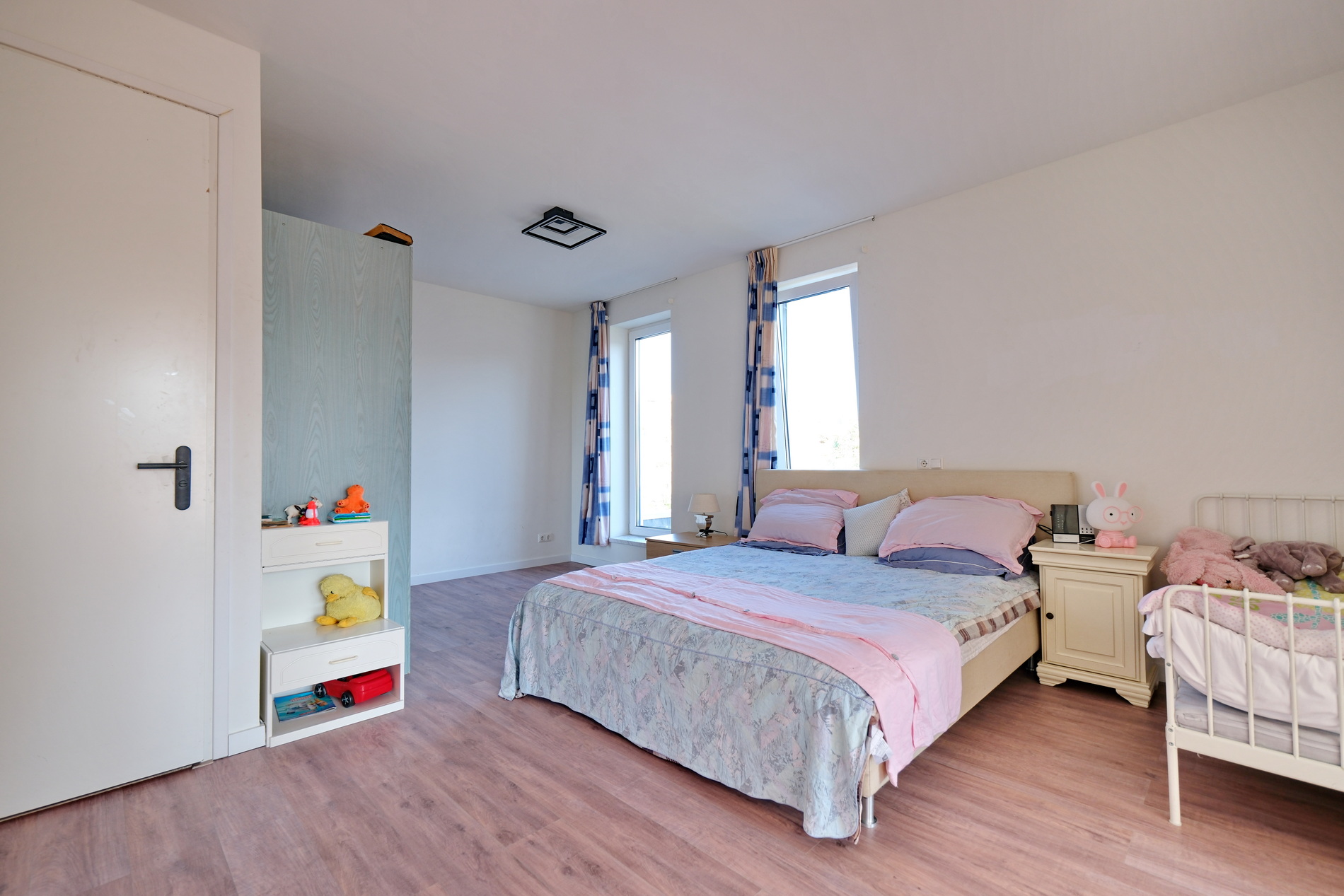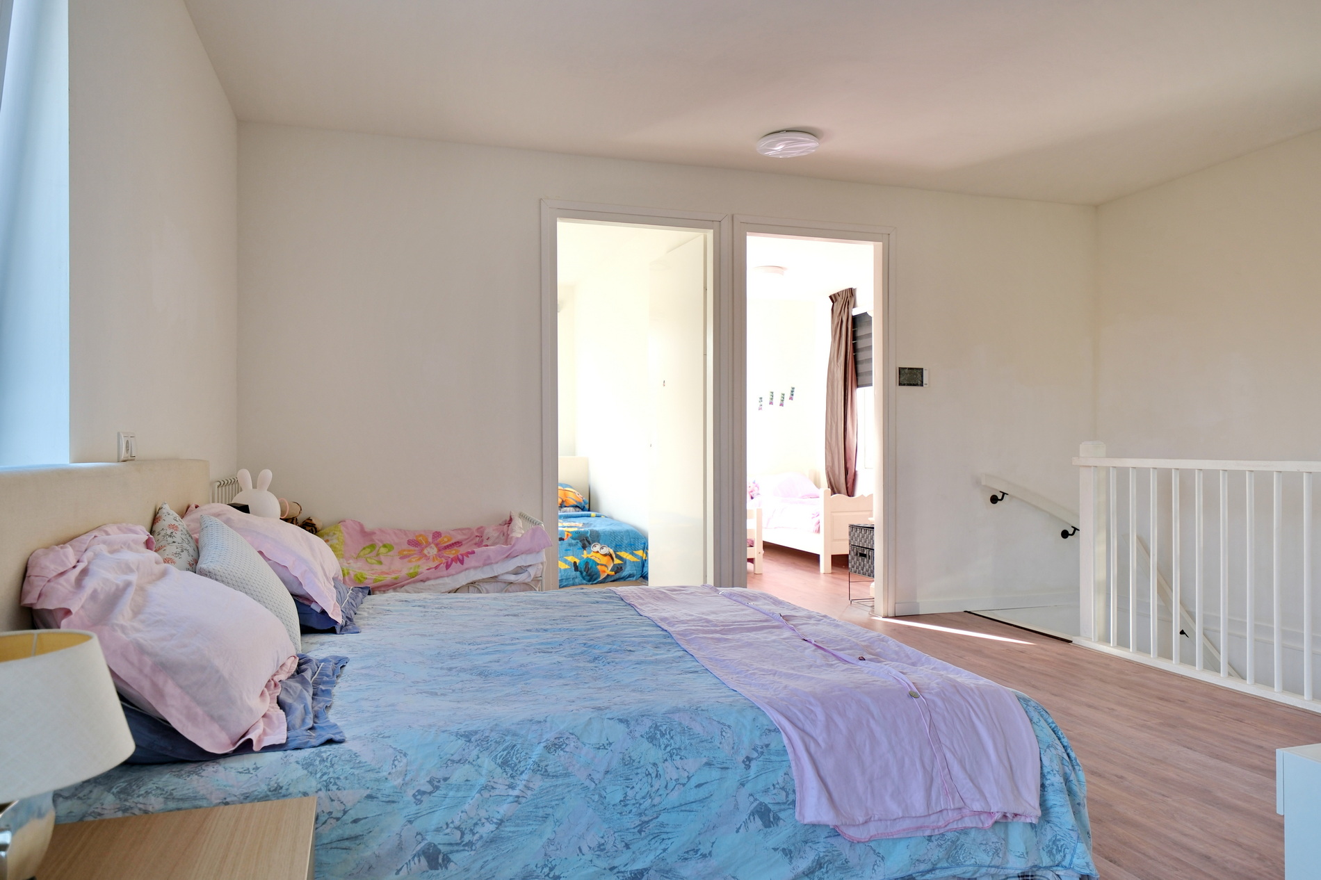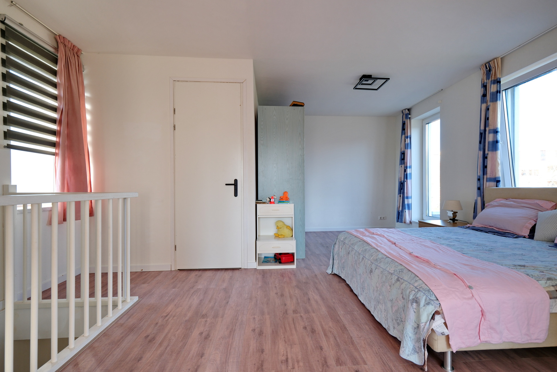 De overloop is extra ruim en momenteel ingericht als logeerruimte.